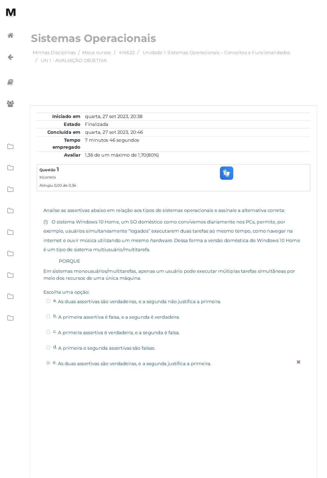 05/10/2023, 23:25 UN 1 - AVALIAÇÃO OBJETIVA: Revisão da tentativa https://avap.multivix.edu.br/mod/quiz/review.php?attempt=3981184&cmid=1525157 1/5 Minhas Disciplinas / Meus cursos / 414622 / Unidade 1: Sistemas Operacionais – Conceitos e Funcionalidades / UN 1 - AVALIAÇÃO OBJETIVA Sistemas Operacionais Iniciado em quarta, 27 set 2023, 20:38 Estado Finalizada Concluída em quarta, 27 set 2023, 20:46 Tempo empregado 7 minutos 46 segundos Avaliar 1,36 de um máximo de 1,70(80%) Questão 1 Incorreto Atingiu 0,00 de 0,34 Analise as assertivas abaixo em relação aos tipos de sistemas operacionais e assinale a alternativa correta: (1) O sistema Windows 10 Home, um SO doméstico como convivemos diariamente nos PCs, permite, por exemplo, usuários simultaneamente “logados” executarem duas tarefas ao mesmo tempo, como navegar na internet e ouvir música utilizando um mesmo hardware. Dessa forma a versão doméstica do Windows 10 Home é um tipo de sistema multiusuário/multitarefa. PORQUE Em sistemas monousuários/multitarefas, apenas um usuário pode executar múltiplas tarefas simultâneas por meio dos recursos de uma única máquina. Escolha uma opção: a. As duas assertivas são verdadeiras, e a segunda não justi�ca a primeira. b. A primeira assertiva é falsa, e a segunda é verdadeira. c. A primeira assertiva é verdadeira, e a segunda é falsa. d. A primeira e segunda assertivas são falsas. e. As duas assertivas são verdadeiras, e a segunda justi�ca a primeira. https://avap.multivix.edu.br/my/ https://avap.multivix.edu.br/course/view.php?id=23730 https://avap.multivix.edu.br/course/view.php?id=23730§ion=2 https://avap.multivix.edu.br/mod/quiz/view.php?id=1525157 https://avap.multivix.edu.br/my/ https://avap.multivix.edu.br/course/view.php?id=23730 https://avap.multivix.edu.br/user/index.php?id=23730 https://avap.multivix.edu.br/course/view.php?id=23730§ion=1 https://avap.multivix.edu.br/course/view.php?id=23730§ion=2 https://avap.multivix.edu.br/course/view.php?id=23730§ion=3 https://avap.multivix.edu.br/course/view.php?id=23730§ion=4 https://avap.multivix.edu.br/course/view.php?id=23730§ion=5 https://avap.multivix.edu.br/course/view.php?id=23730§ion=6 https://avap.multivix.edu.br/course/view.php?id=23730§ion=7 https://avap.multivix.edu.br/course/view.php?id=23730§ion=8 https://avap.multivix.edu.br/course/view.php?id=23730§ion=9 https://avap.multivix.edu.br/course/view.php?id=23730§ion=10 https://avap.multivix.edu.br/ https://avap.multivix.edu.br/ https://avap.multivix.edu.br/ https://avap.multivix.edu.br/ https://avap.multivix.edu.br/ https://avap.multivix.edu.br/ 05/10/2023, 23:25 UN 1 - AVALIAÇÃO OBJETIVA: Revisão da tentativa https://avap.multivix.edu.br/mod/quiz/review.php?attempt=3981184&cmid=1525157 2/5 Questão 2 Correto Atingiu 0,34 de 0,34 Analise as a�rmativas sobre os conceitos de sistemas operacionais. I. Podemos a�rmar que processo é um conjunto de ações em sequência executadas para um objetivo esperado. II. Na arquitetura monolítica, os componentes estão dentro do kernel, e na arquitetura micronúcleo, em módulos pequenos de forma escalável. III. Sobre linguagem de baixo nível, os montadores fazem a tradução para linguagem de máquina, enquanto os ligadores são responsáveis por juntar partes que compõem um programa. Já os carregadores têm o papel de realizar o transporte de um programa para a memória principal. Assinale qual alternativa apresenta a(s) a�rmativa(s) verdadeira(s). Escolha uma opção: a. I e II. b. II e III. c. I e III. d. I e II e III. e. II. https://avap.multivix.edu.br/my/ https://avap.multivix.edu.br/course/view.php?id=23730 https://avap.multivix.edu.br/user/index.php?id=23730 https://avap.multivix.edu.br/course/view.php?id=23730§ion=1 https://avap.multivix.edu.br/course/view.php?id=23730§ion=2 https://avap.multivix.edu.br/course/view.php?id=23730§ion=3 https://avap.multivix.edu.br/course/view.php?id=23730§ion=4 https://avap.multivix.edu.br/course/view.php?id=23730§ion=5 https://avap.multivix.edu.br/course/view.php?id=23730§ion=6 https://avap.multivix.edu.br/course/view.php?id=23730§ion=7 https://avap.multivix.edu.br/course/view.php?id=23730§ion=8 https://avap.multivix.edu.br/course/view.php?id=23730§ion=9 https://avap.multivix.edu.br/course/view.php?id=23730§ion=10 https://avap.multivix.edu.br/ https://avap.multivix.edu.br/ https://avap.multivix.edu.br/ https://avap.multivix.edu.br/ https://avap.multivix.edu.br/ https://avap.multivix.edu.br/ 05/10/2023, 23:25 UN 1 - AVALIAÇÃO OBJETIVA: Revisão da tentativa https://avap.multivix.edu.br/mod/quiz/review.php?attempt=3981184&cmid=1525157 3/5 Questão 3 Correto Atingiu 0,34 de 0,34 Analise as a�rmativas sobre arquiteturas de sistemas operacionais. I. A arquitetura monolítica dispõe os componentes do sistema operacional interno ao kernel, apresentando-se e�ciente com a comunicação entre os componentes de forma direta. Sua desvantagem é a identi�cação de problemas devido a todos os componentes estarem internos ao núcleo do sistema operacional. II. O sistema Technische Hogeschool Eindhoven (THE) é um exemplo de sistema com arquitetura em camadas. Em tal arquitetura, o sistema é dividido em módulos pequenos de forma escalável, sendo apenas o módulo micronúcleo executado como um núcleo, ou seja, um kernel. Por esse fato, a arquitetura em camadas se difere da arquitetura micronúcleo. III. Na arquitetura em camadas de um sistema operacional, os componentes são agrupados por tarefas parecidas. Uma camada fornece serviços à camada superior e faz comunicação com as adjacentes, tanto superiores como inferiores. Assinale qual alternativa apresenta a(s) a�rmativa(s) verdadeira(s). Escolha uma opção: a. I e II. b. I e II e III. c. I e III. d. II e III. https://avap.multivix.edu.br/my/ https://avap.multivix.edu.br/course/view.php?id=23730 https://avap.multivix.edu.br/user/index.php?id=23730 https://avap.multivix.edu.br/course/