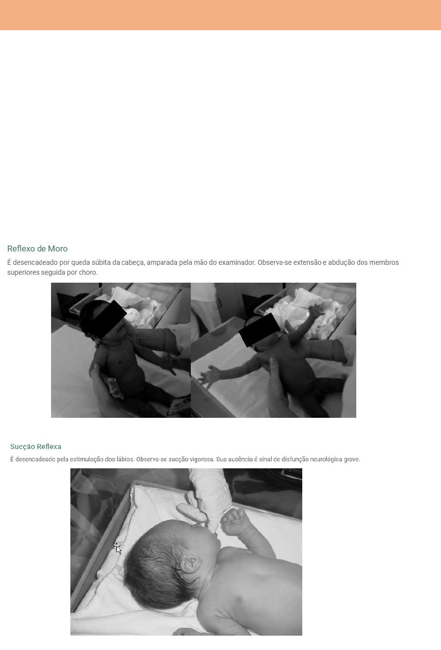 REFLEXOS PRIMITIVOS Os reflexos primitivos são respostas automáticas e estereotipadas a um determinado estímulo externo. Estão presentes ao nascimento mas devem ser inibidos ao longo dos primeiros meses, quando surgem os reflexos posturais. Sua presença mostra integridade do sistema nervoso central; entretanto, sua persistência mostra disfunção neurológica. De modo geral, a sucção reflexa e a marcha reflexa desaparecem por volta dos dois meses de vida. Os outros reflexos arcaicos devem desaparecer até no máximo 6 meses de idade, exceto os dois reflexos dos pés. A preensão plantar desaparece aos 9 meses. Já o reflexo cutâneo-plantar é em extensão no primeiro semestre de vida. No segundo semestre pode ser em flexão, indiferente ou em extensão. A partir da aquisição da marcha independente, deve ser sempre em flexão. Desaparece por volta dos 3 meses de idade. dura cerca de 4 meses. REFLEXO TÔNICO CERVICAL ASSIMÉTRICO – com o bebê deitado, a mãe gira a cabeça do bebê para a direita ou para a esquerda e ele tende a estender o braço do mesmo lado que a cabeça e a dobrar o outro braço. Também chamado reflexo do esgrimista, costuma desaparecer durante o quinto mês. Às vezes, o bebê adota essa posição espontáneamente desaparece aproximadamente aos 2-4 meses. Deixa de ocorrer em torno dos 3 meses MARCHA REFLEXA desaparece por volta dos 9-12 meses de idade. dura até os 2-3 meses de idade. desaparece aos 2 meses REFLEXO DE PROPULSÃO OU REPTAÇÃO – consiste no deslocamento para frente, quando o bebê é colocado de braços e tem apoio no dorso dos pés. Ou seja, o recém-nascido tem o reflexo de rastejar quando estimulado. Desaparece em três meses. O sinal de Babinski – ou reflexo cutâneo-plantar extensor ➢ Extensão dorsal do hálux ao estímulo ascendente na parte lateral para medial da região plantar.” >>>>> NORMAL em BEBES. ➢ ADULTO >>>> Em indivíduos normais, ocorre flexão plantar, isto é, o hálux é “fletido para frente”, enquanto em indivíduos com lesão do trato corticoespinhal, ocorre a extensão dorsal – extensão do hálux. sucção, rotação (buscar o mamilo) e o reflexo de Moro (resposta a um susto ou quando o bebê começa a cair), estão relacionados a necessidades instintivas por sobrevivência e proteção, ou talvez sustentem a ligação inicial com o cuidador À medida que os centros superiores do cérebro tornam-se ativos entre o segundo e o quarto mês de vida, os bebês começam a exibir reflexos posturais: O desaparecimento, em determinado momento, de reflexos desnecessários é sinal de que as vias motoras no córtex foram parcialmente mielinizadas, permitindo a passagem para o comportamento voluntário Bibliografia: ➢ Faculdade de Ciencias Medicas, Unicamp Neurologia infantil, Reflexos primitivos ➢ Sanarflix Reflexos Primitivos e desenvolvimento.
