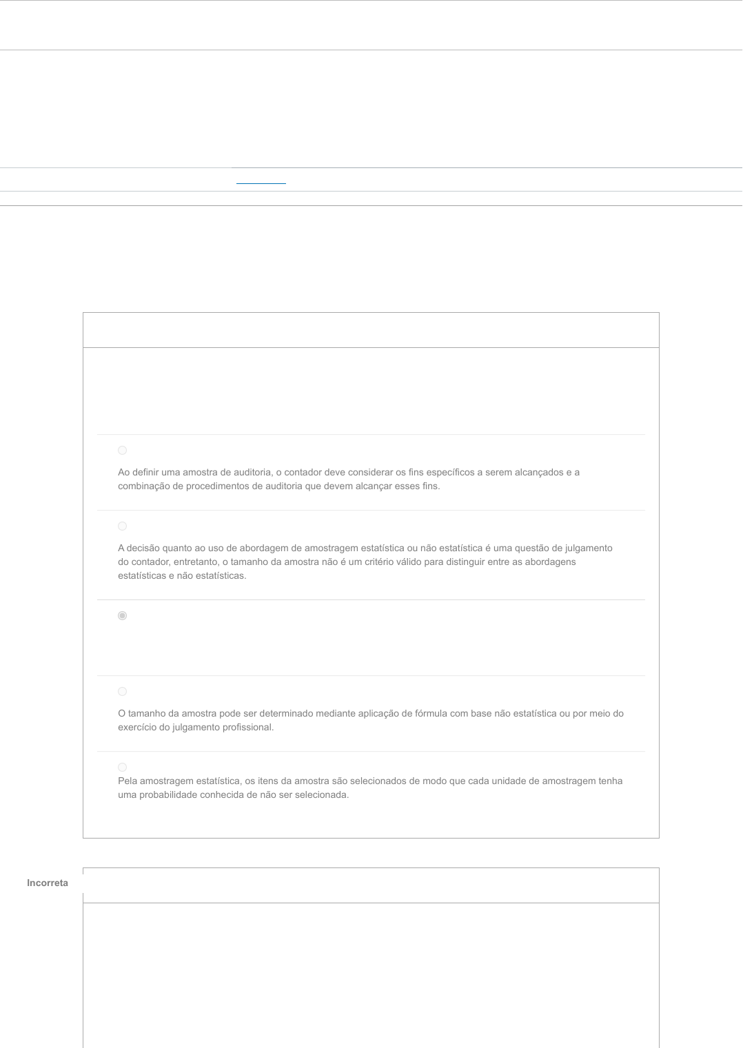 06/10/2023, 10:40 Tarefa Objetiva 3: Auditoria, Riscos e Compliance - 2023/2 https://pucminas.instructure.com/courses/170589/quizzes/407404 1/13 Tarefa Objetiva 3 Entrega 17 set em 23:59 Pontos 5 Perguntas 24 Disponível 3 ago em 0:00 - 17 set em 23:59 Limite de tempo Nenhum Este teste foi travado 17 set em 23:59. Histórico de tentativas Tentativa Tempo Pontuação MAIS RECENTE Tentativa 1 49 minutos 2,8 de 5 As respostas corretas não estão mais disponíveis. Pontuação deste teste: 2,8 de 5 Enviado 12 set em 13:39 Esta tentativa levou 49 minutos. 0,1 / 0,1 ptsPergunta 1 A amostragem de auditoria permite que o auditor obtenha e avalie a evidência de auditoria em relação a algumas características dos itens selecionados de modo a concluir ou ajudar a concluir, sobre a população da qual a amostra é retirada. Sobre a amostragem é CORRETO afirmar: Ao definir uma amostra de auditoria, o contador deve considerar os fins específicos a serem alcançados e a combinação de procedimentos de auditoria que devem alcançar esses fins. A decisão quanto ao uso de abordagem de amostragem estatística ou não estatística é uma questão de julgamento do contador, entretanto, o tamanho da amostra não é um critério válido para distinguir entre as abordagens estatísticas e não estatísticas. A amostragem em auditoria pode ser aplicada usando tanto a abordagem de amostragem não estatística como a estatística. O tamanho da amostra pode ser determinado mediante aplicação de fórmula com base não estatística ou por meio do exercício do julgamento profissional. Pela amostragem estatística, os itens da amostra são selecionados de modo que cada unidade de amostragem tenha uma probabilidade conhecida de não ser selecionada. 0 / 0,2 ptsPergunta 2IncorretaIncorreta NBC TA 700 – Formação da Opinião e Emissão do Relatório do Auditor Independente sobre as Demonstrações Contábeis. Essa Norma trata da responsabilidade do auditor independente para formar uma opinião sobre as demonstrações contábeis e trata da forma e do conteúdo do relatório emitido como resultado da auditoria de demonstrações contábeis. Considerando essa norma, avalie os itens abaixo: I. Demonstrações contábeis para fins gerais são demonstrações contábeis elaboradas de acordo com uma https://pucminas.instructure.com/courses/170589/quizzes/407404/history?version=1 06/10/2023, 10:40 Tarefa Objetiva 3: Auditoria, Riscos e Compliance - 2023/2 https://pucminas.instructure.com/courses/170589/quizzes/407404 2/13 estrutura de relatório financeiro para fins gerais. II. Estrutura de relatório financeiro para fins gerais é a estrutura de relatório financeiro elaborada para satisfazer as necessidades de informações financeiras comuns de uma ampla gama de usuários. A estrutura de relatório financeiro pode ser uma estrutura de apresentação adequada ou uma estrutura de conformidade. III. Opinião não modificada ou sem modificações é a opinião expressa pelo auditor quando ele conclui que as demonstrações contábeis são elaboradas, em todos os aspectos relevantes, de acordo com a estrutura de relatório financeiro aplicável . IV. O auditor deve formar sua opinião sobre se as demonstrações contábeis são elaboradas, em todos os aspectos relevantes, de acordo com a estrutura de relatório financeiro aplicável. V. O auditor deve avaliar se as demonstrações contábeis são elaboradas, em todos os aspectos relevantes, de acordo com os requisitos da estrutura de relatório financeiro aplicável. Essa avaliação deve incluir a consideração dos aspectos qualitativos das práticas contábeis da entidade, incluindo indicadores de possível tendenciosidade nos julgamentos da administração. Indique a alternativa CORRETA: Apenas o item I é verdadeiro. Apenas os itens III e IV são falsos. Todos os itens são falsos. Apenas os itens I, II e V são verdadeiros. Todos os itens são verdadeiros 0,2 / 0,2 ptsPergunta 3 Planejamento não é uma fase isolada da auditoria, mas um processo contínuo e iterativo, que muitas vezes começa logo após (ou em conexão com) a conclusão da auditoria anterior, continuando até a conclusão do trabalho de auditoria atual. Entretanto, o planejamento inclui a consideração da época de certas atividades e procedimentos de auditoria que devem ser concluídos antes da realização de procedimentos adicionais de auditoria. Por exemplo, o planejamento inclui a necessidade de considerar, antes da identificação e avaliação pelo auditor dos riscos de distorções relevantes, aspectos como: A aplicação de outros procedimentos de avaliação de procedimentos. Obtenção de entendimento global da estrutura jurídica e o ambiente regulatório aplicável à entidade e como a entidade cumpre com os requerimentos dessa estrutura. A determinação da imaterialidade. O envolvimento de funcionários da entidade. Os procedimentos analíticos a serem aplicados como procedimentos de avaliação de relevância. 0,2 / 0,2 ptsPergunta 4 A norma NBC TA 230 – Documentação de Auditoria trata da responsabilidade do auditor na elaboração da documentação de auditoria para a auditoria das demonstrações contábeis. O Apêndice relaciona outras normas 06/10/2023, 10:40 Tarefa Objetiva 3: Auditoria, Riscos e Compliance - 2023/2 https://pucminas.instructure.com/courses/170589/quizzes/407404 3/13 que contêm exigências de documentação e orientações específicas. As exigências específicas de documentação de outras normas não limitam a aplicação dessa Norma. Leis ou regulamentos podem estabelecer exigências adicionais de documentação. Considerando essa norma, avalie os itens abaixo e responda: I. Documentação de auditoria é o registro dos procedimentos de auditoria executados, da evidência de auditoria relevante obtida e conclusões alcançadas pelo auditor (usualmente também é utilizada a expressão “papéis de trabalho”). II. Arquivo de auditoria compreende 
