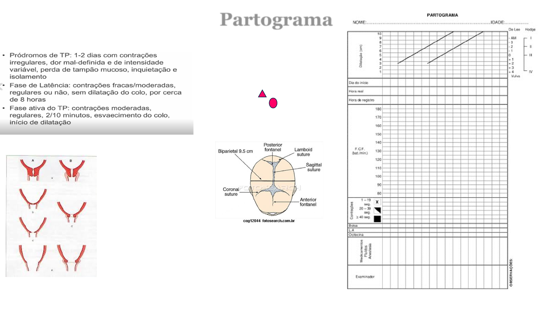 Partograma Atenção!!! Nulíparas: Apagamento/ dilatação 1cm/ h Multíparas: Apagamento = dilatação 1,5 cm/h • Ministério da saúde. • Linha de alerta • Linha de ação • FC • Contrações • Dilatação • Plano DE LEE • Membranas ovulares • Medicamentos Zona 1: melhor observação clínica ( TP evoluir) Zona 2 Zona 3: necessita de intervenção médica Zona 2 e 3: podem representar anormalidades de evolução da fase ativa Distocias do parto ➢ Fase latente prolongada: dilatação cervical menor que ¾ cm apesar do tempo excessivo de contrações dolorosas e regulares . Definida como duração maior que 20 hs em primíparas e 14 hs em multíparas. ➢ Fase ativa prolongada ou distocia funcional primária: dilatação cervical menor que 1 cm/hora (ultrapasse a linha de alerta) decorrente de discinesias uterinas. ➢ Parada secundária da dilatação: dilatação cervical mantida, diagnosticada por dois toques sucessivos, com intervalo de duas horas seguidas em paciente na fase ativa do parto. (Desproporção cefalopélvica ou alteração da posição da apresentação fetal ➢ Período pélvico prolongado: descida progressiva, mas excessivamente lenta no período expulsivo, ( contratilidade diminuída ou desproporção cefalopélvica relativa) ➢ Parada secundária da descida: diagnosticada por dois toques sucessivos com intervalo de pelo menos uma hora, desde que a dilatação esteja completa( desproporção ou alteração da posição da apresentação fetal) ➢ Parto precipitado ou taquitócito: dilatação, descida e expulsão do feto que ocorrem num período de 4 horas ou menos Caso clinico Parada secundária da descida: diagnosticada por dois toques sucessivos com intervalo de pelo menos uma hora, desde que a dilatação esteja completa( desproporção ou alteração da posição da apresentação fetal) Parto precipitado ou taquitócito: dilatação, descida e expulsão do feto que ocorrem num período de 4 horas ou menos ➢ 17 h: bcf 150 ➢ 18h: BCF: 138bpm AU: 3/40/10 Ao toque colo 7cm de dilatação ,80% apagado, cefálico, plano +2 DE LEE ➢ As 19 horas, paciente relata dor de grande intensidade Ao exame: 9cm, +3 DE LEE, 100% apagado, AU 5/40/10 ➢ 20: 15: paciente evoluiu para parto normal, sem episiotomia e/ou laceração RN vivo, único, sexo feminino, chorou ao nascer, avaliado pelo pediatra, apresentou contato pele a pele com a mãe, logo em seguida ao parto. Dequitação completa da placenta, sangramento fisiológico. Slide 1 Slide 2 Slide 3