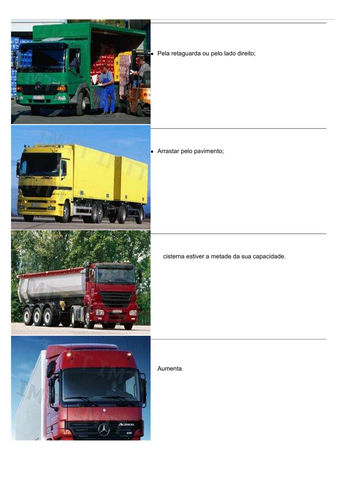 A carga e descarga de um automóvel pesado de mercadorias estacionado do lado direito da faixa de rodagem, deve efectuar-se: � Pela retaguarda ou pelo lado direito; � Pela retaguarda ou pelo lado esquerdo; � Pelo lado direito ou pelo lado esquerdo. � A carga transportada num automóvel pesado de mercadorias, não deve: � Arrastar pelo pavimento; � Exceder 3 metros de altura, a contar do solo, nem arrastar pelo pavimento. � Exceder 3 metros de altura, a contar do solo; � A condução de um veículo cisterna é mais exigente, se: � A cisterna estiver a metade da sua capacidade. � A cisterna estiver cheia; � A cisterna estiver vazia; � A distância de paragem de um veículo em circulação, quando carregado: � Aumenta, somente nas descidas; � Aumenta. � Diminui, excepto nas descidas; � Growing Realce Growing Realce Growing Realce Growing Realce Growing Realce A força centrifuga, no caso de um tractor com semi- reboque que descreve uma curva a 50 Km/h, tende a: � Aumentar com a diminuição do ângulo de curvatura da respectiva curva; � Aumentar com o aumento do ângulo de curvatura da respectiva curva; � Diminuir com a diminuição do ângulo de curvatura da respectiva curva. � A largura máxima admissível para um reboque de três eixos, é: � 2.50 metros; � 2.55 metros; � 2.65 metros. � A largura máxima admissível para um veículo pesado de mercadorias, é: � 2.50 metros; � 2.55 metros; � 2.60 metros. � A largura máxima de um veículo equipado com caixa frigorífica para transporte de mercadorias, é: � 2,40 metros; � 2,50 metros; � 2,60 metros. � Growing Realce Growing Realce Growing Realce Growing Realce Growing Realce A ligação física de tracção entre um veículo tractor pesado e um semi-reboque destinados ao transporte rodoviário de mercadorias, é feito através de: � Prato e cavilha de engate. � Veio ou árvore de transmissão, com auxilio de tubagens pneumáticas; � Veio ou árvore de transmissão; � Ao bascular a cabina avançada de um automóvel pesado de mercadorias, o operador deve certificar-se: � Da boa qualidade do pavimento, por forma a evitar que a cabina embata no solo; � Da eventual existência de objectos soltos, uma vez que o motor deve permanecer em funcionamento; � De que no espaço em frente ao veículo não se encontra qualquer pessoa ou objecto de volume considerável; � Ao carregar um veículo, onde devem colocar-se os objectos mais pesados? � A meio da caixa de carga. � O mais à frente da caixa de carga; � O mais à retaguarda da caixa de carga; � Ao iniciar um transporte de mercadorias em automóvel pesado, o condutor detecta que o automóvel está excessivamente carregado. Deve: � Efectuar o transporte a velocidade moderada, já que o excesso de carga não é susceptível de afectar a segurança do transporte. � Efectuar o transporte, já que a responsabilidade pelo excesso de carga é do transportador; � Promover que seja retirada do veículo a carga em excesso; � Growing Realce Growing Realce Growing Realce Growing Realce Growing Realce Growing Realce As operações de carga e descarga dos veículos pesados de mercadorias, podem ser efectuadas pelo lado esquerdo do veículo? � Não, nunca. � Não, salvo nos casos em que o veículo está estacionado do lado direito da faixa de rodagem. � Sim. Se for permitido o estacionamento do lado esquerdo da faixa de rodagem; � Durante o transporte de congelados, vigiar a temperatura do transporte é da responsabilidade: � Do condutor; � Do destinatário da mercadoria, já que o condutor não controla o sistema frigorifico; � Dos técnicos das inspecções económicas. � Durante o transporte de matérias pulverulentas em automóvel pesado, o condutor deve assegurar-se de que: � A mercadoria transportada não se espalha pela caixa de carga do veículo; � A mercadoria transportada não se espalha pelo ar e pela faixa de rodagem; � O peso da mercadoria transportada não excede a tara do veículo. � Durante o transporte de mercadorias em automóveis pesados, as condições de amarração da carga devem ser vigiadas: � Pelas polícias; � Pelo condutor; � Pelo destinatário das mercadorias. � Growing Realce Growing Realce Growing Realce Growing Realce Durante o transporte de mercadorias em automóveis pesados, garantir que as mesmas se mantenham em perfeitas condições, é da responsabilidade: � Do condutor; � Do destinatário e do condutor. � Do destinatário; � Durante o transporte de mercadorias em automóvel pesado e em contentores, quem deve verificar da estabilidade dos contentores? � O condutor; � O destinatário das mercadorias, já que deve sempre acompanhar e controlar o transporte. � O proprietário das mercadorias, já que o condutor somente é responsável pelo veículo; � Durante o transporte de mercadorias em automóvel pesado, o condutor é responsável por garantir que: � Não seja excedido o peso total de 3.500 Kg. � O transporte se faz o mais rápido possível, com prejuízo dos limites estabelecidos quanto aos tempos máximos de condução; � O veículo circule com a pressão de ar adequada nos pneus; � Durante o transporte em automóvel pesado de mercadorias de uma mercadoria sujeita a amarração por fitas, quem deve vigiar o estado das amarrações? � O condutor; � O destinatário das mercadorias; � O proprietário das mercadorias, quando pessoa diversa do condutor. � Growing Realce Growing Realce Growing Realce Growing Realce Durante o transporte rodoviário de mercadorias em automóvel pesado, a falta da correspondente guia de transporte, constitui infracção imputável: � Ao condutor, desde que o automóvel e a respectiva carga sejam de sua propriedade; � Ao destinatário, desde que o automóvel e a respectiva carga sejam propriedade do condutor. � Ao expedidor, desde que o automóvel e a respectiva carga sejam propriedade do 