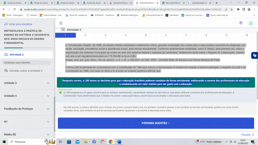 Unidade 2- Metodologias para o ensino de história e fundamentos da geografia Atividade 2 1- A “Constituição Cidadã”, de 1988, irá ampliar direitos existentes e determinar outros, gerando a elevação dos custos para o setor público (aumento de despesas com saúde, educação, previdência social e assistência social), pelo menos textualmente. Conforme anteriormente enfatizado, esta CF dispôs, pela primeira vez, sobre a organização dos sistemas municipais de ensino ao lado dos sistemas federal e estadual (já existentes), deliberando ainda sobre o Regime de Colaboração, matéria que veio a ser regulamentada pela Lei n° 9.394/96 (a nova LDB). Ensaio: aval. pol. públ. Educ., Rio de Janeiro, v.12, n.45, p. 925-944, out./dez. 2004 - Donaldo Bello de Souza e Lia Ciomar Macedo de Faria A Nova LDB foi pensada em consonância com a Constituição de 1988 que marcou a estruturação do Estado em relação à redemocratização. A respeito da LDB e da Constituição de 1988, com base no texto e no e-book da unidade podemos afirmar que: R: A LDB estabeleceu um gasto mínimo 2- A discussão da paisagem é um tema antigo na geografia. Desde o século XIX, a paisagem vem sendo discutida para se entenderem as relações sociais e naturais em um determinado espaço. Dentro da geografia, a interpretação do que é uma paisagem diverge dentro das múltiplas abordagens geográficas. Observa-se que existem certas tendências “nacionais” mostrando que o entendimento do conceito depende, em muito, das influências culturais e discursivas entre os geógrafos. SCHIER, R. Trajetórias do Conceito de Paisagem na Geografia. Raega - O Espaço Geográfico em Análise, [S.l.], v. 7, dez. 2003. A paisagem é um conceito amplo que pode ter diversas formas de ser entendido, mas de acordo com o texto e o e-book da unidade podemos dizer que: R: Paisagem pode ser entendica... 3- Nessa obra, é possível perceber a diferenciação entre território e espaço. Para Santos (1978), “a utilização do território pelo povo cria o espaço”; imutável em seus limites e apresentando mudanças ao longo da história, o território antecede o espaço. Já o espaço geográfico é mais amplo e complexo, entendido como um sistema indissociável de sistemas de objetos e ações, em que a instância social é uma expressão concreta e histórica. O território é um conceito subjacente em sua elaboração teórico-metodológica e representa um dado fixo, delimitado, uma área. SAQUET, M. SANTOS, S. Milton Santos: concepções de geografia, espaço e território Geo UERJ - Ano 10, v.2, n.18, 2º semestre de 2008. P. 24-42 O conceito de território é bastante importante dentro da Geografia, sendo um dos conceitos chaves para a análise geográfica. Com base no texto e no e-book da unidade, podemos afirmar que: R: Território pode ser pensado... 4- A evolução do espaço se faz pela inscrição da sociedade renovada na paisagem pre-existente. Ela se submete à "escravidão" das circunstâncias precedentes, assim como John Stuart Mill (A. Gerschenkron, 1952, p. 3) dissera em relação à História. O espaço não é um pano de fundo impassível e neutro. Assim, este não é apenas um reflexo da sociedade nem um lato social apenas, mas um condicionante condicionado, tal como as demais estruturas sociais. O espaço e uma estrutura social dotada de um dinamismo próprio e revestida de uma certa autonomia, na medida em que sua evolução se faz segundo leis que lhe são próprias. Existe uma dialética entre forma e conteúdo, que é responsável pela própria evolução do espaço. SANTOS, Milton. O Espaço Geográfico Como Categoria Filosófica. 5º Encontro Nacional de Geógrafos, Porto Alegre, 1982. Terra Livre, 2015 O espaço geográfico se faz um objeto de pesquisa da Geografia. Com base no texto e no e-book da unidade, podemos afirmar que: 5- A Lei de Diretrizes e Bases da Educação Nacional representa um marco na história recente da educação brasileira. A sua importância decorre não apenas do conteúdo do texto, mas advém, especialmente, do contexto em que foi elaborada. Conforme vem sendo amplamente discutido na literatura especializada, a construção dessa Lei traz a marca exemplar da participação cidadã de diferentes segmentos da sociedade civil organizada, na área de educação, destacadamente o Fórum Nacional em Defesa da Escola Pública na LDB. PEREIRA, E. W. & TEIXEIRA, Z. A.Reexaminando a educação básica na LDB: o que permanece e o que muda. Em: Brzezinski, I. (Org) LDB dez anos depois: reinterpretações sob diversos olhares.(p. 99-129) São Paulo: Cortez. 2008. A Lei de Diretrizes e Bases foi um marco na educação brasileira. A respeito de seus objetivos, podemos afirmar que: R: A LDB buscou proporcionar que o aluno.... 6- Nas práticas escolares, a noção de cultura como hegemonia ideológica se explicita através de várias situações consideradas corriqueiras e até naturais. Se expressa no currículo formal da escola, como tal conhecimento é estruturado, nas rotinas e práticas entranhadas em diferentes relações sociais e “aponta para a noção de estruturas sociais como configurações naturais que encarnam e ao mesmo tempo sustentam formas de hegemonia ideológicas” (Giroux, 1986, p. 256-257). CALLAI H. A Geografia e a escola: muda a geografia? Muda o ensino Terra Livre São Paulo n. 16 p. 133-152 1o semestre/2001. O currículo de Geografia vem sendo repensado desde que surgiu a lei de diretrizes e bases. Com base no texto e no e-book da unidade, podemos afirmar que: R: O discurso hegemônico costuma ser..... 7- Assim, a organização curricular por eixos temáticos, intensamente discutida a partir da década de 1980, passou a ser um desafio teórico e metodológico, uma postura crítica ante as tramas da produção e da difusão do conhecimento histórico. SILVA, Marcos Antônio da; Guimarães Fonseca, Selva Ensino de História hoje: errâncias, conquistas e perdas Re