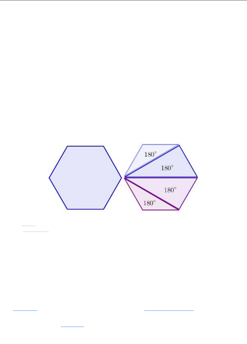 Exercícios de geometria 8º ano BIA Meus amores, Vamos lembrar um pouco dos nossos polígonos convexos. Já aprendemos a clcular o numero de diagonais totais e o numero de diagonais que partem de cada vértice, Agora, prestem atenção no calculo da soma dos ângulos internos Soma dos ângulos internos A soma dos ângulos internos de qualquer triângulo é igual a 180°. Tendo isso em mente, podemos pensar em dividir os polígonos convexos em triângulos. Se um polígono pode ser dividido em três triângulos, por exemplo, a soma dos seus ângulos internos é igual a 3 vezes 180. Para tanto, é preciso criar uma divisão em que a soma dos ângulos dos triângulos seja igual à soma dos ângulos dos polígonos. É fácil ver que, se escolhermos um vértice de um polígono, as suas diagonais formarão triângulos que cumprem esse pré-requisito. Observe a imagem a seguir: 1. Home 2. Matemática 3. Soma dos ângulos internos de um polígono SOMA DOS ÂNGULOS INTERNOS DE UM POLÍGONO Clique para aprender uma expressão matemática que pode ser usada no cálculo da soma dos ângulos internos de um polígono. Um polígono é uma figura geométrica formada por segmentos de reta. Essa figura é fechada e nenhum desses segmentos de reta encontra-se a não ser em suas extremidades. Quando o polígono é convexo, é possível descobrir a soma dos seus ângulos internos sem ter que medi-los. Isso é feito por meio de uma fórmula matemática. https://escolakids.uol.com.br/ https://escolakids.uol.com.br/matematica/ https://escolakids.uol.com.br/poligonos.htm https://escolakids.uol.com.br/estudo-da-reta-segmento-de-reta-e-semirreta.htm https://escolakids.uol.com.br/poligonos-convexos-seus-elementos.htm Polígono convexo Um polígono é convexo quando o segmento de reta cujas extremidades são pontos do interior do polígono está inteiramente dentro dele. Em outras palavras, alguns polígonos possuem uma espécie de “boca”, de modo que é possível escolher dois de seus pontos e ligá-los por um segmento de reta que não está inteiramente dentro do polígono. Esses são os chamados não convexos. Observe a imagem a seguir que mostra um polígono convexo à esquerda e um não convexo à direita. Soma dos ângulos internos A soma dos ângulos internos de qualquer triângulo é igual a 180°. Tendo isso em mente, podemos pensar em dividir os polígonos convexos em triângulos. Se um polígono pode ser dividido em três triângulos, por exemplo, a soma dos seus ângulos internos é igual a 3 vezes 180. Para tanto, é preciso criar uma divisão em que a soma dos ângulos dos triângulos seja igual à soma dos ângulos dos polígonos. É fácil ver que, se escolhermos um vértice de um polígono, as suas diagonais formarão triângulos que cumprem esse pré-requisito. Observe a imagem a seguir: Essa figura é um hexágono. Repare que, partindo de um mesmo vértice, é possível dividi-lo em quatro triângulos. Para qualquer figura, sempre será possível encontrar n – 3* diagonais partindo do mesmo vértice e, consequentemente, serão formados n – 2* triângulos nesse processo (*n = número de lados do polígono). Como já foi dito, a soma dos ângulos internos de um polígono é igual ao número de triângulos formados dentro dele multiplicado por 180°. Logo, a soma dos ângulos internos de um polígono convexo é: S = (n – 2)180° exemplos: • Qual a soma dos ângulos internos de um icoságono convexo? Os icoságonos são polígonos que possuem 20 lados. A soma dos ângulos internos é: S = (n – 2)180 S = (20 – 2)180 S = 18·180 S = 3280° • Qual é a medida de cada ângulo interno de um icoságono regular? Polígonos regulares possuem ângulos congruentes. Assim, já sabendo que a soma dos ângulos internos do icoságono é 3280°, cada ângulo dele é igual a: 3280 = 162° 20 AGORA TENTEM CALCULAR: 1,Calcule a soma dos ângulos internos de um ENEÁGONO. 2, Calcule a medida de CADA ângulo interno de um PENTADECÁGONO regular. Um pentadecágono é um polígono com 15 lados e 15 ângulos. 3. Determine x nos casos abaixo: a) b) c) ▪ 4.A soma dos ângulos internos é 360º. A afirmação acima é para qual polígono? 4. ) Calcular o número de diagonais do octógono 5.DESAFIO Um polígono regular tem 20 diagonais. Determine a medida, em graus, de um de seus ângulos internos. Meus amores, SOMA DOS ÂNGULOS INTERNOS DE UM POLÍGONO