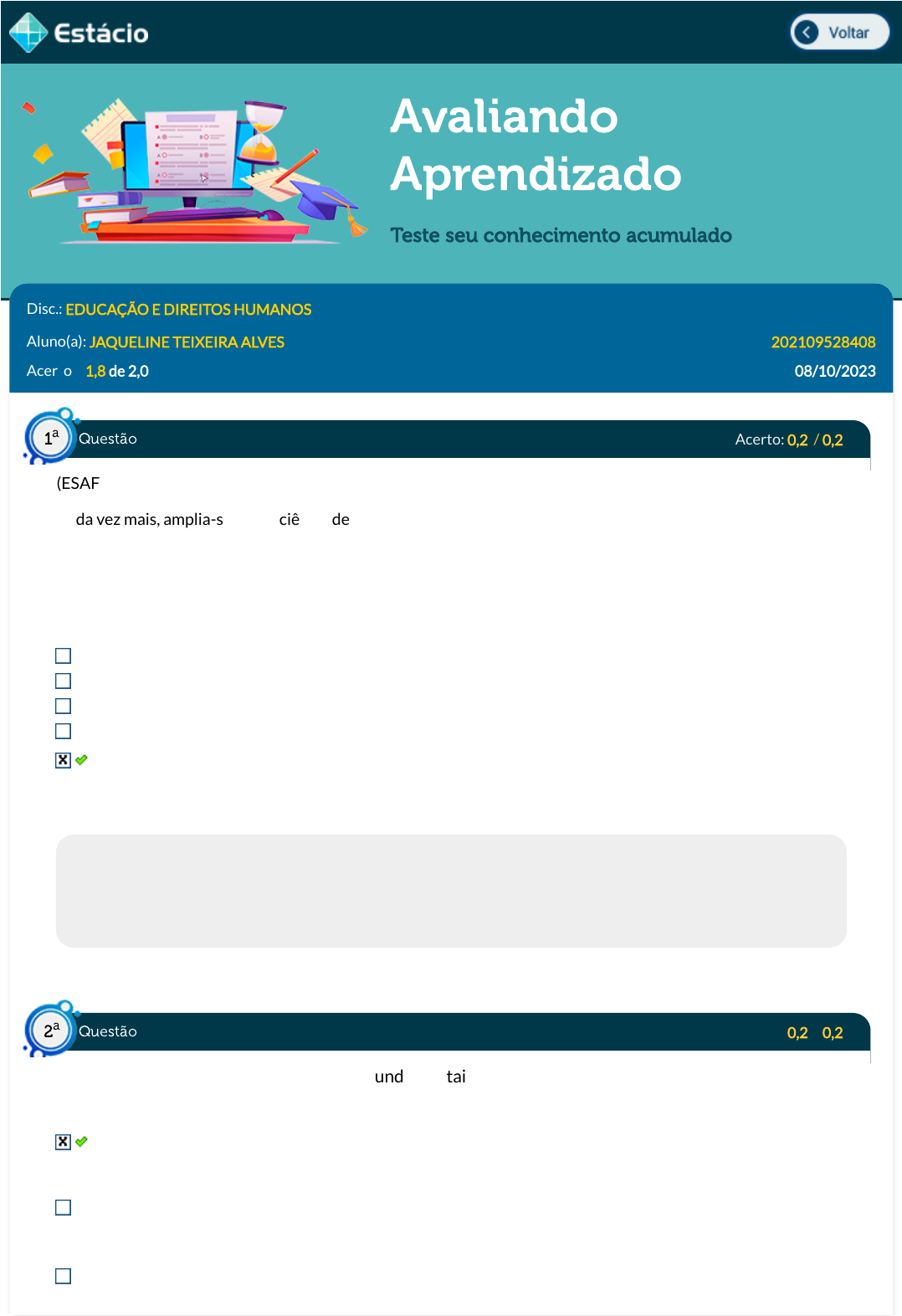 08/10/2023, 22:31 Estácio: Alunos https://simulado.estacio.br/alunos/ 1/6 Avaliando Aprendizado Teste seu conhecimento acumulado Disc.: EDUCAÇÃO E DIREITOS HUMANOS Aluno(a): JAQUELINE TEIXEIRA ALVES 202109528408 Acertos: 1,8 de 2,0 08/10/2023 Acerto: 0,2 / 0,2 (ESAF/2004) Cada vez mais, amplia-se a consciência de que o desenvolvimento a qualquer preço provoca efeitos desastrosos sobre a vida no planeta. Nesse sentido, sabe-se que as consequências de um aquecimento global de grandes proporções podem ser catastró�cas. A emissão descontrolada de determinados gases na atmosfera contribui para agravar o denominado Conversor catalítico. Barômetro de Torricelli. Protocolo de Kioto. Efeito mundial. Efeito estufa. Respondido em 08/10/2023 22:17:08 Explicação: Há algum tempo, tornou-se rotina ligar a tevê e encontrar alguma pauta nos telejornais sobre o meio ambiente, tais como: efeito estufa, aquecimento global, geleiras derretendo, animais morrendo, alterações nos climas, garimpos clandestinos destruindo matas, Amazônia em chamas. Os desastres naturais nunca foram tão discutidos como agora. Acerto: 0,2 / 0,2 No que concerne aos direitos e garantias fundamentais da Constituição Federal, assinale a alternativa correta: Podem ser classi�cados em direitos de primeira geração ou dimensão (direitos e garantias civis e políticas), de segunda geração ou dimensão (direitos sociais, econômicos e culturais) e de terceira geração ou dimensão (direitos de solidariedade). Podem ser classi�cados em direitos de primeira geração ou dimensão (direitos sociais, econômicos e culturais), de segunda geração ou dimensão (direitos e garantias civis e políticas) e de terceira geração ou dimensão (direitos de solidariedade). Os direitos e garantias fundamentais consagrados pela Constituição Federal são ilimitados Questão1 a Questão2 a https://simulado.estacio.br/alunos/inicio.asp https://simulado.estacio.br/alunos/inicio.asp javascript:voltar(); javascript:voltar(); 08/10/2023, 22:31 Estácio: Alunos https://simulado.estacio.br/alunos/ 2/6 Apenas alguns direitos são considerados absolutos pelo STF. Os direitos de primeira geração são direitos de crédito do indivíduo em relação à coletividade denominado direito positivo. Os de segunda geração são denominados de negativos, pois é o Estado que deve abster-se de invadir a esfera de proteção do indivíduo. E os da terceira geração, tem como titular o indivíduo na sua singularidade. Respondido em 08/10/2023 22:18:38 Explicação: A resposta correta é: Podem ser classi�cados em direitos de primeira geração ou dimensão (direitos e garantias civis e políticas), de segunda geração ou dimensão (direitos sociais, econômicos e culturais) e de terceira geração ou dimensão (direitos de solidariedade). Acerto: 0,2 / 0,2 Sobre a composição dos Direitos Universais das Nações Unidas, é correto a�rmar: A primeira fase foi a de debates, que aconteceu simultaneamente com a Segunda Guerra Mundial; A segunda fase corresponde à criação da Declaração assinada por todos os países envolvidos na Segunda Guerra Mundial; A quarta fase dos Direitos Humanos corresponde à formação dos Sistemas Internacionais de proteção aos Direitos Humanos. As declarações dos direitos universais são falsas, a�nal os países optam por seguir ou não. A terceira fase está acontecendo no século XXI e corresponde à observação e aos esforços de acesso aos Direitos Humanos; Respondido em 08/10/2023 22:20:21 Explicação: A resposta certa é: A terceira fase está acontecendo no século XXI e corresponde à observação e aos esforços de acesso aos Direitos Humanos; Acerto: 0,2 / 0,2 A organização do Estado Democrático de Direito tem, nos direitos humanos, um de seus pilares. Nesse sentido, assinale a alternativa que apresenta corretamente alguns dos fundamentos do Estado Democrático de Direito. A dignidade exclusiva dos brasileiros e a tolerância com os estrangeiros O dever de votar e o direito de concorrer a cargo público A educação gratuita e o acesso universal ao ensino superior A cidadania e a dignidade da pessoa humana. A federalização da educação básica e a gratuidade do ensino superior Respondido em 08/10/2023 22:21:14 Explicação: A resposta certa é: A cidadania e a dignidade da pessoa humana. Questão3 a Questão4 a 08/10/2023, 22:31 Estácio: Alunos https://simulado.estacio.br/alunos/ 3/6 Acerto: 0,2 / 0,2 Questão5 a 08/10/2023, 22:31 Estácio: Alunos https://simulado.estacio.br/alunos/ 4/6 (IFAM/2014) O �lósofo liberal John Stuart Mill, um dos principais expoentes do utilitarismo, colocou a liberdade como a "pedra de toque" de sua teoria política. Esta se baseia no princípio de que: A liberdade se restringe ao direito do indivíduo de participar como cidadão nos negócios públicos (do Estado), através da elaboração da lei. O governo deve visar à felicidade para um número cada vez maior de pessoas. A liberdade, entendida como a não interferência do Estado na esfera privada, é inconciliável com a igualdade entre os indivíduos na esfera pública. A esfera da liberdade individual deve ser ampliada, em nome do interesse próprio, a despeito de causar danos à sociedade como um todo. Os interesses da maioria não podem ser conciliados com os da minoria, já que no sistema democrático esta é governada por aquela. Respondido em 08/10/2023 22:22:38 Explicação: A resposta correta é: O governo deve visar à felicidade para um número cada vez maior de pessoas. Acerto: 0,2 / 0,2 A Assembleia Constituinte responsável pela elaboração da Constituição de 1988 foi composta por políticos eleitos em uma eleição que aconteceu em novembro de 1986. Essa eleição geral para a composição da Constituinte foi autorizada por: Tancredo Neves. Leonel Brizola. José Sarney. Ulysses Guimarães. José Figueiredo. Respondido em 08/10/2023 22:23:17 Explicação: A resposta correta é: 