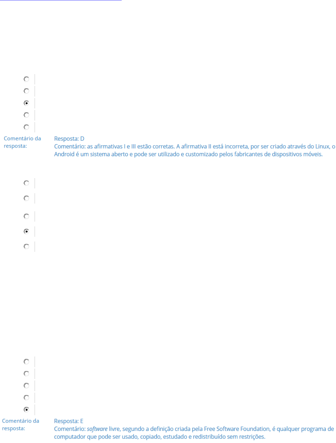 SISTEMAS OPERACIONAIS ABERTOS E MOBILE QUESTIONÁRIO UNIDADE I Pergunta 1 1. Sobre o sistema operacional Android, considere as seguintes afirmativas: I. Foi desenvolvido com base no kernel do sistema Linux. II. É de uso exclusivo de dispositivos da Google. III. É utilizado por diversos fabricantes e diferentes tipos de dispositivos móveis como smartphones, smart TVs e tablets. É correto o que se afirma em: a. I, apenas. b. III, apenas. c. I e II, apenas. d. I e III, apenas. e. I, II e III. Pergunta 2 1. Sobre o sistema iOS, utilizado no Iphone, assinale a alternativa correta. a. O sistema operacional iOS foi construído baseado em Kernel do Linux. b. Diversos fabricantes de dispositivos móveis como Samsung, Motorola e Xiaomi utilizam o sistema iOS. c. Existem comunidades de desenvolvedores independentes que aperfeiçoam o sistema iOS e não são funcionários ou terceirizados da Apple. d. O sistema iOS utilizou como base o sistema operacional de PC e notebooks da Apple, Mac OS. e. A Apple desenvolveu um sistema totalmente novo para o iPhone, sem reaproveitamento de outros sistemas operacionais. 0,25 pontos Pergunta 3 1. O instrumento para garantir que o GNU/Linux fosse mantido sempre aberto consistiu em um contrato jurídico, chamado de GNU GPL (GNU General Public License ou Licença Pública do GNU). Por meio da GNU GPL foram estabelecidos os quatro pilares básicos do software livre. Esses pilares consistem em quatro liberdades fundamentais que definem se um software é livre ou não. São elas: • Liberdade 0: a liberdade de executar o programa como você desejar, para qualquer propósito. • Liberdade 1: a liberdade de estudar como o programa funciona e adaptá-lo às suas necessidades. • Liberdade 2: a liberdade de redistribuir cópias de modo que você possa ajudar ao próximo. • Liberdade 3: a liberdade de distribuir cópias de suas versões modificadas a outros. Assinale a alternativa que contém a definição de software livre. a. É aquele que possui restrições em relação ao seu uso, contudo pode ser redistribuído. b. Modelo de construção de software em que se cobra pelo direito de uso das licenças distribuídas. c. Todo aquele que você pode utilizar, mas não tem acesso ao seu código-fonte. d. Seu modelo de licenciamento é o Copyright, que significa distribuir cópias sem restrição. e. Aquele que pode ser usado, copiado, estudado, modificado e redistribuído sem restrição. Pergunta 4 1. Em qual camada do sistema operacional iOS são inseridas as tecnologias gráficas, de áudio, de vídeo e animações? https://ava.ead.unip.br/webapps/blackboard/execute/courseMain?course_id=_315446_1 a. Camada Kernel. b. Camada Coccoa Touch. c. Camada Media. d. Camada Core Services. e. Camada Core OS. Pergunta 5 1. Considere as seguintes afirmações: I. Qualquer software que não cobre pela licença é um software livre. II. Um dos requisitos fundamentais do software livre é acesso ao código-fonte. III. Após a alteração e a distribuição de um software de código livre, é possível licenciar o software com Copyright. É correto o que se afirma em: a. I, apenas. b. II, apenas. c. I e II, apenas. d. I e III, apenas. e. I, II e III. Pergunta 6 1. Os primeiros smartphones tinham uma capacidade de memória mais limitada e utilizavam a máquina virtual Dalvik. Sobre a máquina Dalvik, assinale a alternativa correta. a. Essa máquina possui um altíssimo consumo de bateria. b. A máquina roda os arquivos com extensão .exe. c. Para executar um aplicativo, este deve ser carregado totalmente na memória. d. A compilação do aplicativo ocorre no momento da instalação dele no smartphone. e. O aplicativo não é carregado de uma vez na memória e sua compilação ocorre em tempo de execução. Pergunta 7 1. Em relação ao desenvolvimento do sistema operacional Android, considere as seguintes afirmativas: I. O desenvolvimento é feito exclusivamente pelo Google. II. O Android é projetado pela Open Handset Alliance, consórcio de empresas de tecnologia. III. Para smartphones, o Sistema Operacional Android é exclusivo para a Samsung e LG. É correto o que se afirma em: a. I, apenas. b. II, apenas. c. III, apenas. d. I e III, apenas. e. II e III, apenas Pergunta 8 1. Com a popularização dos smartphones, os aplicativos vêm ganhando um papel importante na vida das pessoas, auxiliando em questões financeiras, na comunicação e até mesmo na organização pessoal. Uma profissão que surgiu desde o fim da década dos anos 2000 é o desenvolvedor de aplicativo. Assinale a alternativa correta. a. Em um aplicativo desenvolvido para Android são utilizados os mesmos recursos de um aplicativo desenvolvido para iOS. b. Não é necessário alterar um aplicativo Android que funciona em dispositivos diferentes como um smartphone, um tablet ou uma smart TV. c. As lojas de aplicativos somente possuem aplicativos pagos para ter receitas adicionais. d. Os desenvolvedores criam aplicativos a partir de APIs fornecidas pelo Android e iOS e os aplicativos são colocados nas lojas de aplicativos. e. As empresas detentoras dos sistemas operacionais móveis decidiram que todos os aplicativos deveriam ser implementados por funcionários contratados por elas. Pergunta 9 1. Uma das camadas do sistema operacional iOS é a camada Media, que é considerada pela Apple uma das camadas mais importantes do sistema operacional visando oferecer uma melhor experiência ao usuário. Qual a função dessa camada? a. Representa o kernel do sistema operacional iOS. b. Possui as tecnologias de gráfico, áudio e vídeo no dispositivo, permitindo a fácil implementação de aplicativos multimídia. c. Realiza a compilação de um aplicativo e a instalação deste no iOS. d. Implementa a comunicação com os dispositivos de entrada/saída do smartphone. e. Possui os principais frameworks utilizados para implementação de aplicações como o serviço de notificação Apple Push e o gerenciamento de processos.