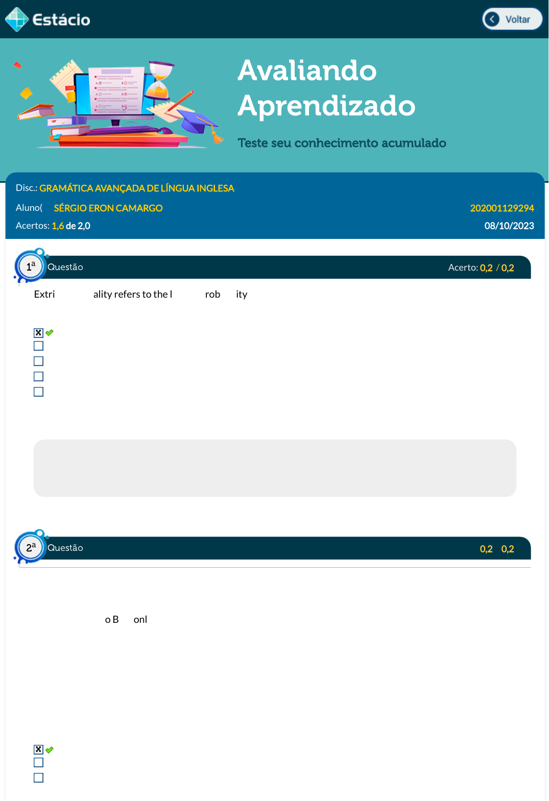 Avaliando Aprendizado Teste seu conhecimento acumulado Disc.: GRAMÁTICA AVANÇADA DE LÍNGUA INGLESA Aluno(a): SÉRGIO ERON CAMARGO 202001129294 Acertos: 1,6 de 2,0 08/10/2023 Acerto: 0,2 / 0,2 Extrinsic modality refers to the logical probability of a given event. Bearing this in mind, mark the option in which the modal conveys the notion of modalized certainty. I´m sure I must have misunderstood you. I may be wrong. I should´ve done this years ago! There´s some low cloud we can lose ourselves in! We´re not going through the clouds. I can change my appearance at will. Respondido em 08/10/2023 10:13:54 Explicação: In "I must have misunderstood you", the speaker assumes that a misunderstanding must have taken place. It is a logical deduction based on prior evidence. The other options either refer to advice, possibility or ability. Acerto: 0,2 / 0,2 Read the excerpt below: "Even if I speak to Bart only in Dutch, he‛ll mostly reply in English, and we go with that," says Jansen. Available at: https://www.theguardian.com/science/2022/sep/04/britains-multilingual-children-we-speak- whatever-language-gets-the-job-done- Access on: March 3rd, 2023. Choose the option that best describes the excerpt above: Direct report, because it completely preserves the enunciator‛s original wording. Partial report, because it combines the original wording with paraphrased content. Partial quotation, because it completely preserves the enunciator‛s original wording. Questão1 a Questão2 a https://simulado.estacio.br/alunos/inicio.asp https://simulado.estacio.br/alunos/inicio.asp javascript:voltar(); javascript:voltar(); Indirect report, because the lack of quotation marks suggests the source‛s original words are not used and the fragment has been paraphrased. Indirect report, because it completely preserves the enunciator‛s original wording. Respondido em 09/10/2023 12:24:44 Explicação: Indirect speech occurs when speakers or writers focus on the content of the message, paraphrasing it in their own words. We call direct or quoted speech the cases in which the reporter offers an ipsis litteris account of what has been said or written, reproducing exactly the authors‛ original words, which is usually signalled by the use of quotation marks. Finally, juxtaposing in the same statement the author‛s and his/ her sources¿ choices of words refers to the use of partial quotation. Acerto: 0,2 / 0,2 Present Perfect is a verb tense that can be used in a few different situations. Choose the alternative in which the Present Perfect describes a very recent action. She has just �nished her homework. She �nished her homework last night. She has �nished her homework. She had �nished her homework before her mother arrived. She has already �nished her homework. Respondido em 09/10/2023 12:25:03 Explicação: Whenever we use the word "just" in combination with the Present Perfect, it suggests the action has been completed very recently; therefore, the sentence is aimed at describing a very recent past. The other options which show the present perfect in use, either refer to an action that has taken place over a period of time and has just been completed or to an action happened at an unspeci�ed prior time. Acerto: 0,0 / 0,2 Sentences perform a variety of discourse functions. Bearing this in mind, assess the following statements. I. The function of conveying information is called directive. II. The function to convey impressions about one¿s feeling is called exclamation. III. Finally, the function of seeking information through language is called statement. I-false; II-true; III- true. I-false; II-false; III- true. I-false; II-true; III- false. I-true; II-true; III- false. I-true; II- true; III- true. Respondido em 09/10/2023 12:25:17 Explicação: Questão3 a Questão4 a Statements convey information, exclamations convey one¿s impression and feelings and questions seek information through language. Therefore, the correct answer is I-false; II-true; III- false. Acerto: 0,2 / 0,2 Based on the distinction between reference and substitution, read the sentences below and mark the option that presents an example of substitution. Instead of buying her a bouquet, why don´t you take her do dinner? That stupid car is broken again. After seeing Janet buying a new piece of furniture, Mary decided to buy one as well. Your sister plays soccer so much better than you. Yesterday, all kids in my condo went to the scout´s party. Respondido em 09/10/2023 12:25:26 Explicação: The only example of substitution in the sentences above is the use of one as a replacement for piece of furniture. The other options either present regular sentences or clauses or a case of ellipsis, in which part of a clause is omitted. Therefore, the correct answer is "After seeing Janet buying a new piece of furniture, Mary decided to buy one as well". Acerto: 0,2 / 0,2 Intrinsic modality refers to social functions, such as giving advice, granting permission, making requests, expressing obligation. Choose the option that best interprets the sentence "you may not leave". You are not allowed to leave. It is possible that you will not leave. You are either not allowed to leave or allowed not to leave. You are obliged to leave. You are allowed not to leave. Respondido em 09/10/2023 12:25:36 Explicação: The use of "may" in the negative form with the meaning of permission is ambiguous: both interpretations presented in alternative "You are either not allowed to leave or allowed not to leave are plausible". Furthermore, the modal in the sentence in question does not refer to obligation nor possibility. Acerto: 0,0 / 0,2 Reporting is a linguistic mechanism that comprehends direct reported speech and indirect reported speech. Indirect reporting is the means by which: We focus on the meaning of the message, but change its form, rephrasing the original order, question, or statement in our own words. We juxtapose in the same statement the author