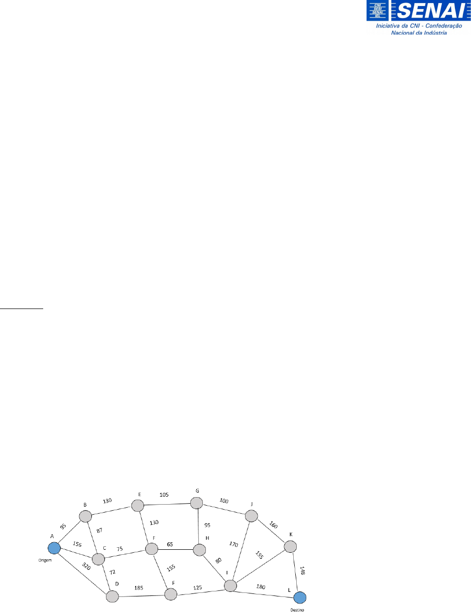 CURSO TÉCNICO EM LOGÍSTICA Planejamento de rotas de distribuição ATIVIDADE 02 IDENTIFICAÇÃO Nome: Curso: Técnico em Logística - SENAI Unidade Curricular: Gestão da Distribuição Parte 01 Aprofunde seus os estudos acerca do Planejamento da distribuição e resolva o problema da rota de distribuição da empresa Rocha & Silveira doces. O pedido deverá ser entregue no dia posterior, para isso você deverá analisar a rota utilizada pela empresa (A - D – F – I – K – L). Se necessário, defina uma rota melhor, em relação ao tempo em trânsito, para que o prazo estabelecido ao cliente seja cumprido. Aponte o tempo total previsto para a rota e justifique sua decisão. As opções para roteirização podem ser analisadas na figura. Aluno, deixe na atividade, a memória de cálculo para todas as possíveis rotas de distribuição. 1. Para a justificativa, utilize a fonte Times New Roman, tamanho 12, texto justificado e espaçamento entre linhas 1,5 e salve o documento como Ativ2_Planejamento de rotas de distribuição _ Nome do aluno. Parte 02 Para os demais pedidos, Pedro necessita selecionar um método de roteirização, informar quantos veículos e quantas paradas serão necessárias. Cada veículo possui capacidade para transportar 15000 unidades. A região em que ocorrerá as entregas está representada na figura. Dica: Veja qual método é o mais indicado para resolução do problema de roteirização.
