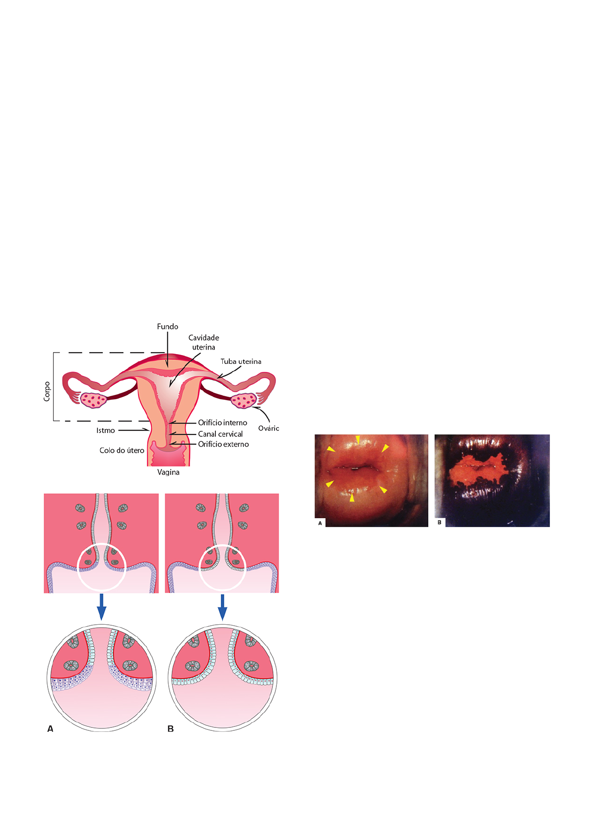 Colo Uterino ● Ectocérvice: ○ Epitélio escamoso não ceratinizado. ● Endocérvice: ○ Epitélio colunar mucoso e células subcolunares de reserva que podem se diferencial em epitélio colunar ou escamoso; ○ Pregueado, avança para o estroma do colo, formando glândulas endocervicais. ● JEC = Junção escamocolunar = local (orifício externo) em que ambos epitélios se encontram; Representação esquemática da junção escamocolunar (JEC). A transição dos dois tipos de epitélio localiza-se no orifício externo. B. Eversão (ectrópio) da mucosa endocervical, que passa a ocupar uma área fora do orifício externo, inclusive com glândulas endocervicais. ● O epitélio da ectocérvice é rico em glicogênio e, por isso, cora-se facilmente com iodo → Teste de Schiller ou Teste do Iodo → Iodo cora as células bem diferenciadas/típicas; ● Na idade fértil, o epitélio endocervical, por influência hormonal, prolifera e se projeta pelo orifício externo do colo (eversão/ectrópio) → esse epitélio não é adequado para as condições adversas do meio vaginal → sofre metaplasia escamosa (células de reserva diferenciam-se em epitélio escamoso) → essa zona fica conhecida como Zona de Transformação (ZT). ○ A metaplasia escamosa do epitélio endocervical pode obstruir os orifícios de drenagem das glândulas endocervicais → forma Cistos de Naboth. A. Colo uterino com extensa área de ectrópio (cabeças de seta). B. Mesmo caso, após teste de Schiller. A região de ectrópio mostra-se clara (não se cora pelo iodo), chamada de área Schiller positiva ou iodo negativa. Cisto de Naboth. No detalhe, aspecto macroscópico do colo uterino com o cisto (seta). Microscopicamente, vê-se a zona de transformação, com epitélio escamoso na superfície e, logo abaixo no estroma, glândula endocervical dilatada (seta), formando o cisto. Representação esquemática da zona de transformação (ZT). O epitélio endocervical sofreu metaplasia e transformou-se em epitélio escamoso, que está presente em toda a região antes ocupada pelo ectrópio. Cervicites ● Infecciosas ou não infecciosas; ● As mais importantes são as causados por vírus (vírus do papiloma humano - HPV → associação com carcinoma cervical; citomegalovírus - CMV → inflamação em mulheres imunossuprimidas), bactérias (agentes sexualmente transmissíveis - gonococo e clamídia) e outros microrganismos; ● Quando a inflamação é prolongada e intensa → pode surgir ulceração e atipias no epitélio → podem ser confundidas com lesões precursoras do câncer. Pólipo Endocervical ● Lesão prevalente → achado incidental em mulheres >40; ● Pequena (<1cm); raramente volumosa (~15cm → pólipo gigante); ● Pediculada; ● Pode causar sangramento vaginal; ● Constituída de epitélio endocervical, com ou sem metaplasia escamosa, e estroma com vasos sanguíneos e infiltrado inflamatório; ● Pólipo misto = com glândulas endocervicais e endometriais (ocorre no istmo); ● Todo pólipo deve ser examinado histologicamente (raramente pode ter lesões precursoras do câncer de colo uterino). Neoplasias Malignas ● Neoplasias do colo uterino = 3º lugar em frequência; 4ª causa de morte por câncer; ○ frequente em mulheres de baixa condição socioeconômica. Patogênese ● Associa-se a infecção persistente por subtipos de alto risco do HPV (principalmente HPV 16 e 18) → responsáveis por 70% dos carcinomas cervicais; ○ HPV → verrugas genitais (condiloma acuminado) → induzem proliferação epitelial; ○ Os tipos de HPV de alto risco oncogênico associam-se a lesões precursoras do carcinoma escamoso (NIC 2 e NIC 3) e ao adenocarcinoma endocervical; ○ Há tipos de HPV de baixo risco oncogênico → raramente integram-se ao DNA da célula hospedeira causando câncer; ○ HPV é mais prevalente em mulheres sexualmente ativas entre 18 e 30 anos (pico em 25 anos e outro por volta de 45 anos); ○ Progressão para câncer ocorre 10-20 anos após infecção; ○ Fatores de risco: tipo viral, infecção múltipla, carga viral na lesão, taxa de integração do vírus ao genoma celular, variantes geográficas do HPV, resposta imunitária, tabagismo, início precoce de atividade sexual, uso prolongado de contraceptivos orais, multiparidade, múltiplos parceiros sexuais, associação com outras infecções sexualmente transmissíveis, como o HIV. ● Câncer é mais comum >35 anos (infecção precoce + evolução lenta); ● No colo, apenas células basais e parabasais do epitélio escamoso são capazes de se dividir (células suprabasais sofrem diferenciação e maturação, mas não divisão) → vírus penetra em células da camada basal; ● Atipia coilocitótica = número de cópias virais cresce sem integrar ao DNA celular → ocorre vacuolização perinuclear em células escamosas → mantém maturação preservada do epitélio → maior atividade proliferativa e hiperplasia da camada basal; ● O HPV, em resumo, produz proteínas virais E6 e E7 que bloqueiam proteínas essenciais no controle da multiplicação celular (p53 e pRB) → instabilidade genômica e aumento da proliferação celular. Atipias coilocitóticas em condiloma acuminado do colo uterino. Carcinoma de Células Escamosas (CCE) ● Tipo histológico mais frequente de câncer cervical (85% das neoplasias malignas do colo); ● Afeta mulheres jovens (3ª-5ª décadas de vida), em idade fértil e socialmente produtiva. Morfologia ● Inicialmente → área endurecida, discretamente elevada ou pequena úlcera; ● Avançado → crescimento: a. vegetante (massa polipoide ou papilífera projetada no colo); b. ulcerado, sangrante e com bordas elevadas; c. endofítico (forma lesão ulcerada ou nódulo na luz do canal endocervical; mais agressiva, com infiltração precoce da parede e extensão aos órgãos vizinhos → fístulas); ● Microscopia: massas ou grupos de células pleomórficas e atípicas que infiltram o 