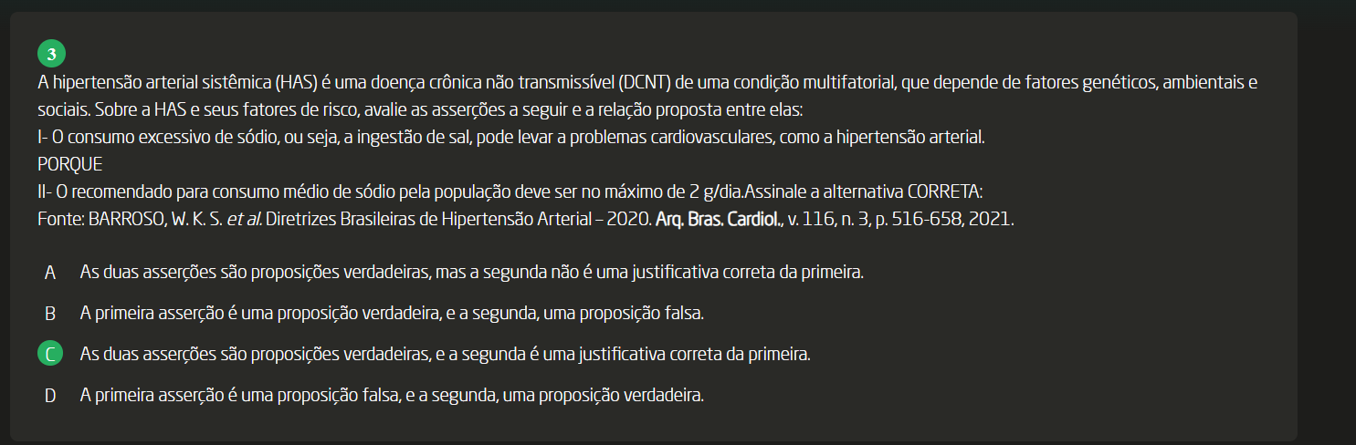 I- consumo excessivo de sódio, ou seja, a ingestão de sal, pode levar a problemas cardiovasculares, como a hipertensão arterial. II- recomendado para consumo médio de sódio pela população deve ser no máximo de 2 g/dia. A As duas asserções são proposições verdadeiras, mas a segunda não é uma justificativa correta da primeira. B A primeira asserção é uma proposição verdadeira, e a segunda, uma proposição falsa. C As duas asserções são proposições verdadeiras, e a segunda é uma justificativa correta da primeira. D A primeira asserção é uma proposição falsa, e a segunda, uma proposição verdadeira.