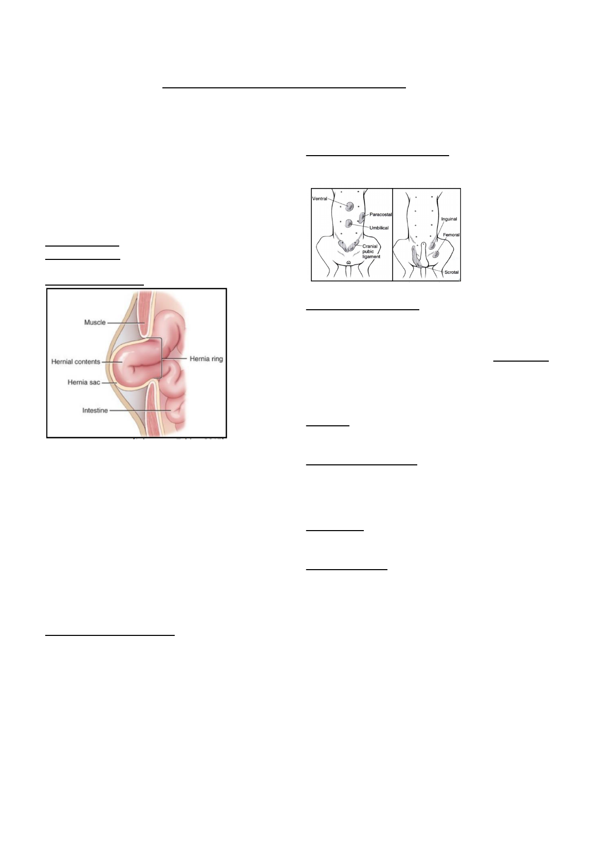 Maria Eduarda Strapazzon - UPF Clínica Cirúrgica dos Animais de Companhia HÉRNIAS Hernia (lat.) = tumor, aumento de volume. Paratobia, alteração ao lado da sua origem. ✓ “Protrusão de um órgão ou parte dele através de um defeito na parede da cavidade anatômica onde situa-se o órgão” (SLATTER, 2007) Podem ser congênitas (hereditárias) ou adquiridas (traumáticas/hormonais/anatômicos/metabólicos). Constituintes das hérnias (verdadeiras) 1.Saco herniário✓ Peritônio parietal (protrusão) 2.Anel herniário ✓ Delimitações da abertura (defeito na parede) 3.Conteúdo herniário✓ Tecidos ou órgãos Hérnias “falsas” Não possuem um dos constituintes Saco herniário ausente (maioria) Geralmente são traumáticas, como: Diafragmática, Hérnias ventrais, Eventrações e Hérnias incisionais. *eventração - alojamento de vísceras na cavidade abdominal através de um defeito que se aloja no subcutâneo, traumáticas *Hérnias incisionais - deiscências, decorrentes de procedimentos. CLASSIFICAÇÃO DAS HÉRNIAS Localização: Hérnias abdominais externas (possível a visualização) ✓ Ventrais e umbilicais ✓ Caudais - Inguinal, escrotal, femoral Hérnias abdominais internas - ocorrem através de um anel de tecido confinado ao abdome ou tórax ✓ Diafragmáticas Quanto à etiologia: Congênitas e hereditárias Cães com hérnias congênitas podem apresentar: ✓ Criptorquidismo ✓ Pectus excavatum (hérnias peritônio-pericárdicas) ✓ Trato urinário (persistência de úraco) Traumáticas Quadro clínico potencialmente grave (agudos ou crônicos) Quanto à redução: Redutível: Conteúdo herniário retorna à cavidade abdominal mediante pressão externa Irredutível (encarcerada): Conteúdo herniado está aderido ao saco herniado ou a um subcutâneo e não volta à cavidade. Quanto à viabilidade do conteúdo herniário: Estrangulada: Necrose tecidual, choque (normalmente o órgão não vai mais ter viabilidade) Não estrangulada: Após a retirada, o órgão continua com suas funções normais. FISIOPATOLOGIA HÉRNIAS ABDOMINAIS ✓ Efeitos de “ocupação de espaço”: Diafragmática: tamponamento cardíaco (↓ DC) - são defeitos na parede externa do abdome que permitem a protrusão do conteúdo abdominal; Obstrução intestinal e/ou urinária ✓ Alteração da função dos órgãos Aderências ✓ Encarceramento Distúrbios hidroeletrolíticos e ácido base ✓ Estrangulamento Morte tecidual, ruptura de órgãos, toxemia, choque ✓ Óbito ETIOPATOGENIA, APRESENTAÇÃO CLÍNICA E TRATAMENTO DE HÉRNIAS ESPECÍFICAS HÉRNIA UMBILICAL Aumento de volume em região da cicatriz umbilical, pode ser redutível ou irredutível, encarcerada, estrangulada ou não. ✓ Etiopatogenia Maria Eduarda Strapazzon - UPF Pouca importância clínica - se for de tamanho pequeno. Geralmente congênito/hereditário Recorrente de: Onfaloflebites, traumatismos, comum em partos quando a mãe limpa a região umbilical e pode acabar rompendo parte dos vasos umbilicais e traumatizar as inserções do músculo reto abdominal. É comum nas hernias a presença de estrutura ou orgãos com pediculos longos, como o omento (quase sempre presente) e alça intestinal de intestino longo. Além do ligamento falciforme. Sinais Clínicos de uma hérnia umbilical não complicada. ✓Aumento de volume na região da cicatriz umbilical ✓Forma Globosa ✓Geralmente Redutível ✓Indolor ✓Macia ✓Palpação do anel após redução. Devem ser definidos: o tamanho do anel, que é a passagem, e o tamanho do paciente. Sinais Clínicos de uma hérnia umbilical complicada: ✓Aumento de volume dolorido ✓Região eritematosa, quente ✓Irredutível ✓Vômito, anorexia, sinais de choque séptico (hipertermia, hipotensão, taquicardia, taquipneia) *Quando o defeito for grande (2 a 3 dedos), as complicações sistêmicas a curto prazo serão menores, no entanto, tamanhos menores, sendo possível passar uma alça intestinal, são consideradas emergências, pois o bolo alimentar pode ficar encarcerado e isso gerar complicações maiores - sinais de choque séptico, sendo possível até causar uma peritonite. Diagnóstico: ✓ Clínico: Inspeção, palpação, Dor ✓ Radiografia e ultrassonografia ✓ Buscar outras alterações congênitas Diagnóstico diferencial: ✓Abscesso, onfalite/onfaloflebite - Histórico e Exame físico ✓Neoplasia - Sem anel, Irredutível e indolor, Faixa etária maior Tratamento cirúrgico em caninos e felinos: ✓ Herniorrafia ✓ Técnica para redutíveis ou irredutíveis ✓ Castração ✓ Cuidados pós-operatórios - OVH incisão em elipse em cada lado da hérnia, remover o excesso de pele, divulsionar o saco herniado, reavivar as bordas e suturar em celiorrafia com nylon ou polidioxanona. HÉRNIA INGUINAL Etiopatogenia ✓ Incidência: fêmeas (cadelas) ✓ Fatores predisponentes: Anatômicos, hormonais e metabólicos ✓ Conteúdo: Intestino delgado, Útero (histerocele), Bexiga urinária, omento. Fatores: No macho possui um cordão espermático no local - anatômica. Nas fêmeas, a cada ciclo estral, o estrógeno fragiliza as fibras colágenas da região e ao mesmo tempo há um aumento de volume sanguíneo no útero para preparação da copula, tudo isso dilata os aneis inguinais - hormonal. Em fêmeas com sobrepeso, há um aumento na pressão intra abdominal, associado a dilatação do anel inguinal no cio e o aumento do peso do útero - hormonal e metabólico. Sinais Clínicos: ✓ Aumento volume inguinal ✓ Sistêmicos : intestinos, bexiga, útero (são relativos, conforme o tamanho do anel inguinal, azotemia pós-renal) Diagnóstico: ✓ Inspeção ✓ Palpação (consistência e redução) ✓ Sinais de encarceramento (irredutível, cianótico, dor local) ✓ Sondagem vesical e RX - se estiver um tanto flacida, ao passar a sonda vai reduzir a hernia pelo esfaciamento da bexiga e após isso realiza a cirurgia, pois ao encher novamente vai ficcar irredutíve
