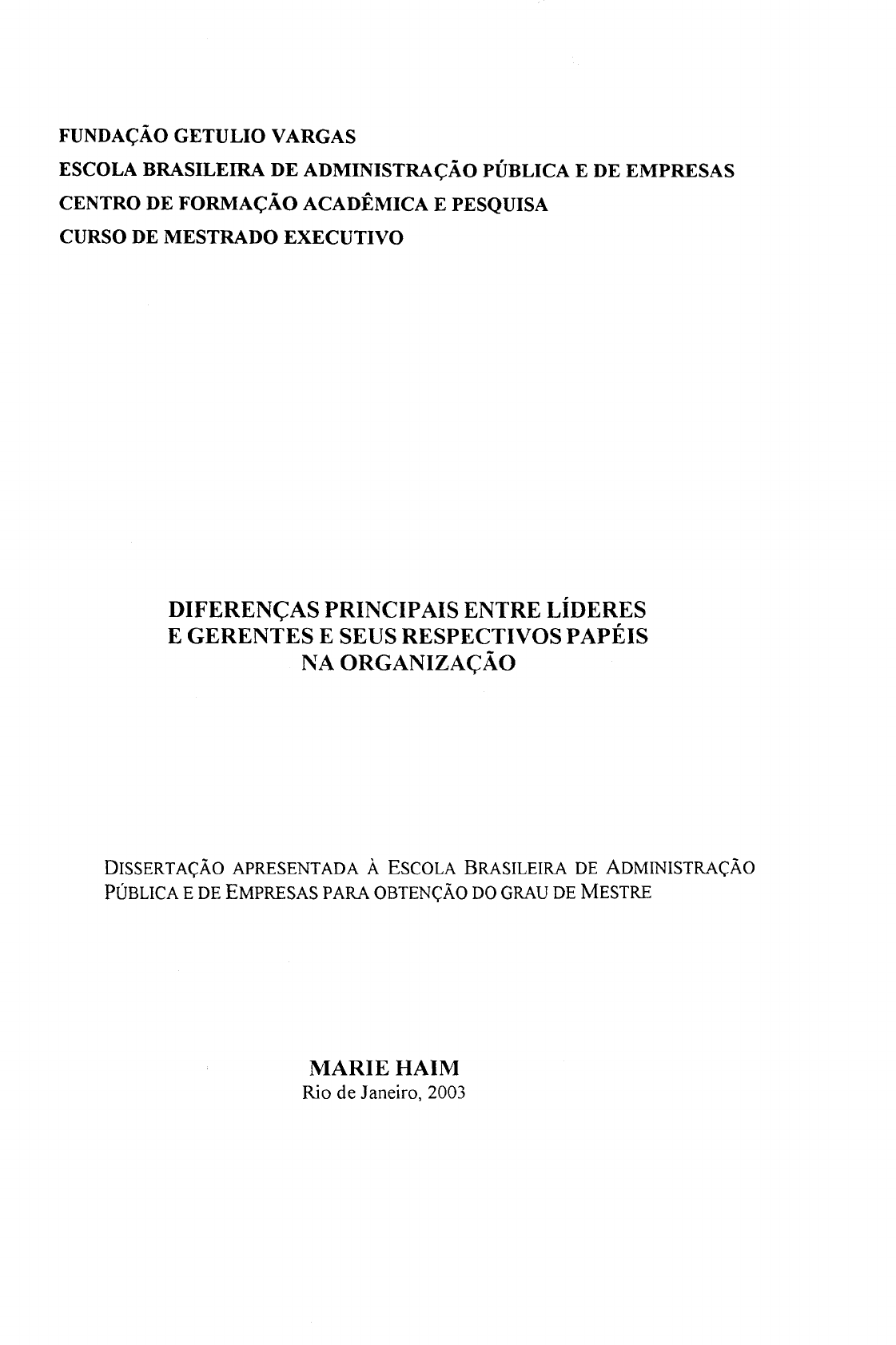 FUNDAÇÃO GETULIO VARGAS ESCOLA BRASILEIRA DE ADMINISTRAÇÃO PÚBLICA E DE EMPRESAS CENTRO DE FORMAÇÃO ACADÊMICA E PESQUISA CURSO DE MESTRADO EXECUTIVO DIFERENÇAS PRINCIPAIS ENTRE LÍDERES E GERENTES E SEUS RESPECTIVOS PAPÉIS NA ORGANIZAÇÃO DISSERTAÇÃO APRESENTADA À ESCOLA BRASILEIRA DE ADMINISTRAÇÃO PÚBLICA E DE EMPRESAS PARA OBTENÇÃO DO GRAU DE MESTRE ~IARIE HAIM Rio de Janeiro, 2003 FUNDAÇÃO GETULIO VARGAS ESCOLA BRASILEIRA DE ADMINISTRAÇÃO PÚBLICA E DE EMPRESAS CENTRO DE FORMAÇÃO ACADÊMICA E PESQUISA CURSO DE MESTRADO EXECUTIVO E TÍTULO DIFERENÇAS PRINCIPAIS ENTRE LÍDERES E GERENTES E SEUS RESPECTIVOS PAPÉIS NA ORGANIZAÇÃO DISSERTAÇÃO DE MESTRADO APRESENTADA POR: MARIEHAIM APROV ADA EM.leL / O ~ /:2 CC) 3 PELA COMISSÃO EXAMINADORA P."ofessol" Orientado." Acadêmico DI" LUIS CÉSAR G. DE ARAUJO Ia~ = Professora ~ER~IRA FRAGA Professor Dr. PAULO REIS VIEIRA FUNDAÇÃO GETULIO VARGAS ESCOLA BRASILEIRA DE ADMINISTRAÇÃO PÚBLICA E DE EMPRESAS CENTRO DE FORMAÇÃO ACADÊMICA E PESQUISA CURSO DE MESTRADO EXECUTIVO DIFERENÇAS PRINCIPAIS ENTRE LÍDERES E GERENTES E SEUS RESPECTIVOS PAPÉIS NA ORGANIZAÇÃO Dissertação apresentada à Escola Brasileira de Administração Pública para a obtenção do grau de mestre em Gestão Empresarial MARIE HAIM Rio de Janeiro, 2003 À memória sempre presente do meu querido Roberto, que como um imenso farol seguirá eternamente iluminando os nossos caminhos: o meu e do nosso filho Gabriel. RESUMO Liderança e Gerenciamento não são a mesma coisa. Ambos são importantes, porém têm propósitos muito diferentes. Neste contexto, esta dissertação considera a idéia de que se, até no campo das ciências exatas existe alguma confusão com relação ao uso indistinto de determinados termos, no campo das ciências humanas o uso inadequado das palavras aumenta, na prática, a possibilidade dessa imprecisão, podendo levar a conclusões duvidosas. No momento em que a velocidade das mudanças no meio organizacional se faz sentir num ritmo cada vez mais rápido, o desenvolvimento das competências dos recursos humanos assume uma posição crucial. Torna-se essencial a busca por algo ou alguém que possa arregimentar esforços na procura de um caminho especial a ser seguido, frente aos desafios impostos pelo ambiente. Desta forma, a partir do objetivo geral de identificar e caracterizar as diferenças principais entre Líderes e Gerentes e seus respectivos papéis nas organizações, é apresentada uma análise comparativa entre as diversas correntes teóricas que abordam o tema, ressaltando-se a importância de se diferenciar esses dois tipos de comportamentos, igualmente imprescindíveis às organizações atuais. ABSTRACT Leadership and Management do not mean the same thing. Both are important, yet they do have very different functions. Following this line of investigation, the present dissertation considers the possibility of eventual misunderstandings regarding the use of both terms, whenever applied to describe these two organizations' role players. Nowadays, with the rising pace in business change of directions, the development of proper human resources expertise assumes a crucial task. It becomes vital to pursuit something or someone that could help companies get together new alternatives to meet latest challenges. Identifying and distinguishing key differences between Leaders and Managers, as well as their functions in the business are the general objectives of this study. It is also being presented an assessment of the different assumptions already carry out in this subject matter, bearing in mind the importance of making the proper distinction between Leaders and Managers, both performances equally imperative to today companies. SUMÁRIO APRESENTAÇÃO ............................................................................................. 9 1 INTRODUÇÃO ........................................................................................ 11 1.1 Hipótese GeraL ................................................................................. 11 1.1.1 Hipóteses Subjacentes ............................................................... 11 1.2 Objetivo da dissertação ..................................................................... 12 1.2.1 Objetivo Geral .......................................................................... 12 1.2.2 Objetivos Específicos ................................................................. 12 1.3 Importância da Dissertação ................................................................ 12 1.4 Limitações da Dissertação .................................................................. 14 1.5 Metodologia ..................................................................................... 14 2 A ORIGEM DOS TERMOS E UMA RETROSPECTIVA HISTÓRICA DO TEMA ......... 16 2.1 A Origem dos Termos ........................................................................ 16 2.2 Retrospectiva Histórica do Tema ......................................................... 19 2.2.1 Escola da Administração Científica ............................................... 20 2.2.2 Escola das Relações Humanas ..................................................... 21 2.2.3 Enriquecimento do Trabalho ....................................................... 22 2.2.4 Teorias X e Y ............................................................................ 23 2.2.5 Grid Gerencial .......................................................................... 25 2.2.6 A Liderança Situacional e o Comportamento do Líder ..................... 29 3 O QUE CARACTERIZA UM LÍDER ............................................................... 32 4 O QUE CARACTERIZA UM GERENTE .......................................................... 42 5 DIFERENÇAS PRINCIPAIS ENTRE LÍDERES E GERENTES E SEUS RESPECTIVOS PAPÉIS NA ORGANIZAÇÃO ...................................................................... 