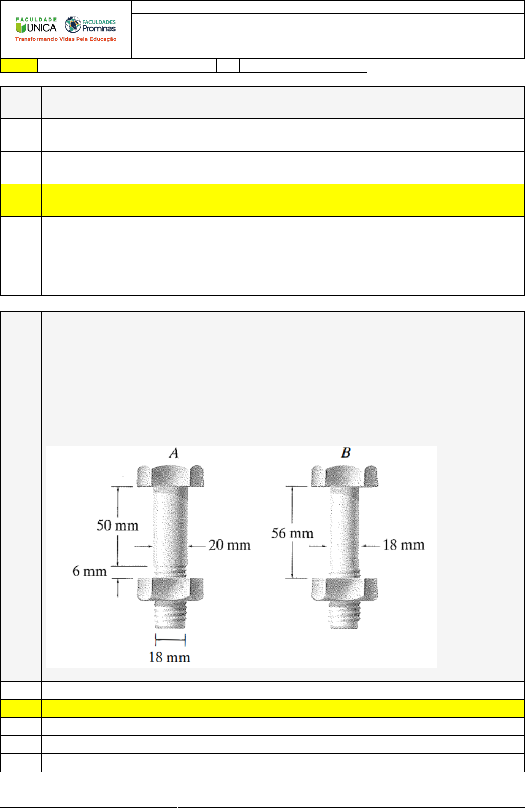 07/10/2023 11:20:44 1/4 REVISÃO DE SIMULADO Nome: EULER JOSE RIBEIRO Disciplina: Mecânica dos Sólidos II Respostas corretas são marcadas em amarelo X Respostas marcardas por você. Questão 001 Com relação ao teorema dos trabalhos mínimos, também conhecido como princípio dos trabalhos virtuais, marque a alternativa INCORRETA: A) O teorema dos trabalhos virtuais leva algumas premissas como: as cargas devem satisfazer as condições de equilíbrio, e os deslocamentos, as de compatibilidade. B) Esse teorema afirma que a configuração estática de uma estrutura é aquela que minimiza a energia potencial total do sistema. X C) O princípio do trabalho mínimo não possui relação com o princípio da conservação da energia. D) O princípio dos trabalhos mínimos pode ser aplicado para a determinação dos deslocamentos e a inclinação em vários pontos de um corpo deformável. E) De acordo com esse teorema, uma estrutura está em equilíbrio quando a variação da energia potencial é mínima para pequenas perturbações. Isso significa que, para uma estrutura em equilíbrio, a soma dos trabalhos virtuais externos e internos é igual a zero. Questão 002 Um dos dois parafusos de aço de alta resistência A e B mostrados na Figura abaixo deve ser escolhido para suportar uma carga de tração repentina. Para escolher, é necessário determinar a maior quantidade de energia de deformação elástica que cada parafuso pode absorver. O parafuso A tem diâmetro de 20 mm por 50 mm de comprimento e diâmetro de rosca (ou menor diâmetro) de 18 mm dentro da região rosqueada de 6 mm. O parafuso B tem roscas 'recalcadas', de modo tal que o diâmetro em todo o seu comprimento de 56 mm pode ser considerado como 18 mm. Em ambos os casos, despreze o material extra que compõe as roscas. Considere EAço=210×103 MPa, e σe=310 MPa. Qual parafuso deverá ser escolhido? A) Parafuso A. Pois possui maior dureza. X B) Parafuso A. Pois este absorve mais energia na fase elástica do que o parafuso B. C) Parafuso B. Pois este é mais frágil, portanto, absorve mais energia na fase elástica. D) Parafuso A. Pois este absorve menos energia na fase elástica do que o parafuso B. E) Parafuso B. Pois este absorve maior energia na fase elástica. 07/10/2023 11:20:44 2/4 Questão 003 Determine o deslocamento horizontal da articulação A. Cada barra é feita em Aço A-36 e tem secção transversal de 950 mm2 A) 0,884 mm B) 0,221 mm C) 1,565 mm D) 0,005 mm X E) 0,442 mm Questão 004 Com relação ao Método dos deslocamentos Virtuais, marque a alternativa INCORRETA: A) No método dos deslocamentos virtuais, as incógnitas são os deslocamentos nas direções de interesse da estrutura. B) No Método dos Deslocamentos Virtuais, as variações infinitesimais dos deslocamentos são consideradas como as forças virtuais. Essas variações são aplicadas em pontos específicos da estrutura, permitindo calcular as respostas estruturais sem a necessidade de resolver equações diferenciais complexas. C) O princípio fundamental é que o trabalho virtual realizado pelas forças externas virtuais deve ser igual ao trabalho virtual realizado pelas forças internas correspondentes. X D) O Método dos Deslocamentos Virtuais é um método exato, e não e requer nenhuma suposição para simplificação. E) Esse método é aplicado principalmente para determinar as forças internas em estruturas lineares e para resolver problemas de equilíbrio. Questão 005 O Teorema dos Trabalhos Mínimos é uma ferramenta poderosa para a análise de estruturas, permitindo determinar as respostas estruturais sem a necessidade de resolver sistemas de equações diferenciais. Com esse conhecimento, informe quais são os passos essenciais para realizar o cálculo do Teorema dos Trabalhos Mínimos? A) Resolver as equações de equilíbrio obtidas a partir das derivadas parciais do trabalho virtual. B) Calcular as respostas estruturais desejadas, como deslocamentos e tensões, sem a necessidade de resolver equações diferenciais. X C) Determinar as condições de contorno da estrutura e calcular o trabalho virtual realizado pelas forças externas. D) Estabelecer as forças externas aplicadas na estrutura e derivar parcialmente o trabalho virtual em relação a elas. E) Definir as propriedades de material da estrutura e selecionar um conjunto de deformações virtuais independentes. 07/10/2023 11:20:44 3/4 Questão 006 Qual das seguintes afirmações está correta em relação ao teorema dos trabalhos mínimos? A) O teorema dos trabalhos mínimos é utilizado para determinar os deslocamentos e rotações em pontos específicos de uma estrutura. X B) O teorema dos trabalhos mínimos afirma que a configuração estática de uma estrutura é aquela que minimiza a energia potencial total do sistema. C) O teorema dos trabalhos mínimos é aplicável somente a estruturas elásticas não lineares. D) O teorema dos trabalhos mínimos é usado para calcular as forças internas em uma estrutura sujeita a carregamentos externos. E) O teorema dos trabalhos mínimos estabelece que a soma dos trabalhos virtuais externos e internos é sempre positiva. Questão 007 A treliça de três barras na Figura abaixo está sujeita a uma força horizontal de 20 kN. Se a área da seção transversal de cada elemento estrutural for 100 mm2, determine o deslocamento horizontal no ponto B. E= 200 GPa. (Utilizar o princípio da conservação da energia). A) 7,26 mm B) 0,5 mm X C) 4,73 mm D) 2,55 mm E) 5,25 mm Questão 008 De acordo com o Teorema dos Trabalhos Mínimos, qual é o critério utilizado para determinar a configuração estática de uma estrutura? X A) A configuração estática é aquela em que a soma dos trabalhos virtuais externos e internos é igual a zero. B) A configuração estática é aquela em que a soma das deformações virtuais externas e internas é igual a zero. C) A configuração estática é aquela em que a soma das tensões virtuais externas e in