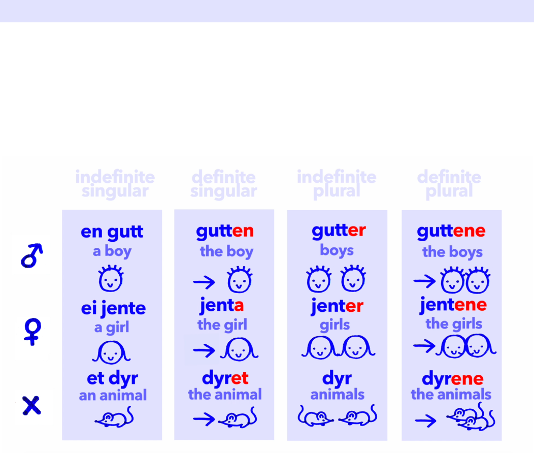 Norwegian Jo En, ei og et I am not a professional – there might be mistakes or typos. I’m just trying to provide some helpful resources:) En, ei and et: Norwegian Nouns and their Genders Introduction There are three grammatical genders in Norwegian. All nouns are split into these categories. They are hankjønn (masculine), hunkjønn (feminine) and intetkjønn (neuter). Conjugation Nouns in hankjønn, hunkjønn and intetkjønn Endings in red à added at the end of root *Note: Most intetkjønn words of more than one syllable receive the “-er” ending in the indefinite plural form. Although this is not true 100% of the time. Exceptions The rules above are not consistent with all Norwegian nouns, as many are irregular and therefore have special conjugations that can be found in a dictionary. Hunkjønn is optional Regular hunkjønn nouns can also be conjugated using the word endings of hankjønn. It is optional whether you choose to say “ei jente” or “en jente”. You can also choose to say “jenten” instead of “jenta”. Some dialects prefer to stick with hunkjønn conjugation, while others consistently conjugate hunkjønn nouns using the hankjønn endings. Norwegian Jo En, ei og et I am not a professional – there might be mistakes or typos. I’m just trying to provide some helpful resources:) List of regular Norwegian nouns and their conjugations Singular Plural Indefinite Definite Indefinite Definite Hankjønn (masculine) En hund A dog Hunden The dog Hunder Dogs Hundene The dogs En gutt A boy Gutten The boy Gutter Boys Guttene The boys En sau A sheep Sauen The sheep Sauer Sheep Sauene The sheep En gave A gift Gaven The gift Gaver Gifts Gavene The gifts En hest A horse Hesten The horse Hester Horses Hestene The horses En dag A day Dagen The day Dager Days Dagene The days Hunkjønn (feminine) Ei ku A cow Kua The cow Kuer Cows Kuene The cows Ei lampe A lamp Lampa The lamp Lamper Lamps Lampene The lamps Ei jente A girl Jenta The girl Jenter Girls Jentene The girls Ei sol A sun Sola The sun Soler Suns Solene The suns Ei stjerne A star Stjerna The star Stjerner Stars Stjernene The stars Ei veske A purse Veska The purse Vesker Purses Veskene The purses Intetkjønn (neuter) Et hus A house Huset The house Hus Houses Husene The houses Et lam A lamb Lammet The lamb Lam Lambs Lammene The lambs Et kart A map Kartet The map Kart Maps Kartene The maps Et rom A room Rommet The room Rom Rooms Rommene The rooms Et fly A plane Flyet The plane Fly Planes Flyene The planes Et dyr An animal Dyret The animal Dyr Animals Dyrene The animals Et gjerde* A fence Gjerdet The fence Gjerder* Fences Gjerdene The fences Et ansikt* A face Ansiktet The face Ansikter* Faces Ansiktene The faces Et teppe* A blanket Teppet The blanket Tepper* Blankets Teppene The blankets *indicates intetkjønn nouns of more than one syllable à indefinite plural ending becomes -er Examples of irregular noun conjugations Singular Plural Indefinite Definite Indefinite Definite Hankjønn (masculine) En bror A brother Broren The brother Brødre* Brothers Brødrene* The brothers En mann A man Mannen The man Menn* Men Mennene* The men Hunkjønn (feminine) Ei mus A mouse Musa The mouse Mus* Mice Musene The mice Ei mor A mother Mora The mother Mødre* Mothers Mødrene* The mothers Intetkjønn (neuter) Et museum A museum Museet The museum Museer* Museums Museene* The museums Et tre A tree Treet The tree Trær* Trees Trærne* The trees *indicates the form in which the irregularity occurs