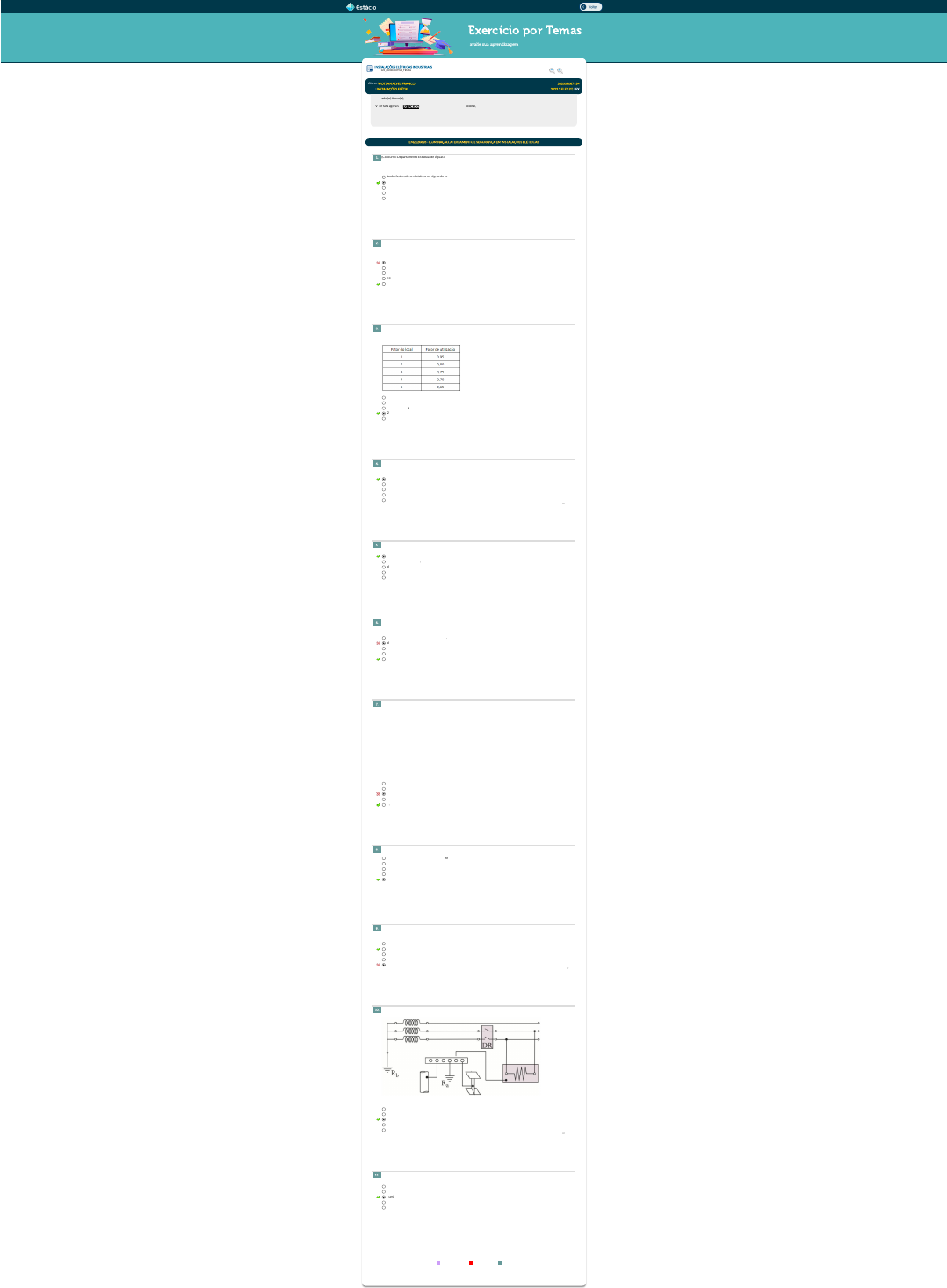 14/10/2023, 06:30 Estácio: Alunos https://simulado.estacio.br/bdq_simulados_exercicio_temas.asp#ancora_11 1/1 Exercício por Temas avalie sua aprendizagem (Concurso: Departamento Estadual de Águas e Saneamento do Acre, Cargo - Topógrafo, Banca - IBADE, 2019) Em caso de choque elétrico, os primeiros socorros devem ser prestados rapidamente. Em primeiro lugar, interromper o contato da pessoa com a fonte de eletricidade sem encostar diretamente na vítima; em seguida, chamar o resgate; veri�car se a pessoa está respirando ou se consegue se mexer ou emitir algum som; caso não veri�que nenhum sinal, é provável que a vítima: (Concurso: Prefeitura Municipal de São José dos Campos, Cargo - Engenheiro Eletricista, Banca - VUNESP, 2012) Pretende-se efetuar o projeto de luminotécnica de um recinto que possui 400 m² de área útil, onde é desenvolvida uma atividade cujo nível de iluminamento mínimo é de 150 lux. Assinale a alternativa que apresenta o �uxo luminoso total, considerando que os fatores de depreciação e utilização são 0,8 e 0,75, respectivamente. (Concurso: Tribunal de Justiça do Pará, Cargo - Engenheiro Eletricista, Banca - VUNESP, 2014) Uma edi�cação de uso comercial deve possuir o nível de iluminamento de 400 lux. O local possui comprimento de 40 m, largura de 10 m e altura útil de 4 m. Considerando que o fator de utilização pode ser obtido por meio da tabela, assinale a alternativa que apresenta corretamente o valor do �uxo luminoso total, que deve ser utilizado na determinação do número de lâmpadas. (Concurso: Universidade do Estado do Amapá, Cargo - Engenheiro Eletricista, Banca - UFG, 2014) A norma NBR 5410 da ABNT trata de instalações elétricas de baixa tensão. Entre os esquemas de aterramento propostos nessa norma, qual deles resultará em curto-circuito entre os condutores de fase e de neutro, na ocorrência de contato de uma fase com a carcaça de um equipamento aterrado? A passagem da corrente elétrica através do corpo humano, entre outros efeitos, é capaz de produzir queimaduras sérias. A ocorrência dessas queimaduras decorre: (Concurso: Universidade do Estado do Amapá, Cargo - Engenheiro Eletricista, Banca - UFG, 2014) Um dos métodos de cálculo luminotécnico mais empregado é o método dos lúmens, também conhecido método do �uxo luminoso. Nesse método, o cálculo do �uxo luminoso é afetado pelo coe�ciente de utilização que, por sua vez, depende: (Concurso: Instituto Federal do Mato Grosso, Cargo - Professor de Ensino Básico, Técnico e Tecnológico, Banca - UFMT, 2014) As alternativas numeradas a seguir apresentam tipos de lâmpadas elétricas e logo em seguida, com lacunas a ser preenchidas, temos a faixa típica de e�ciência luminosa em lúmens/watts de cada tipo. Agora faça a correlação. 1 - Lâmpada mista 2 - Lâmpada de multivapores metálicos 3 - Lâmpada de vapor de sódio de alta pressão 4 - Lâmpada de vapor de mercúrio ( ) 70 a 140 ( ) 42 a 63 ( ) 17 a 25 ( ) 70 a 115 Marque a sequência correta. Com base nos efeitos que a corrente elétrica pode causar ao corpo humano, assinale a alternativa INCORRETA. (Concurso: Companhia Paulista de Trens Metropolitanos, Cargo - Engenheiro Eletricista, Banca - CAIP-USCS, 2014) É previsto na NBR alguns tipos de aterramento. A esses tipos são atribuídas siglas que identi�cam o tipo de aterramento considerando os �os neutro, fase e terra. A seguir são descritos esses termos, exceto pelo que se lê na alternativa: (Concurso: Universidade Federal do Pará, Cargo - Engenharia Elétrica, CEPS, 2014) Observe o esquema de ligação de uma instalação elétrica na �gura a seguir em que se pode observar ligações equipotenciais e o uso do dispositivo de proteção à corrente diferencial residual (DR). Observando essa �gura, pode-se determinar que o tipo de esquema de ligação de aterramento é: (Concurso: Instituto Nacional de Seguridade Social, Cargo - Engenharia Elétrica, Banca - FUNRIO, 2014) Entre os dispositivos de comando, podemos citar os seguintes: dimmer, relé de impulso e minuteria. Esses dispositivos citados, em instalações prediais, são usados em: INSTALAÇÕES ELÉTRICAS INDUSTRIAIS Lupa DGT0122_202004087924_TEMAS Aluno: WOTSAN ALVES FRANCO Matr.: 202004087924 Disc.: INSTALAÇÕES ELÉTRI 2023.3 FLEX (G) / EX Prezado (a) Aluno(a), Você fará agora seu EXERCÍCIO! Lembre-se que este exercício é opcional, mas não valerá ponto para sua avaliação. O mesmo será composto de questões de múltipla escolha. Após responde cada questão, você terá acesso ao gabarito comentado e/ou à explicação da mesma. Aproveite para se familiarizar com este modelo de questões que será usado na sua AV e AVS. EM2120628 - ILUMINAÇÃO, ATERRAMENTO E SEGURANÇA EM INSTALAÇÕES ELÉTRICAS 1. tenha fraturado as vértebras ou algum dos ossos da bacia; tenha sofrido uma parada cardíaca ou cardiorrespiratória. esteja apenas desacordada; esteja sob efeito de álcool; tenha sofrido um colapso nervoso; Data Resp.: 14/10/2023 06:21:35 Explicação: A resposta certa é: tenha sofrido uma parada cardíaca ou cardiorrespiratória. 2. 125.000 lúmens 75.000 lúmens 200.000 lúmens 150.000 lúmens 100.000 lúmens Data Resp.: 14/10/2023 06:22:41 Explicação: A resposta certa é: 100.000 lúmens 3. 230.000 lúmens 240.000 lúmens 220.000 lúmens 200.000 lúmens 210.000 lúmens Data Resp.: 14/10/2023 06:27:27 Explicação: A resposta certa é: 200.000 lúmens 4. TN-C TN-C-S TN-S TT IT Data Resp.: 14/10/2023 06:27:54 Explicação: A resposta certa é: TN-C 5. do Efeito Joule; da alta potência elétrica; da alta tensão elétrica; da alta condutividade da pele. da conservação da corrente elétrica; Data Resp.: 14/10/2023 06:28:07 Explicação: A resposta certa é: do Efeito Joule; 6. das dimensões do ambiente a ser iluminado. do nível de iluminamento em lux ou iluminância; da quantidade de lâmpadas utilizadas na iluminação do local; do fator ou 