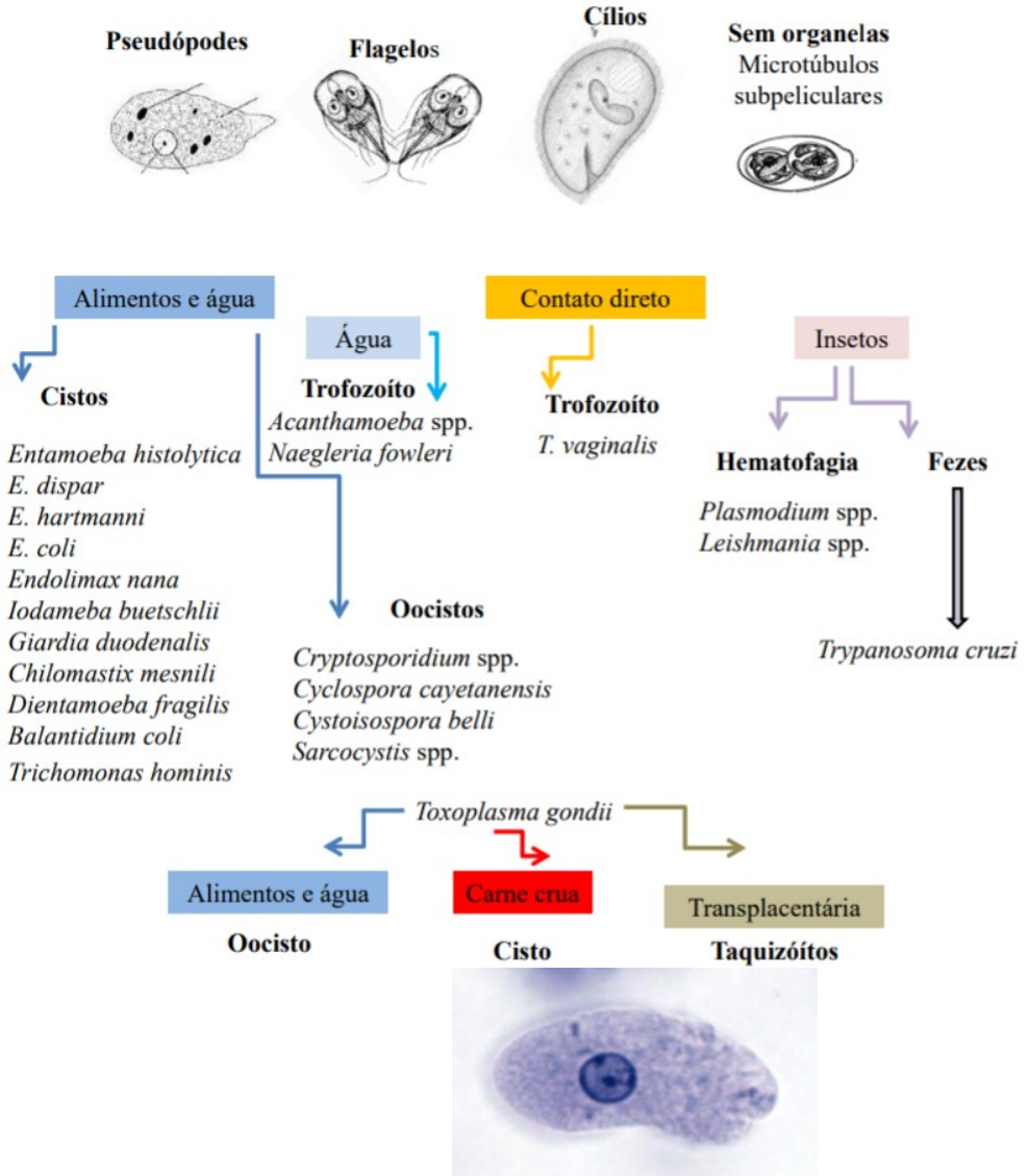 Amebas patogênicas, comensais e de vida livre Protozoário – unicelular, material genético, eucarionte. Trofozoíto – adulto ativo, está no hospedeiro. Podem ser pseudópodes (projeção, movimentos ameboides), flagelos, cílios ou sem organelas. Cisto – no ambiente. Oocisto – tem macho e fêmea. Trofozoíto cria cápsula, espécie de membrana para guardar o material genético e se multiplicar por fissão binária. Filo Sarcomastigophora Subfilo Sarcodina Classe Lobozea Ordem Amoebida Família Entamoebidae Gêneros Entamoeba Iadomoeba Endolimax Grupo coli: cistos com 8 núcleos – E. coli (cuidado!) Grupo histolytica: 4 núcleos – E. histolytica (patogênica), E. dispar (não patogênica) 1 núcleo – E. polecki Cistos não-conhecidos: E. gingivalis Roda de carroça – cromatina, não se locomove · Qual a importância em saúde pública de se encontrar cisto de amebas comensais em alimentos e água? Se encontrar, é sinal que o animal está bebendo água contaminada com fezes. Entamoeba histolytca X E. dispar E. histolytica – Diversos graus de virulência, invasiva, diversas formas clínicas. E. dispar – Pode causar erosões na mucosa intestinal, sem invasão, maior parte dos casos são assintomáticos. Entamoeba histolytica · Vive na luz do intestino grosso. Ingere, chega no intestino grosso e sai, mas pode atravessar a parede e invadir diversos órgãos. · Podem viver também nas úlceras que provocam na mucosa e submucosa. · Diversas formas clínicas: lesões hepáticas, pulmonares, cutâneas e cerebrais, sob a forma de abscessos. · É a única que fagocita hemácia para se alimentar. · Locomoção por pseudópodes. · Alimentação por fagocitose. · Multiplicação por fissão binária. Metacisto -----> Trofozoíto -----> Pré-cisto -----> Cisto Ciclo não patogênico – correto no IG X Ciclo patogénico – errádico No ciclo patogênico, invade as vísceras, causa patogenia, mas não sai mais de lá. Na diarreia, pode não ter tempo de criar cistos, pode sair diretamente o trofozoíto. Patogenia · Invasão dos tecidos – parasito virulento · Adesão – destruição – quebra das barreiras teciduais · Ulceração do tipo “botão de camisa” · Trofozoítos: resposta inflamatória proliferativa (ameboma) · Penetram os vasos – circulação porta. Manifestações clínicas Período de incubação: difícil de determinar (7 dias a 4 meses) Amebíase intestinal Formas assintomáticas – 80 a 90% e a infecção é detectada pela presença de cistos nas fezes. (E. histolytica/ E. dispar) Formas sintomáticas – Colite não disentérica – crises de diarreia com um menor número de dejeções, com muco ou sangue com dores abdominais em cólica, flatulência e sensação de desconforto abdominal (E. histolytica). Colite disentérica – diarréia, dores abdominais e tenesmo, diarreia com evacuações muito frequentes, fezes líquidas, muco-sanguinolentas, lesão ulcerativa e inflamação do intestino, pode ter náuseas, vômitos, mal estar geral, prostação, anorexia e febre de pequena intensidade. Amebíase hepática Hepatite amebiana aguda: dor, febre e mal estar geral, hepatomegalia discreta, febre frequente, exacerbações noturnas, calafrios, suores noturnos, anoxeria, persa de peso e as vezes surtos diarreicos. Métodos de diagnóstico · Clínico – inespecífico. · Laboratorial – EPF: melhor forma. Cariossoma central ou lateral · Biopsia intestinal – ver trofozoítos. · Imunológico – importante em amebíase extra-intestinal. Imunoenzimático (ELISA) e imunofluorescência indireta. Profilaxia · Detectar os portadores assintomáticos e trata-los. · Medidas gerais de higiene. · Lavar alimentos crus. · Destino adequado dos dejetos. · Ferver a água de consumo. · Exterminar os insetos vetores. · Conscientizar os manipuladores de alimentos. · Saneamento básico. Tratamento Alguns medicamentos como: Metronidazol (Meatronidazol, Fragyl), Tinidazol (Facyl 500, Fasigyn, Pletil, Amplium), Teclosan (Falmonox), Etofite (Kitnos), Ornidazol (Tiberal). Epidemiologia Segunda principal causa de morte por parasitoses mundial. Saneamento ambiental · Melhorar sistema de abastecimento de água. · Criar rede de esgoto e tratamento adequado de esgoto doméstico. · Tratar adequadamente a água fornecida à população. · Incentivar uso de filtro doméstico. · Não permitir o uso de fezes humanas como adubos. · Combater moscas e baratas. · Remover adequadamente o lixo doméstico. Medidas específicas · Identificação e tratamento das fontes de infecção sintomáticos e assintomáticos. · Proteção de indivíduos de alto risco. Amebas de vida livre (anfizóicas) Parasitos oportunistas: água doce, salgada, ambientais naturais e artificiais. - Cisto: solo e poeira. - Trofozoíto: água. Naegleria fowleri - Cisto, trofozoíto amebóide e forma biflagelada. - Pseudópodes: lobópodes. - Termófilas: piscinas aquecidas (até 45ºC) Patogenia · Meningoencefalite amebiana primária. · Progressão rápida (morte em 1 semana). · Penetração pela mucosa nasal – renite, dor de cabeça, SNC) Acanthamoeba spp. - Cisto e trofozoíto amebóide. - Pseudópodes: acontopódios. - Lentes de contato. Patogenia · Encefalite amebiana granulomatosa – imunocomprometidos · Doença de curso prolongado. · Causa ceratite – perfuração da córnea, enucleação. Diagnóstico e tratamento · Clínico: Rinite, cefaléia, febre, náuseas (anamnese). · Laboratorial: Exame de LCR, biópsia SNC, imunofluorescência, ELISA, imunoblot. · Tratamento - Sem medicação específica eficiente. - Miconazol, rifampicina, anfotericina B. - Ceratites: colírios e pomadas (neomicina, isotianato de propamida), via oral (cetoconazol e itraconazol), transplante de córnea.