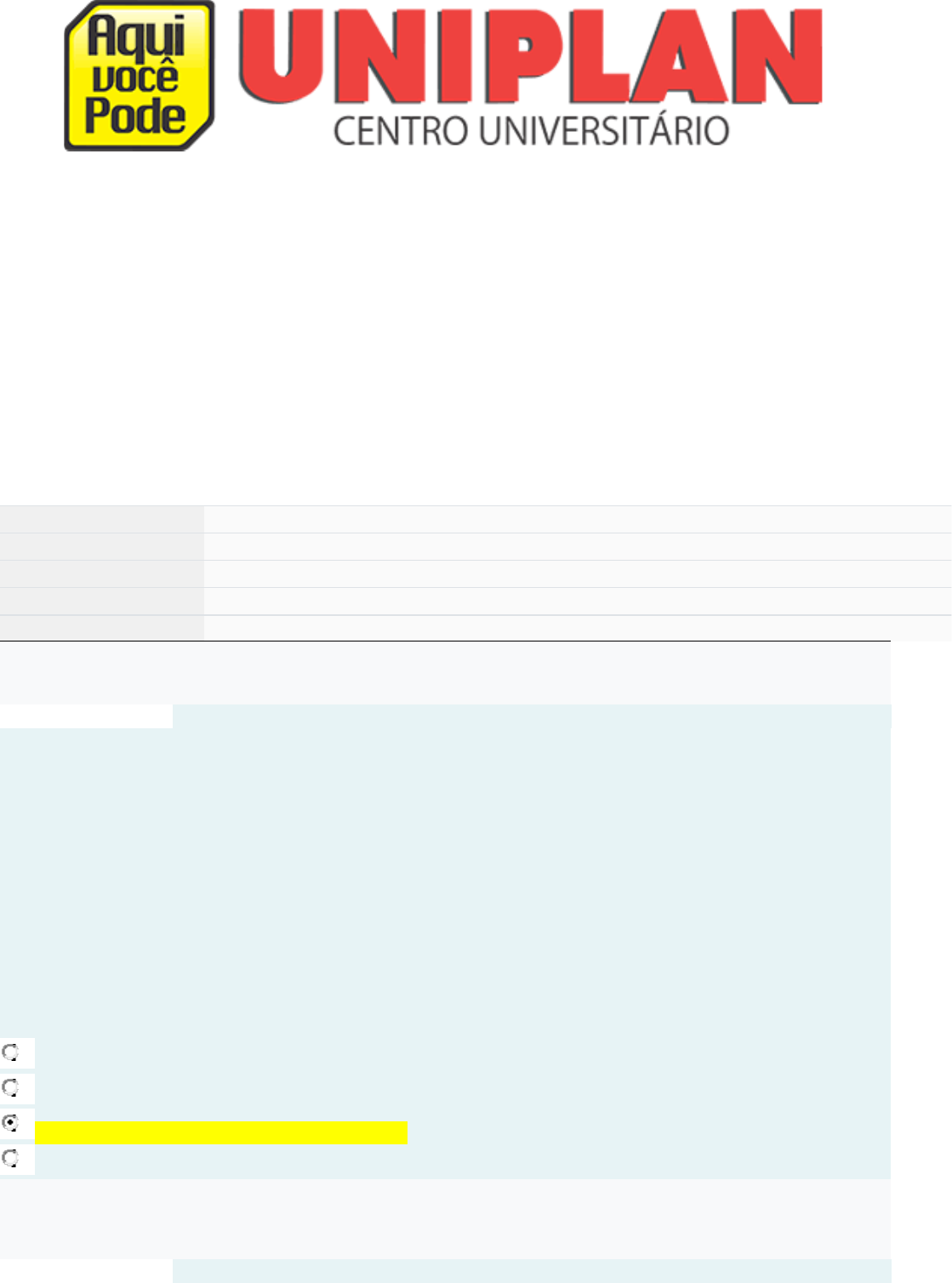 ESTUDOS DISCIPLINARES VII Questionário Online Iniciado em domingo, 15 out. 2023, 10:33 Estado Finalizada Concluída em domingo, 15 out. 2023, 11:10 Tempo empregado 36 minutos 18 segundos Avaliar 10,00 de um máximo de 10,00(100%) Parte superior do formulário Questão 1 Completo Atingiu 1,00 de 1,00 Texto da questão Em seu livro intitulado “Medienforschung” (Investigação da Mídia), Harry Pross discorre a respeito dos tipos de comunicações praticadas pelo homem, dividindo-as em três tipos de mídias. Assim, tem-se: I) Mídia primária, na qual um corpo utiliza uma ferramenta ou suporte para se comunicar com outro. II) Mídia secundária, quando dois corpos utilizam a mesma ferramenta para se comunicarem. III) Mídia terciária, situação em que o corpo é o principal meio de comunicação entre os seres. Qual(is) afirmação(ões) está(ão) correta(s)? Escolha uma opção: a. Apenas III b. Apenas I. c. Nenhuma das afirmações (I, II e III). d. Afirmações I e II. Questão 2 Completo Atingiu 1,00 de 1,00 Texto da questão Das afirmações a seguir sobre o cenário da Internet: I) O que vivemos na Internet, em especial as crianças e adolescentes, perpassa pelo processo da infantilização/ser adulto, que é presente em diferentes gerações, ao longo da civilização humana. II) O processo de escrita e inserção da linguagem é mais demorado e “castrador”, solicitando comedimento, reflexão, respeito aos modelos ou cânones sociais vigentes num determinado cenário. Ao evitar esse processo, acelerado pelo volume de informações, há um confronto entre viver a vida de forma hedonista, rápida ou individualista com um cenário antagônico, ou seja, mais formal, respeitoso e com pitadas de politicamente correto. III) No meio confronto entre cultura oral e escrita, temos presentes práticas que extrapolam o bom senso, em páginas e conteúdos digitais: o deboche, o confronto velado, a ironia e as pulsões amorosas, vingativas (porn revenge). IV) A partir do momento que podemos ser qualquer um (avatarismo), sem qualquer filtro, julgamento social, os extremos aparecem: do choro à idealização amorosa, da raiva futebolística e sexual até o famoso “não li e odeio”. Após a leitura, quais das afirmações estão corretas? Escolha uma opção: a. Todas as afirmações (I, II, III e IV). b. Afirmações I e III. c. Afirmações II e III. d. Afirmações I, II e III. Questão 3 Completo Atingiu 1,00 de 1,00 Texto da questão Os conceitos cunhados por Allouch (1995) seriam transcrever, traduzir e transliterar. Assim: I) Por meio da transcrição, aquele que escreve faz uma interpretação dos conteúdos, respeitando a ideia do preceito lido ou observado. II) Por meio da tradução, aquele que escreve faz apenas uma cópia direta das informações lidas ou observadas, nada mais do que isso. III) Por meio da transliteração, aquele que escreve se interroga a respeito das diferenças que são ou não representativas no sistema de representação em si. Ele precisa compreender, por exemplo, que ao contrário do que ocorre com o uso das letras maiúsculas e minúsculas, o tom da tinta azul com a qual escreve é um elemento irrelevante no sistema de representação alfabético. Quais afirmações estão incorretas? Escolha uma opção: a. Afirmações I e II. b. Afirmações I e III. c. Nenhuma das afirmações. d. Todas as afirmações (I, II e III). Questão 4 Completo Atingiu 1,00 de 1,00 Texto da questão Complete as lacunas a seguir: Portanto, pode-se dizer que um _______ espaço _______ está em fase de _______, cujas características são: o _______ das competências e das habilidades, o respeito ao ritmo _______, a formação de comunidades de _______ e as redes de _______, entre outras. Escolha uma opção: a. Recente – pedagógico – gestação – registro – individual – aprendizagem – vivência. b. Novo – pedagógico – gestação – desenvolvimento – individual – aprendizagem – convivência. c. Novo – pedagógico – manutenção – desenvolvimento – coletivo – aprendizagem – convivência. d. Novo – psicológico – manutenção – desenvolvimento – coletivo – aprendizagem – vivência. Questão 5 Completo Atingiu 1,00 de 1,00 Texto da questão Sobre as quatro fases da Internet: I) A Internet 1.0 busca oferecer possibilidades de inserir dados, permitindo ao usuário a interação – direta ou indireta – com o conteúdo e possíveis proprietários da página. Além disso, é possível configurar o recebimento de determinados conteúdos, como RSS. II) A Internet 2.0, além de ser uma “web inteligente”, antecipará decisões, por meio do banco de números e dados previamente estabelecidos em seus big data. Serão máquinas que estarão um passo à frente do nosso cotidiano, lidando com “inteligência artificial” (não confundir com o filme). Um exemplo seria um avião que, por meio de suas ferramentas e sensores, oferece ao piloto opções de voo sem a necessidade de decisões a serem tomadas rapidamente. III) A Internet 3.0 consiste no envio e troca de informações, cuja estrutura é estática, repleta de textos e imagens de baixa resolução. Além disso, não há sequer a possibilidade de interação/alteração com os elementos inseridos. Nesse momento, é possível apenas ler os conteúdos nela presentes. IV) A Internet 4.0 é uma “web inteligente”, embora não permita a apropriação de conteúdos, reestilizando-os do seu jeito (vídeos, memes, troll faces etc.), ela também não possibilita acesso aos dados e cliques do usuário. Contudo, permite uma interação entre as suas escolhas e possíveis produtos ou serviços a serem ofertados ou vendidos. Após a leitura, quais afirmações estão incorretas? Escolha uma opção: a. Afirmações II, III e IV. b. Afirmações I, II e III. c. Todas as afirmações. d. Afirmações I, II e IV. Questão 6 Completo Atingiu 1,00 de 1,00 Texto da questão A respeito do me