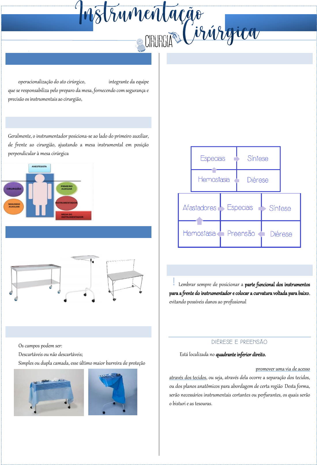 Anna Beatriz Fonseca | MED UNIFTC 2021.1 – 4º semestre INTRODUÇÃO A instrumentação cirúrgica é uma técnica utilizada pelo instrumentador para operacionalização do ato cirúrgico, sendo esse, integrante da equipe que se responsabiliza pelo preparo da mesa, fornecendo com segurança e precisão os instrumentais ao cirurgião, acompanhando a sequência lógica de cada tempo cirúrgico durante o ato operatório. RELEMBRANDO POSIÇÃO DO INSTRUMENADOR Geralmente, o instrumentador posiciona-se ao lado do primeiro auxiliar, de frente ao cirurgião, ajustando a mesa instrumental em posição perpendicular à mesa cirúrgica. Obs.: Lembre-se que dependendo da cirurgia e da equipe, a posição pode ser outra. Figura 1: Posição da equipe cirúrgica. MESA INSTRUMENTAL Existem variados tipos de mesas instrumentais: Figura 2: Respectivamente: Mesa instrumental convencional, Mayo, Com Varal/Ganchos. CAMPOS DA MESA INSTRUMENTAL  Os campos podem ser: o Descartáveis ou não descartáveis; o Simples ou dupla camada, esse último maior barreira de proteção. Figura 3: Respectivamente: Mesa convencional e a de Mayo já com a colocação de campo. ARRUMAÇÃO DA MESA INSTRUMENTAL Existem algumas regras gerais que norteiam a arrumação da mesa instrumental, porém essa organização varia de acordo com cada serviço, sendo que cada instrumentador dispõe os materiais na ordem que melhor se adapta.  Os quadrantes normalmente seguem a ordem dos tempos cirúrgicos, ou seja, a ordem em que cada manobra será realizada pelo cirurgião, permitindo, assim, uma maior agilidade na operação e melhor coordenação entre o instrumentador e o cirurgião. Figura 4: Respectivamente, arrumação em 04 e em 06 quadrantes. TEMPOS CIRÚRGICOS Lembrar sempre de posicionar a parte funcional dos instrumentos para a frente do instrumentador e colocar a curvatura voltada para baixo, evitando possíveis danos ao profissional.  Instrumento não montado fica com a parte funcional voltada “contra” o instrumentador. DIÉRESE E PREENSÃO  Está localizada no quadrante inferior direito. A diérese é a manobra cirúrgica destinada a promover uma via de acesso através dos tecidos, ou seja, através dela ocorre a separação dos tecidos, ou dos planos anatômicos para abordagem de certa região. Desta forma, serão necessários instrumentais cortantes ou perfurantes, os quais serão o bisturi e as tesouras.  Os bisturis podem ser de vários tipos (ex.: com cabo de encaixe para lâminas, elétricos e harmônicos) e são utilizados para incisões e dissecções de estruturas. Existem vários tipos de cabos, esses são escolhidos pelo porte e tipo de cirurgia, sendo os mais utilizados o cabo n°3 e cabo n°4: Auana Coppieters Destacar Auana Coppieters Destacar Auana Coppieters Destacar Auana Coppieters Destacar Auana Coppieters Destacar Auana Coppieters Destacar Auana Coppieters Destacar Auana Coppieters Destacar Auana Coppieters Destacar Auana Coppieters Destacar Auana Coppieters Destacar Auana Coppieters Destacar Anna Beatriz Fonseca | MED UNIFTC 2021.1 – 4º semestre o Cabo n° 3: Adapta-se às lâminas de n° 9 ao n°19 (há literaturas que trazem no 9 ao no 17); o Cabo n°4: Adapta-se às lâminas de n° 20 ao no 50 (há literaturas que trazem no 18 ao no 50). Empunhadura do Bisturi: Existem duas formas principais de se empunhar um bisturi, são elas: tipo lápis (incisões pequenas, conferindo maior delicadeza e precisão) e tipo arco de violino (incisões longas, retilíneas ou de curvas suaves). Figura 5: Respectivamente: Tipo Lápis/Caneta e tipo arco de violino.  Tesouras: Tem como função principal efetuar cortes ou divisão de tecidos orgânicos, além de cortar materiais. As tesouras variam no tamanho (grande, média e pequena), no formato da ponta (pontiaguda e romba), na curvatura (curva e reta), lâmina (simples ou serrilhada). Cada tesoura possui uma finalidade específica e adequada a cada fase do ato operatório e à especialidade cirúrgica. Existem vários modelos, dentre eles se destacam: o Tesoura de Mayo: Utilizada para secção de fios e outros materiais cirúrgicos na superfície ou em cavidades. É considerada uma tesoura mais traumática, pois sua parte cortante é proporcional à parte não cortante. o Tesoura de Metzenbaum: Utilizada para diérese de tecidos orgânicos, podem ser utilizadas em cavidades, introduzindo- as a fundo. Considerada menos traumática, pois apresenta sua porção cortante mais curta do que a não cortante. Figura 6: Respectivamente, Tesouras de Mayo e Metzenbaum. Empunhadura da tesoura: Introduzir as falanges distais dos dedos anular e polegar nas argolas. O dedo indicador proporcionará precisão ao movimento e o dedo médio auxiliará na estabilidade da mão. Figura 7: Empunhadura da tesoura. !!!Obs.: Quando é utilizada a tesoura reta e a tesoura curva? A tesoura reta é mais utilizada para auxiliar fora da cavidade, ex.: corte de fios, já as curvas são mais utilizadas pelo cirurgião, ex.: dentro das cavidades, por observar mais facilmente a ponta da tesoura. !!!Obs.2: Como é uma diérese ideal? Extensão adequada; Bordas nítidas; Um plano de cada vez, respeitando a anatomia regional; Não comprometer grandes vasos e nervos; Acompanhar as linhas de forca da pele; Seccionar os tecidos na direção das suas fibras. Os instrumentos de preensão são basicamente constituídos pelas pinças de dissecção, as quais estão destinadas à manipulação e à apreensão de órgãos, tecidos ou estruturas. Os modelos mais utilizados são:  Pinça de Adson: Possui um tamanho reduzido (bastante utilizadas em cirúrgicas pediátricas). Pode ser traumática ou atraumática; Figura 8: Respectivamente, pinça de Adson atraumática e traumática. !!!Obs.: Traumática X Atraumática: A pinça traumática apresenta dentes na extremidade, já a pinça atraumática possui ranhuras transversais e finas na face interna de suas pontas.  Pinça Anatômica: Utilizada para preensão d