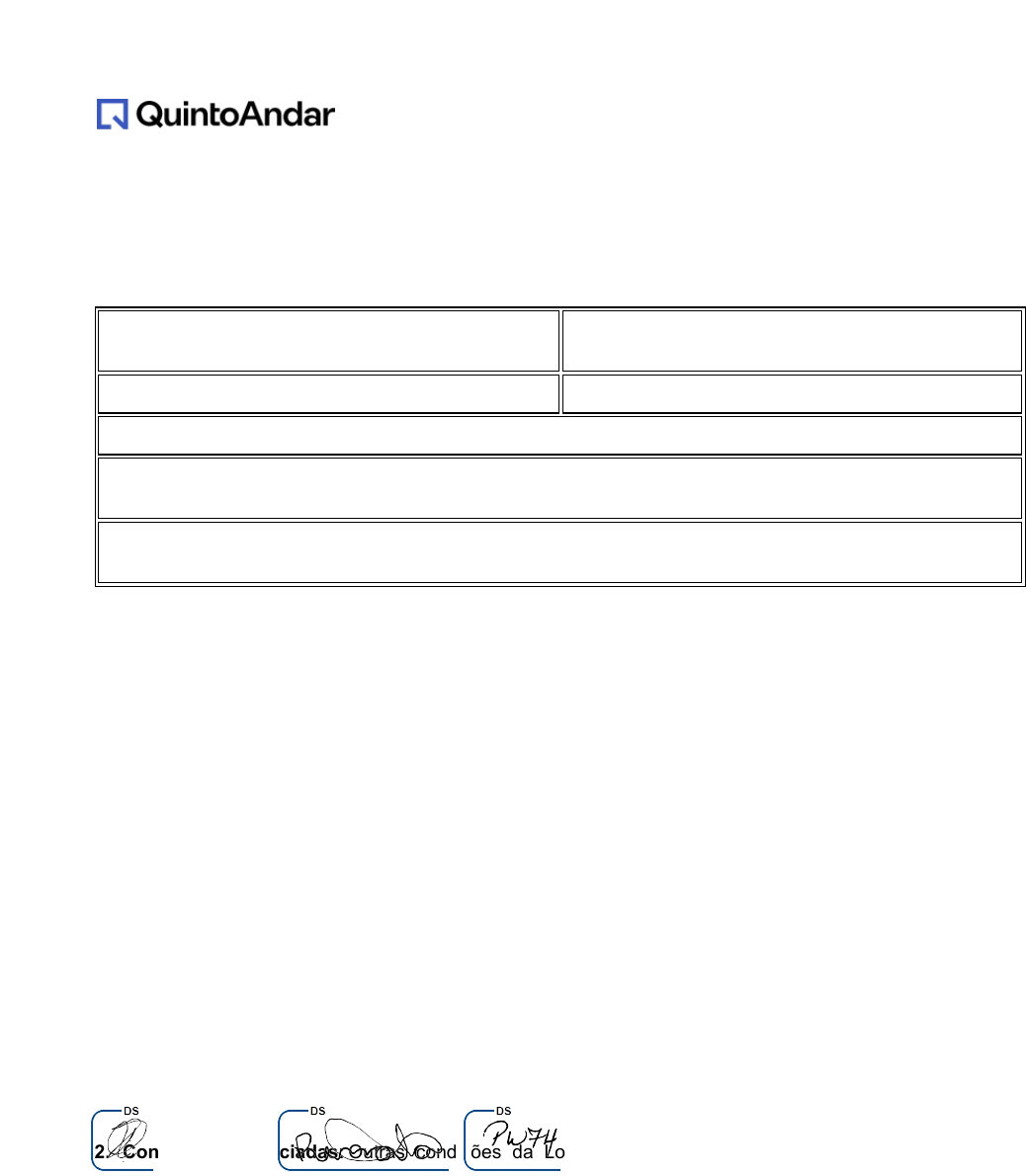 Contrato: v12.3_02/2023, nº 493681_547529L Contrato de Locação Residencial Imóvel: Apartamento 108 HB, localizado à Avenida Baltazar de Oliveira Garcia, no. 2770, Rubem Berta, Porto Alegre - RS, CEP: 91150-000 , código QuintoAndar, 893193681, que tem fim exclusivamente residencial. Aluguel inicial: R$ 550 (quinhentos e cinquenta reais) por mês Condomínio Total: Aproximadamente R$ 155 (cento e cinquenta e cinco reais) por mês IPTU: R$ 25 (vinte e cinco reais) por mês Seguro Contra Incêndio: R$ 9 (nove reais) por mês Vaga de Garagem: 0 Prazo da Locação: o Contrato terá prazo de 30 meses, iniciado no dia ( 12/06/2023 ) e com fim em ( 12/12/2025 ) Primeiro Pagamento: 17/06/2023 Após o Primeiro Pagamento, o Boleto da Locação vencerá normalmente no dia 7; Inquilino(s): Renata Oliveira Da Cunha Lima, CPF: 862.906.570-20 Peterson Welliton Fagundes Hebert, CPF: 601.102.210-36, denominado(s), daqui em diante, de “Inquilino”; Locador(es): Douglas Edson Schereiber, CPF: 008.088.770-89, denominado(s), daqui em diante, de “Locador”; Disposições Gerais 1. Regras da Locação: Este Contrato existe para trazer os direitos e deveres de cada Parte na Locação do Imóvel. O Contrato vai retratar, da melhor forma possível, cada etapa do dia a dia dessa relação. Fazem parte do Contrato as Regras da Locação, vigentes à época da contratação e disponíveis em "quin.to/regras- locacao-547529” que vão aprofundar os detalhes, com o objetivo de tirar qualquer dúvida das Partes e criar condições para resolver problemas deste Contrato. São aplicáveis as Regras da Locação vigentes à época da assinatura do Contrato. Todos os itens em azul possuem maiores definições nas Regras da Locação. Ao rubricar aqui, as Partes confirmam que as minutas do Contrato e das Regras da Locação foram disponibilizados para análise de ambas as Partes anteriormente à contratação, além de terem lido e estarem de acordo com as disposições: _iniP_00808877089 _iniI_86290657020 _iniI_60110221036 _iniP_123 _iniP_123 2. Condições Negociadas: Outras condições da Locação, combinadas diretamente na Plataforma entre Locador e Inquilino , além do aluguel e encargos locatícios já negociados, estarão descritas no final desse documento, em um Anexo, quando aplicável. 2.1. Negociações posteriores: quaisquer alterações dos termos aqui dispostos só serão consideradas parte integrante deste Contrato se realizada pelas Partes por meio da Plataforma e de acordo com suas regras de utilização. 3. Vistorias: Serão feitas Vistorias de Entrada e Saída para registrar as condições do imóvel no início e fim da Locação. Caso uma Parte encontre qualquer divergência, deverá apontá-la e comprová-la, com fotos, no prazo de 5 dias do recebimento do laudo, sob pena de aceitar integralmente a vistoria apresentada. 4. Garantia locatícia: tendo em vista que o Inquilino não apresentou garantias, o presente Contrato é celebrado sem quaisquer das garantias previstas na Lei do Inquilinato, possibilitando a cobrança antecipada de aluguéis. Aluguel e Encargos Locatícios 5 . Aluguel, IPTU e Seguro Contra Incêndio: O Inquilino deverá pagar mensalmente, até o dia 7 de cada DocuSign Envelope ID: B163233F-2997-4FB6-A694-9F9A86312AEE mês, o Boleto da Locação, que conterá o valor do aluguel, referente ao mês vigente, além dos valores de IPTU e do Seguro Contra Incêndio, conforme o quadro resumo no início do Contrato, e respeitada a regra do Primeiro Pagamento. 5.1. Primeiro Pagamento: Se a locação iniciar entre os dias 1º e 20 (inclusive) o vencimento do Primeiro Pagamento será após 5 dias da Data do Início da Locação. Se a locação iniciar após o dia 20, o vencimento será no dia 7 do mês subsequente, conjuntamente com o devido no segundo mês. 5.2. IPTU: A Administradora irá cobrar do Inquilino o valor da cota mensal do IPTU (valor anual dividido por 12 meses), que será repassado ao Locador, o qual deve pagá-lo diretamente à Prefeitura. 5.3. Seguro Contra Incêndio: O Inquilino ficará responsável pelo pagamento do prêmio do Seguro Contra Incêndio contratado. As especificações do Seguro Contra Incêndio padrão estão disponíveis em "quin.to/seguroincendio". Caso as Partes tenham decidido contratar Seguro Contra Incêndio diverso do indicado no link "quin.to/seguroincendio", as especificações de tal seguro deverão ser buscadas diretamente com a seguradora em questão. 5.4. O Inquilino e o Locador declaram neste ato ter (i) sido disponibilizada, (ii) lido e (iii) aceitado as condições gerais do Seguro Contra Incêndio (Condições Gerais do Seguro Compreensivo Residencial) indicado pelo QuintoAndar, disponível em "quin.to/termosdoseguroincendio". 5.5. O Inquilino e o Locador declaram ter ciência de que a contratação do Seguro Contra Incêndio indicado pelo QuintoAndar é facultativa. Caso solicitem ou aprovem a contratação de seguro diverso, as partes reconhecem que (i) o QuintoAndar não será responsável por auxiliar o Inquilino e/ou o Locador no eventual acionamento da Apólice de Seguro Complementar Contra Fogo; e (ii) a abrangência da cobertura do outro seguro poderá ser eventualmente menor do que a do Seguro Contra Incêndio indicado pelo QuintoAndar, razão pela qual o QuintoAndar recomendará, nestes casos, que o Inquilino e o Locador sigam com o seguro indicado pelo QuintoAndar, sendo o Locador o único responsável pela aprovação ou não da apólice diversa. 6. Boleto do Condomínio: É responsabilidade do Inquilino obter e pagar o Boleto do Condomínio junto à Administração do Condomínio, conforme disposto em "quin.to/regras-locacao-547529#boleto_condo” . O Inquilino está ciente que os valores dos Encargos Locatícios descritos neste Contrato são de referência, pois são calculados por terceiros e estão sujeitos a alterações que fogem do controle do Locador e da Administradora. O Inquilino está ciente ainda que o valor do 