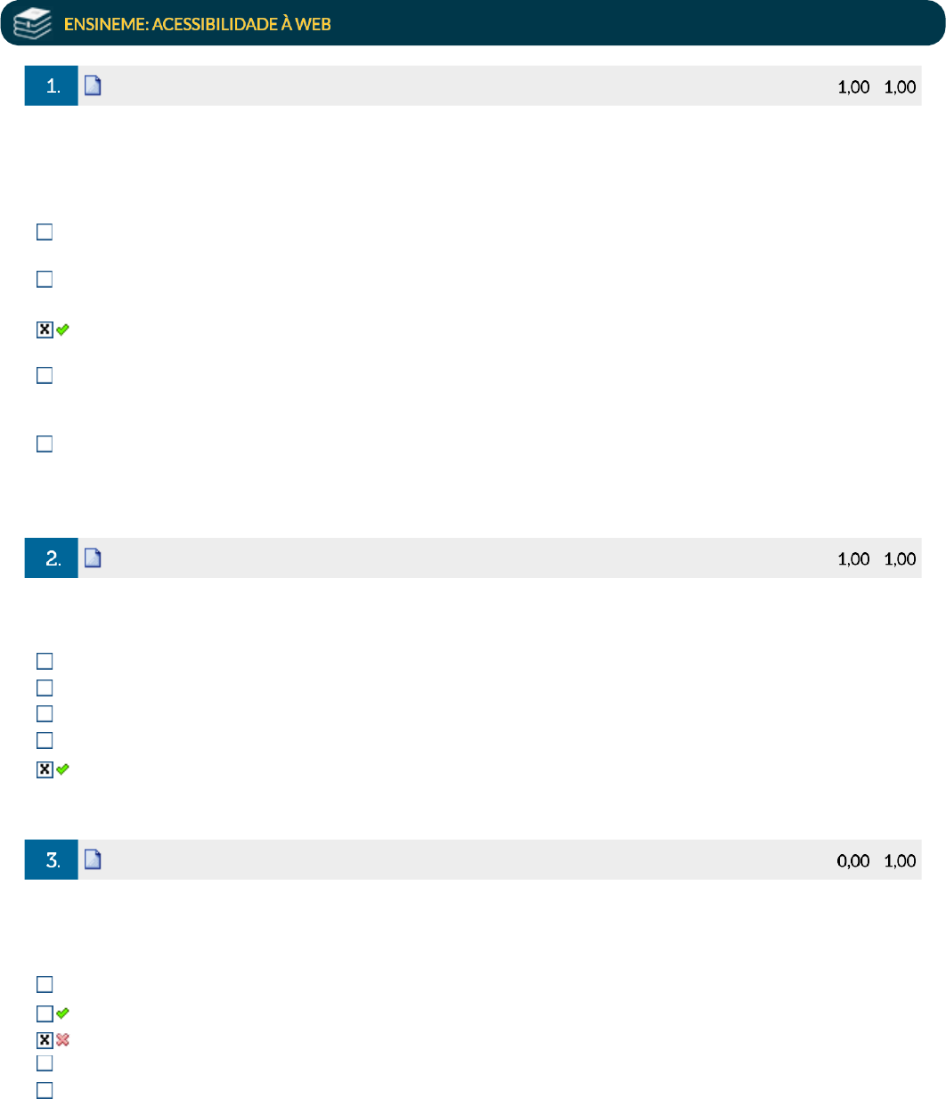 ( ENSINEME: ACESSIBILIDADE À WEB ) ( Pontos: 1,00 / 1,00 Ref.: 7815529 1. ) (Avança SP/2022 - Adaptada) Uma lei é um conjunto de regras e normas estabelecidas por uma autoridade competente, seja ela legislativa, executiva ou judiciária. A lei tem como objetivo regular o comportamento das pessoas e das instituições, promover a justiça, a ordem e a segurança na sociedade. Segundo a Lei 13.146/15, o Estatuto da Pessoa com Dekciência, entende-se por desenho universal: É um princípio, um preceito, uma norma, criada para estabelecer as regras que devem ser seguidas, é um ordenamento. Norma determinada e aprovada, consensualmente pela maioria, ou por uma autoridade, que é usada como base para estabelecer uma comparação. Aquilo que serve para ser imitado como modelo; protótipo. Concepção de produtos, ambientes, programas e serviços a serem usados por todas as pessoas, sem necessidade de adaptação ou de projeto especíkco, incluindo os recursos de tecnologia assistiva. Arte de representar, ou criar formas, utilizando materiais como lápis, carvão, pincel. Diferencia-se da pintura e da gravura, por ser considerado tanto como processo quanto como resultado artístico, uma obra bidimensional composta por linhas, pontos e formas. Um conjunto de requisitos e especikcações, que fornecem diretrizes para que produtos, processos ou serviços em uma empresa atendam a qualidade esperada. ( Pontos: 1,00 / 1,00 Ref.: 7815526 2. ) (FAU/2019) No que dispõe o Estatuto da Pessoa com Dekciência, a possibilidade e condição de alcance para utilização, com segurança e autonomia, de espaços, transportes, informação e comunicação, correspondem a: Adaptações razoáveis. Ajuda técnica. Barreiras urbanísticas. Desenho universal. Acessibilidade. ( Pontos: 0,00 / 1,00 Ref.: 7699042 3. ) O desenvolvedor de conteúdo (código) Web é o prokssional responsável pela codikcação semântica do conteúdo Web. Qual a dica de boas práticas pode apoiar este prokssional no cumprimento dos requisitos das chamadas Diretrizes de Acessibilidade de Conteúdo da Web (WCAG): Forneça saturação sukciente entre o primeiro e o segundo plano de uma imagem. Associe um rótulo a cada campo de entrada de um formulário. Forneça títulos redundantes e exclusivos. Utilize a validação CAPTCHA sempre que possível. Descarte transcrições e legendas para multimídia, optando pela utilização de recursos mais interativos. ( 21/07/23, 00:52 ) ( EPS ) ( https://simulado.estacio.br/alunos/ ) ( 1 /4 ) ( ENSINEME: AVALIAÇÃO DE INTERFACE HUMANO COMPUTADOR ) ( Pontos: 1,00 / 1,00 Ref.: 7814032 4. ) (IBFC/2022 - Adaptada) Leia a frase abaixo referente às técnicas de Teste de Software: "O teste estrutural é também conhecido como assim como o teste funcional é também conhecido especikcamente como sendo o ". Assinale a alternativa que preencha correta e respectivamente as lacunas. teste da caixa preta / teste da caixa branca teste da caixa cinza / teste da caixa preta teste da caixa preta / teste da caixa cinza teste da caixa branca / teste da caixa preta teste da caixa branca / teste da caixa cinza ( Pontos: 1,00 / 1,00 Ref.: 3992576 5. ) Avaliação de usabilidade é parte integrante do processo de design de interfaces com o usuário. As técnicas de avaliação existentes podem ser categorizadas de várias formas, mas uma delas focaliza se a avaliação é feita envolvendo ou não usuários. Considere as akrmações abaixo. I - Avaliação Heurística é uma técnica de avaliação que NÃO envolve usuários. II - Inspeção é uma técnica de avaliação que NÃO envolve usuários. III - Estudo de Campo é uma técnica de avaliação que NÃO envolve usuários. Quais estão corretas? Apenas I Apenas I e III I, II e III Apenas I e II Apenas II e III ( Pontos: 1,00 / 1,00 Ref.: 7696156 6. ) A inspeção por lista de verikcação (checklist) é uma técnica de avaliação de interface humano-computador baseado na verikcação da usabilidade do sistema com base em uma lista pré-deknida, a qual deverá ser percorrida por todos os avaliadores. A elaboração das questões da lista de verikcação deve ser fundamentada na aplicação de critérios ergonômicos. Qual destes itens fazem parte dos critérios deknidos por BASTIEN e SCAPIN (1993): I. Feedback imediato e Legibilidade. II. Concisão e Densidade informacional. III. Proteção contra erros e Flexibilidade. IV. Ordem de grandeza e Materialização. Assinale a alternativa correta. Apenas I e IV. Apenas II e III. Apenas I, III e IV. Apenas I, II e III. Apenas III e IV. ( ENSINEME: DESENVOLVIMENTO DE INTERFACE HUMANO COMPUTADOR ) ( Pontos: 1,00 / 1,00 Ref.: 7816043 7. ) (IBGE/2021) A etapa de levantamento de requisitos é composta por diversas técnicas que visam obter do cliente as informações necessárias para desenvolver o projeto do sistema de informação. Sobre essas técnicas, analise as akrmativas abaixo, dê valores Verdadeiro (V) ou Falso (F). ( ) Entrevistas não estruturadas: Informal ou sem agenda pré-deknida. ( ) Brainstorming: Reunião com várias pessoas onde todos discutem um tema central. ( ) Prototipagem: Desenvolvimento de um modelo que simulará o sistema real. Assinale a alternativa que apresenta a sequência correta de cima para baixo. F F F F F V V V V V F V V V F ( Pontos: 0,00 / 1,00 Ref.: 4038310 8. ) Existem diversos tipos de processo de design de interface. Qual das alternativas abaixo apresenta um deles? Usabilidade de sistemas Engenharia de Requisitos Prototipagem Cenários de Uso Ciclo de vida em estrela ( ENSINEME: ERGONOMIA EM INTERAÇÃO HUMANO COMPUTADOR ) ( Pontos: 1,00 / 1,00 Ref.: 3990761 9. ) Adaptabilidade é um dos critérios ergonômicos de IHC. Seu principal objetivo é permitir a adaptação do sistema ao contexto. Essa característica possui duas subdivisões. Quais são elas? Flexibilidade e Decisão do Usuário. Experiência do Usuário e Preferências do Usuário. Flexibilidade e Experiência do usuário.