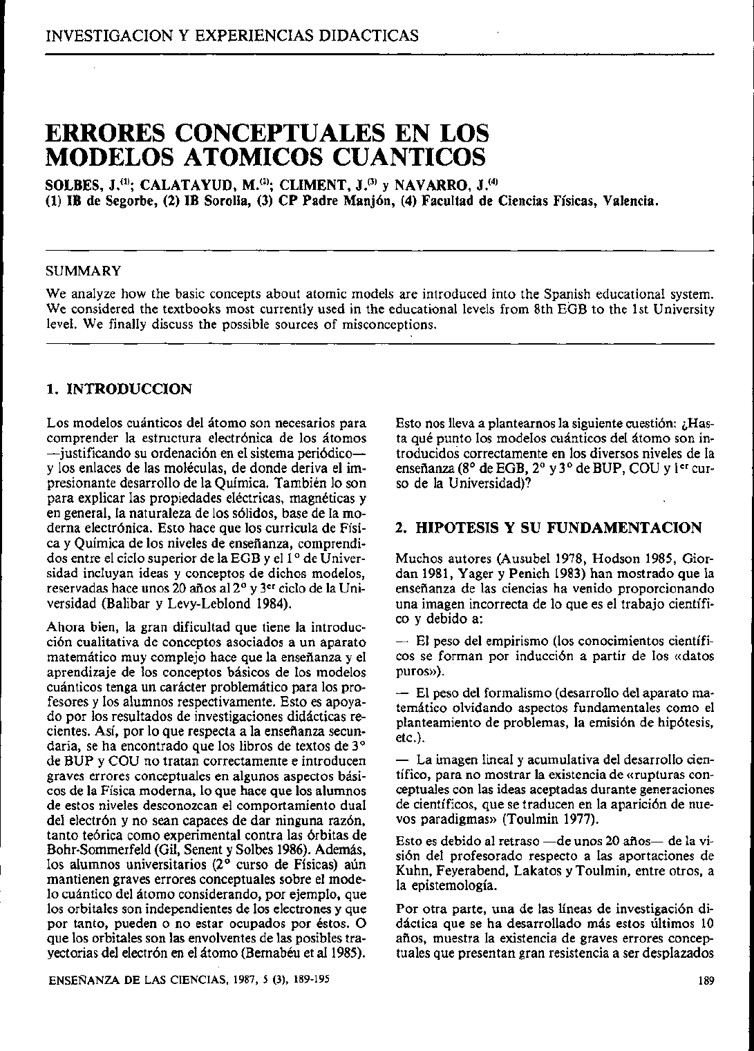 INVESTIGACION Y EXPERIENCIAS DIDACTICAS ERRORES CONCEPTUALES EN LOS MODELOS ATOMICOS CUANTICOS SOLBES, J."); CALATAYUD, M."); CLIMENT, J?' y NAVARRO, J .'4) (1) IB de Segorbe, (2) IB Sorolla, (3) CP Padre Manjón, (4) Facultad de Ciencias Físicas, Valencia. SUMMARY We analyze how the basic concepts about atomic models are introduced into the Spanish educational system. We considered the textbooks most currently used in the educational levels from 8th EGB to the 1st University level. We finally discuss the possible sources of misconceptions. 1. INTRODUCCION Los modelos cuánticos del átomo son necesarios para comprender la estructura electrónica de los átomos -justificando su ordenación en el sistema periódico- y los enlaces de las moléculas, de donde deriva el im- presionante desarrollo de la Química. También lo son para explicar las propiedades eléctricas, magnéticas y en general, la naturaleza de los sólidos, base de la mo- derna electrónica. Esto hace que los curricula de Físi- ca y Química de los niveles de ensefianza, comprendi- dos entre el ciclo superior de la EGB y el 1 de Univer- sidad incluyan ideas y conceptos de dichos modelos, reservadas hace unos 20 años a1 2' y 3Cr ciclo de la Uni- versidad (Balibar y Levy-Leblond 1984). Ahora bien, la gran dificultad que tiene la introduc- ción cualitativa de conceptos asociados a un aparato matemático muy complejo hace que la ensefianza y el aprendizaje de los conceptos básicos de los modelos cuánticos tenga un carácter problemático para los pro- fesores y los alumnos respectivamente. Esto es apoya- do por los resultados de investigaciones didácticas re- cientes. Así, por lo que respecta a la ensefianza secun- daria, se ha encontrado que los libros de textos de 3O de BUP y COU no tratan correctamente e introducen graves errores conceptuales en algunos aspectos bási- cos de la Física moderna, lo que hace que los alumnos de estos niveles desconozcan el comportamiento dual del electrón y no sean capaces de dar ninguna razón, tanto teórica como experimental contra las órbitas de Bohr-Sommerfeld (Gil, Senent y Solbes 1986). Además, los alumnos universitarios (2' curso de Físicas) aún mantienen graves errores conceptuales sobre el mode- lo cuántico del átomo considerando, por ejemplo, que los orbitales son independientes de los electrones y que por tanto, pueden o no estar ocupados por éstos. O que los orbitales son las envolventes de las posibles tra- yectorias del electrón en el átomo (Bemabéu et al 1985). Esto nos lleva a plantearnos la siguiente cuestión: has- ta qué punto los modelos cuánticos del átomo son in- troducidos correctamente en los diversos niveles de la ensefianza (8' de EGB, 2' y 3' de BUP, COU y lCr cur- so de la Universidad)? 2. HIPOTESIS Y SU FUNDAMENTACION Muchos autores (Ausubel 1978, Hodson 1985, Gior- dan 1981, Yager y Penich 1983) han mostrado que la ensefianza de las ciencias ha venido proporcionando una imagen incorrecta de lo que es el trabajo científi- co y debido a: - El peso del empirismo (los conocimientos científi- cos se forman por inducción a partir de los ((datos puros))). - El peso del formalismo (desarrollo del aparato ma- temático olvidando aspectos fundamentales como el planteamiento de problemas, la emisión de hipótesis, etc.). - La imagen lineal y acumulativa del desarrollo cien- tífico, para no mostrar la existencia de ((rupturas con- ceptuales con las ideas aceptadas durante generaciones de científicos, que se traducen en la aparición de nue- vos paradigmas)) (Toulmin 1977). Esto es debido al retraso -de unos 20 años- de la vi- sión del profesorado respecto a las aportaciones de Kuhn, Feyerabend, Lakatos y Toulmin, entre otros, a la epistemología. Por otra parte, una de las líneas de investigación di- dáctica que se ha desarrollado más estos últimos 10 afios, muestra la existencia de graves errores concep- tuales que presentan gran resistencia a ser desplazados ENSEÑANZA DE LAS CIENCIAS, 1987, 5 (3), 189-195 189 INVESTIGACION Y EXPERIENCIAS DIDACTICAS por las ideas científicas correctas. Una causa impor- tante de la persistencia de los errores conceptuales es el hecho de que los modelos didácticos utilizados ha- bitualmente por el profesorado -transmisión verbal de conocimientos ya elaborados o descubrimiento in- ductivo y autónomo (Gil 1983)- no tengan en cuenta las estructuras conceptuales previas de los alumnos en las que los nuevos conocimientos han de integrarse o, a menudo, contra las que han de construirse (Driver 1986, Posner et al 1982), ni tampoco sus tendencias me- todológicas habituales (Gil y Carrascosa 1985, Gil 1986). Esto se traduce, y esta es nuestra hipótesis, en que la introducción de los modelos cuánticos en 8' de EGB, en la enseilanza secundaria y también en el ler curso de la Universidad sea, en general, incorrecta y confu- sa, porque: 1. Se trata de una introducción puramente lineal y de- sestructurada donde simplemente se yuxtaponen (o in- cluso se mezclan) las concepciones clásicas (modelos atómicos de Thomson, Rutherford), las de la antigua teoría de los quanta (modelos de Bohr, Sommerfeld), las cuánticas (Schrodinger, Heisenberg). 2. Es una introducción con grandes errores conceptua- les mezclados con ideas correctas. Nos referimos más explícitamente a: - la introducción directa o explícita de errores, por interpretaciones incorrectas que en parte coinciden con las que se cometieron en la génesis de la Física moder- na y en desacuerdo con las concepciones actualmente vigentes (Warren 1976). -- la introducción implícita de errores por falta de un tratamiento clarificador que muestre cómo las ideas in- troducidas entran en conflicto con las clásicas (y con la estructura conceptual de los alumnos), cosa con la que las posibilidades de cambio conceptual son prácti- camente nulas. Como sefiala Lehrman (1982) algunos de esos errores aparecen hoy en textos por un mecanismo de «reacción en cad