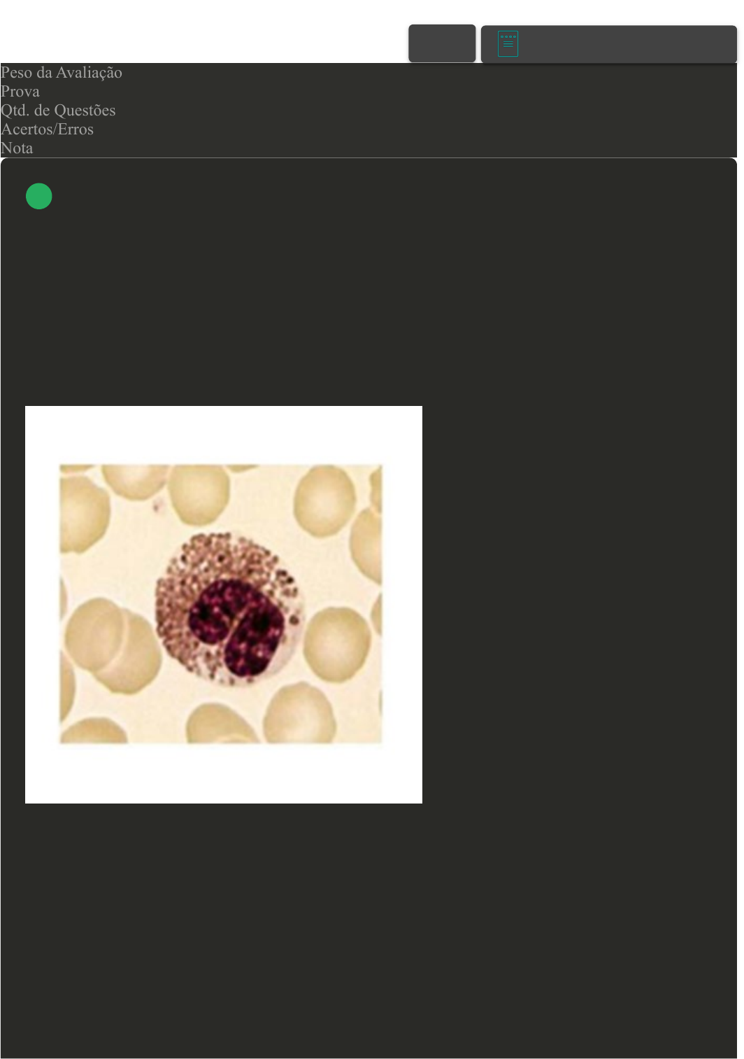 17/10/2023, 18:41 Avaliação II - Individual about:blank 1/8 Prova Impressa GABARITO | Avaliação II - Individual (Cod.:884631) Peso da Avaliação 1,50 Prova 72616418 Qtd. de Questões 10 Acertos/Erros 10/0 Nota 10,00 Os leucócitos, também conhecidos como glóbulos brancos, são células presentes no sangue e produzidas na medula óssea e no tecido linfático. São responsáveis pela defesa do nosso organismo contra patógenos. Com base no tipo de leucócito apresentado na imagem anexa, assinale a alternativa CORRETA: A Basófilo. B Monócito. C Neutrófilo. VOLTAR A+ Alterar modo de visualização 1 17/10/2023, 18:41 Avaliação II - Individual about:blank 2/8 D Eosinófilo. Os eosinófilos se originam na medula óssea e têm característica de apresentar no citoplasma grânulos com alta afinidade pela eosina, um corante ácido utilizado nas colorações de Romanowsky. Com base nos eosinófilos, avalie as asserções a seguir e a relação proposta entre elas: I- Estão presentes no sangue periférico e têm importante função na mediação de processos inflamatórios associados a alergias, à defesa contra parasitas metazoários helmínticos. PORQUE II- Têm diâmetro de 12 - 17 µm e o núcleo apresenta normalmente 2 lóbulos com cromatina condensada. Assinale a alternativa CORRETA: A As asserções I e II são proposições verdadeiras, e a II é uma justificativa da I. B A asserção I é uma proposição falsa, e a II é uma proposição verdadeira. C As asserções I e II são proposições falsas. D As asserções I e II são proposições verdadeiras, mas a II não é uma justificativa da I. As leucemias são as neoplasias malignas que atingem os leucócitos, são caracterizadas pela proliferação descontrolada das células hematopoiéticas na medula óssea e/ou nos tecidos linfoides. Com base nas leucemias, avalie as asserções a seguir e a relação proposta entre elas: I- Leucemia mieloide aguda (LMA) é uma doença caracterizada pela proliferação clonal e maturação aberrante de um de seus precursores hematopoiéticos da linhagem mieloide. PORQUE 2 3 17/10/2023, 18:41 Avaliação II - Individual about:blank 3/8 II- A alteração neoplásica pode ocorrer em qualquer uma das diferentes linhagens celulares hematopoiéticas, possibilitando assim a classificação dos vários tipos de leucemias mieloides agudas. Assinale a alternativa CORRETA: A As asserções I e II são proposições verdadeiras, a II é uma justificativa da I. B As asserções I e II são proposições falsas. C A asserção I é uma proposição verdadeira, e a II é uma proposição falsa. D A asserção I é ima proposição falsa, e a II é uma proposição verdadeira. Linfócitos são células responsáveis pela defesa do corpo. Eles pertencem ao grupo dos leucócitos, também chamados de glóbulos brancos, e podem ser divididos em três tipos conforme sua função no organismo. Sobre as funções dos linfócitos, analise as sentenças a seguir: I- Linfócitos NK agem sobre células tumorais e células infectadas por vírus. II- Linfócitos T são subdivididos em T CD8 ou citotóxico e TCD4 ou auxiliares. III- Os linfócitos T4 são subdivididos em T auxiliar 1, T auxiliar 2 e T auxiliar 3. IV- Plasmócitos são originados dos linfócitos B maduros e são responsáveis pela síntese de imunoglobulinas. Assinale a alternativa CORRETA: A As sentenças I, II e III estão corretas. B As sentenças II, III e IV estão corretas. C Somente a sentença I está correta. 4 17/10/2023, 18:41 Avaliação II - Individual about:blank 4/8 D As sentenças I, II e IV estão corretas. Os leucócitos apresentam a incrível capacidade de sair dos vasos sanguíneos e migrar para o tecido adjacente (diapedese) para defender o organismo. A respeito dos leucócitos e suas classificações. Com base no exposto, classifique V para as sentenças verdadeiras e F para as falsas: ( ) Os neutrófilos têm papel crucial na defesa do organismo fagocitando e digerindo microrganismos, preferencialmente vírus. ( ) Os eosinófilos estão aumentados nos processos inflamatórios associados à alergias, à defesa contra parasitas metazoários helmínticos, em certos distúrbios cutâneos alérgicos e neoplásicos. ( ) Os basófilos produzem diversos mediadores inflamatórios, como a histamina, além de possuírem receptores de IgE na membrana plasmática. Estão aumentados em processo viral. ( ) Os macrófagos tissulares são de morfologia e fisiologia semelhantes às dos monócitos. Assinale a alternativa que apresenta a sequência CORRETA: A F - V - F - V. B F - F - V - F. C F - V - V - F. D V - V - F - F. As células mieloides incluem vários dos leucócitos do sangue (neutrófilos, monócitos, eosinófilos e basófilos), assim como as células que se distribuem pelos tecidos (macrófagos e mastócitos). As células linfoides incluem os linfócitos T, B e NK. Considerando as características de cada tipo de célula mieloide, analise as sentenças a seguir: 5 6 17/10/2023, 18:41 Avaliação II - Individual about:blank 5/8 I- O Metamielócito possui núcleo em forma de feijão ou rim, com mais citoplasma do que o promielócito. II- O Pró-mielócito possui o núcleo redondo, ovalado ou irregular com citoplasma escasso, basofílico. III- O Mieloblasto não possui granulações visíveis, porém possui o nucléolo visível. IV- O Neutrófilo possui granulações secundárias com citoplasma acidófilo. Assinale a alternativa CORRETA: A Somente a sentença II está correta. B Somente a sentença I está correta. C As sentenças I, II, III e IV estão corretas. D Somente a sentença IV está correta. Os leucócitos fazem parte do sistema imune e combaterem infecções e agressões ao nosso corpo. São agrupados em duas categorias diferentes: mononucleares e polimorfonucleares. Assinale a alternativa CORRETA que apresenta os leucócitos polimorfonucleares: A Neutrófilos, eosinófilos e basófilos. B Neutrófilos, linfócitos, eosinófil