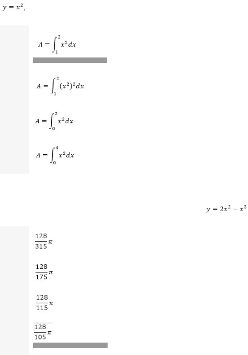 Questão 1/10 - Cálculo Diferencial e Integral a uma Variável Como escrever a integral para calcular a área entre o eixo x, a reta x = 1, a reta x = 2 e a parábola usando o eixo x como referência? A Você assinalou essa alternativa (A) B C D Questão 2/10 - Cálculo Diferencial e Integral a uma Variável Qual o volume gerado quando a área entre o eixo x e o traçado de gira em torno do eixo x? A B C D Você assinalou essa alternativa (D) Questão 3/10 - Cálculo Diferencial e Integral a uma Variável Calcule a seguinte integral definida A 42 B 45 Você assinalou essa alternativa (B) C 35 D 47 Questão 4/10 - Cálculo Diferencial e Integral a uma Variável Suponha a confecção de uma caixa de lados regulares com base quadrada de lados x e altura y, sem tampa, com 1 m³ de volume. Determine as dimensões que exigem o mínimo de material na sua confecção. (Desprezar a espessura do material e as perdas na construção da caixa). A Lados iguais e com dimensão de 0,93m B Lados iguais e com dimensão de 0,83m C Lados iguais e com dimensão de 0,73m D Lados x e y têm dimensões aproximadas, respectivamente, de 1,26m e 0,63m Você assinalou essa alternativa (D) Questão 5/10 - Cálculo Diferencial e Integral a uma Variável Determinar a área limitada pela curva e pelo eixo x. A Você assinalou essa alternativa (A) B C D Questão 6/10 - Cálculo Diferencial e Integral a uma Variável Calcule a seguinte integral definida A B Você assinalou essa alternativa (B) C D Questão 7/10 - Cálculo Diferencial e Integral a uma Variável Gás está sendo bombeado para um balão esférico à razão de 0,1 m³/min. Ache a taxa de variação do raio quando este é de 0,45 m. Dado: A 0,03931m/min Você assinalou essa alternativa (A) B 0,02931m/min C 0,01852m/min D 0,05869m/min Questão 8/10 - Cálculo Diferencial e Integral a uma Variável Calcule a seguinte integral definida A B C D Você assinalou essa alternativa (D) Questão 9/10 - Cálculo Diferencial e Integral a uma Variável Calcule a seguinte integral indefinida Você não pontuou essa questão A B Você assinalou essa alternativa (B) C D Questão 10/10 - Cálculo Diferencial e Integral a uma Variável Calcule a seguinte integral definida A Você assinalou essa alternativa (A) B C D