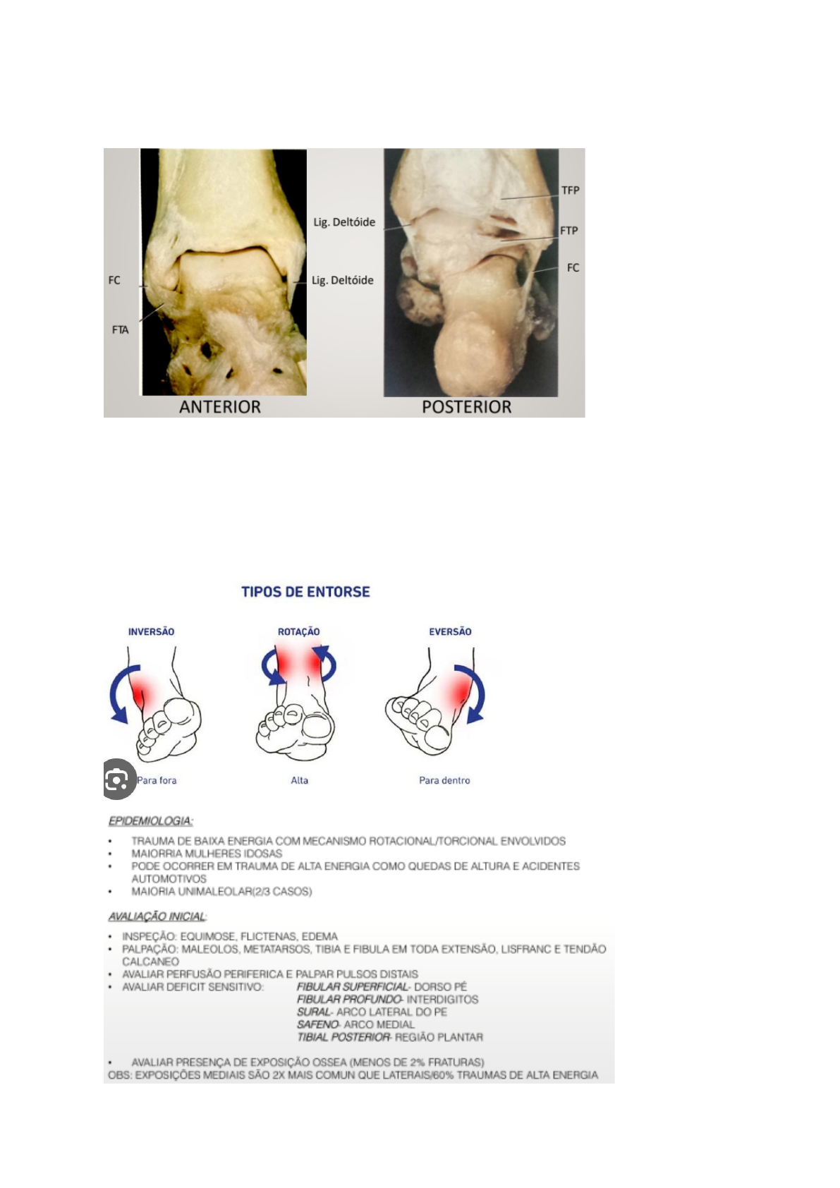 Fratura de tornozelo Anatomia → procurar problemas na pinça do tornozelo; → pronação e pronação do retropé -TODA VEZ QUE TORNOZELO VAI PARA DENTRO É INVERSÃO -TODA VEZ O CALCANHAR VAI PARA FORA É EVERSÃO -Mecanismo mais comum de eversão ….. Supinar dedos vão para cima e pronar os dedos vão para … EPIDEMIOLOGIA: • TRAUMA DE BAIXA ENERGIA COM MECANISMO ROTACIONAL/TORClONAL ENVOLVIDOS • MAIORRIA MULHERES IDOSAS • PODE OCORRER EM TRAUMA DE ALTA ENERGIA COMO QUEDAS DE ALTURA E ACIDENTES AUTOMOTIVOS • MAIORIA UNIMALEOLAR(2/3 CASOS) AVALIAÇÃO INICIAL • INSPEÇÃO: EQUIMOSE, FLICTENAS, EDEMA • PALPAÇÃO: MALEOLOS. METATARSOS, TIBIA E FIBULA EM TODA EXTENSÃO. LISFRANC E TENDÃO CALCANEO • AVALIAR PERFUSÃO PERIFÉRICA E PALPAR PULSOS DISTAIS • AVALIAR DÉFICIT SENSITIVO: FIBULARSUPERFICIAL- DORSO PÉ FIBULAR PROFUNDO- INTERDIGITOS SURAL- ARCO LATERAL DO PE SAFENO- ARCO MEDIAL TIBIAL POSTERIOR- REGIÃO PLANTAR • AVALIAR PRESENÇA DE EXPOSIÇÃO OSSEA (MENOS DE 2% FRATURAS) OBS: EXPOSIÇÕES MEDIAIS SÃO 2X MAIS COMUN QUE LATERAlS/60% TRAUMAS DE ALTA ENERGIA https://www.anatomiadocorpo.com/esqueleto-humano/pe/tornozelo/ https://www.anatomiadocorpo.com/esqueleto-humano/pe/tornozelo/ → ligamento deltoide → FTA - ligamento fibulo talar ( anterio e posterior) https://www.facebook.com/pontodafisioterapia/posts/2638972862995021/ https://www.facebook.com/pontodafisioterapia/posts/2638972862995021/ https://www.sanarmed.com/resumo-fraturas-do-tornozelo-no-adulto-com-mapa-mental-ligas https://www.sanarmed.com/resumo-fraturas-do-tornozelo-no-adulto-com-mapa-mental-ligas https://brasilescola.uol.com.br/biologia/ossos-do-pe.htm → Ligamento se cicatriza em 6 semanas https://brasilescola.uol.com.br/biologia/ossos-do-pe.htm Aircast Robofoot Pedir tomografia no pronto socorro, quando? IMAGEM • MORTISE Congruência articular • TOMOGRAFIA - Lesões associadas - Maléolo posterior - Pilão tibial - Mudam planejamento em 24% das fraturas CLASSIFICAÇÕES: LAUGE-HANSEN: MAIS UTILIZADA/ POSIÇÃO X MECANISMO CLASSIFICAÇÃO DE WEBER: A: INFRASINDESMOIDAL B:ALTURA DA SINDESMOSE C: SUPRASINDESMOIDAL CLASSIFICAÇÃO AO:: EXTENSÃO DA CLASSIFICAÇÃO DE WEBER • TRATAMENTO: • FRATURAS ESTÁVEIS X INSTÁVEIS • FRATURAS INSTÁVEIS: LESÃO MEDIAL,AUMENTO DO ESPAÇO CLARO MEDIAL • >4MM, MORTISE NÃO SIMÉTRICO, FRATURA DO MALÉOLO MEDIAL E POSTERIOR • SEMPRE PEDIR RAIO-X COM STRESS FRATURAS ESTÁVEIS: TRATAMENTO CONSERVADOR (GESSO OU BRACE CURTO 4-6 SEM FRATURAS INSTÁVEIS: TRATAMENTO CIRÚRGICO • PLACA TERÇO CANO TUBULAR NA FÍBULA • NÃO EXPLORAR RAFIA DO LIGAMENTO DELTÓIDE DE ROTINA!! • REDUÇÃO ANATÓMICA DO MALÉOLO MEDIAL E FIXAÇÃO COM PARAFUSO COMPRESSÃO MEIA ROSCA • FIXAR SINDESMOSE E MALÉOLO POSTERIOR SE NECESSÁRIO. • MALÉOLO POSTERIOR: APÓS REDUÇÃO DA FÍBULA AVALIAR ESTABILIDADE FRAGMENTOS >30% DEVEM SER FIXADOS • SINDESMOSE: TESTE DE WEBER: TESTA SINDESMOSE NO INTRAOPERATÓRIO SE LESÃO =FIXAÇÃO: 2CM ACIMA DA ARTICULAÇÃO/1 OU 2 PARAFUSOS COMPLICAÇÕES: • PERDA DA REDUÇÃO (COMUM EM TRATAMENTO CONSERVADOR 26% CASOS) • MÁ UNIÃO • NÃO UNIÃO (RARO) • INFECÇÃO E COMPLICAÇÕES DE PARTES MOLES • ENRIJECIMENTO ARTICULAR • ARTROSE DE TORNOZELO