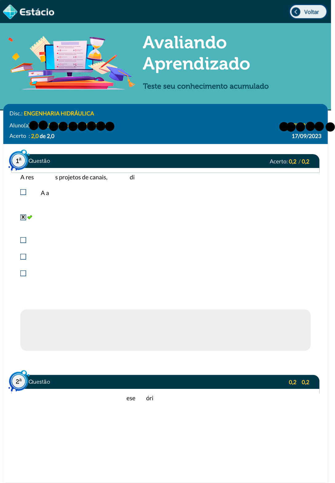 17/09/2023, 14:18 Estácio: Alunos https://simulado.estacio.br/alunos/ 1/7 Avaliando Aprendizado Teste seu conhecimento acumulado Disc.: ENGENHARIA HIDRÁULICA Aluno(a): NIVALDO RAMOS LOURENÇO 201707259119 Acertos: 2,0 de 2,0 17/09/2023 Acerto: 0,2 / 0,2 A respeito dos projetos de canais, pode se dizer: A adoção de uma velocidade média máxima compatível com o revestimento pode ser utilizada como critérios de um projeto para que a seção seja estável. Esse critério é chamado de mínima tensão de cisalhamento. Para canais de seção compostas, as equações de resistência não dão bons resultados se aplicados à seção completa − as mesmas devem ser subdividas por linhas imaginárias, e, para cada seção, deve-se utilizar a fórmula de Manning para o cálculo da vazão parcial. As obras são executadas de montante para jusante, assim, quando chove, um volume maior de água consegue escoar mais rapidamente. Não é necessário deixar uma folga acima do nível máximo de projeto, a altura máxima de projeto já atende possíveis sobrelevações em curvas e ao fator de segurança. Considerações estéticas não são relevantes em projetos de canais. Utilizando as equações corretas e ponderando os coe�cientes de segurança, obtém-se um projeto de alto nível. Respondido em 17/09/2023 14:13:51 Explicação: A resposta certa é: Para canais de seção compostas, as equações de resistência não dão bons resultados se aplicados à seção completa − as mesmas devem ser subdividas por linhas imaginárias, e, para cada seção, deve-se utilizar a fórmula de Manning para o cálculo da vazão parcial. Acerto: 0,2 / 0,2 Para a situação em que L.C.E. entre dois reservatórios é a representada pela linha vermelha tracejada (�gura a seguir), qual é o ponto de menor pressão? Questão1 a Questão2 a https://simulado.estacio.br/alunos/inicio.asp javascript:voltar(); 17/09/2023, 14:18 Estácio: Alunos https://simulado.estacio.br/alunos/ 2/7 Ponto C Ponto D Ponto A Ponto E Ponto B Respondido em 17/09/2023 14:03:24 Explicação: A resposta certa é: Ponto B Acerto: 0,2 / 0,2 Classi�que o bueiro da imagem a seguir. https://www.shutterstock.com/pt/image-photo/double-box-culvert-concrete-wing-walls-1893297055 BCDC. BTSC. BTDC. BTTC. BCSC. Questão3 a 17/09/2023, 14:18 Estácio: Alunos https://simulado.estacio.br/alunos/ 3/7 Respondido em 17/09/2023 14:08:54 Explicação: A resposta certa é: BCDC. Acerto: 0,2 / 0,2 Uma estação elevatória bombeia água para os reservatórios 2 e 3, ilustrados na �gura a seguir, pelas tubulações A, B e C. Fonte: Gabriel de Carvalho Nascimento e Elson Antonio do Nascimento Os grá�cos carga versus vazão da soma das vazões nas tubulações A+B, C e da soma das cargas dessas duas são exibidos na �gura posterior. Fonte: Gabriel de Carvalho Nascimento e Elson Antonio do Nascimento Calcule a razão entre a vazão obtida com as duas bombas em série e a vazão com uma bomba, cujos grá�cos também são exibidos na �gura. 2,0 1,6 1,1 Questão4 a 17/09/2023, 14:18 Estácio: Alunos https://simulado.estacio.br/alunos/ 4/7 1,3 1,5 Respondido em 17/09/2023 14:10:42 Explicação: A resposta certa é: 1,5 Acerto: 0,2 / 0,2 Quando a Lua-Terra- Sol estão 90° fora de fase uma com a outra (as marés lunares e solares estão em oposição), elas formam: Marés semidiurnas. Marés de sizígia. Marés de quadratura. Marés negativas. Marés mistas. Respondido em 17/09/2023 14:15:30 Explicação: A resposta certa é: Marés de quadratura. Acerto: 0,2 / 0,2 De acordo com as frases a seguir, pode-se dizer: I - Em canais de concreto devem ser previstos drenos nas paredes e fundo, para evitar subpressão quando o nível do lençol freático estiver alto, já os taludes de pedras argamassadas e o uso de drenos são dispensáveis, pois a alvenaria de pedra permite certa permeabilidade. II - O aumento da velocidade média e da declividade da linha d¿água podem aumentar a erosão com aumento de transporte de sólidos e prejudicar eventuais sistemas de captação de água a jusante, respectivamente. III - Para que o talude seja geotecnicamente estável, a sua máxima inclinação deve ser menor que o ângulo de repouso do material de revestimento. Todas as a�rmativas estão corretas. I e III estão corretas. Todas as a�rmativas estão incorretas. I e II estão corretas. II e III estão corretas. Respondido em 17/09/2023 14:13:22 Explicação: A resposta certa é: Todas as a�rmativas estão corretas. Questão5 a Questão6 a 17/09/2023, 14:18 Estácio: Alunos https://simulado.estacio.br/alunos/ 5/7 Acerto: 0,2 / 0,2 Questão7 a 17/09/2023, 14:18 Estácio: Alunos https://simulado.estacio.br/alunos/ 6/7 (CEDAE - Engenheiro Civil - 2009) Considere as seguintes atividades, associadas ao projeto e operação de sistemas de abastecimento de água. I. Desenho do traçado de um sistema de distribuição. II. Edição das propriedades dos componentes do sistema. III. Simulações estáticas. IV. Simulações dinâmicas. V. Simulação dos parâmetros de qualidade da água. Dentre as atividades acima, aquelas possíveis de serem executadas com o programa EPANET são: I, II, III e IV, apenas. II, III, IV e V, apenas. III, IV e V, apenas. I, II e III, apenas. I, II, III, IV e V. Respondido em 17/09/2023 14:06:26 Explicação: A resposta certa é: I, II, III, IV e V. Acerto: 0,2 / 0,2 Qual é a vazão que escoa em um canal de 1,2 m de largura, quando a altura sobre a soleira de um vertedor, sem contrações laterais, é de 20 cm? 150 L/s 50 L/s 100 L/s 250 L/s 200 L/s Respondido em 17/09/2023 14:09:38 Explicação: A resposta certa é: 200 L/s Acerto: 0,2 / 0,2 [ENADE - ENGENHARIA GRUPO IV, 2011] Em sistemas de escoamento de �uidos (gases ou líquidos), é muito comum ser necessário adicionar-se energia para manter o escoamento. Bombas e compressores são exemplos de equipamentos que fornecem energia aos �uidos. Suponha que, em uma estação de tratamento d