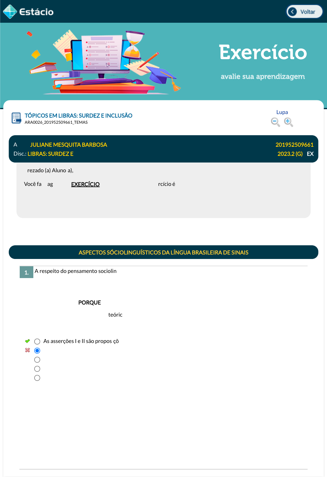 16/10/2023, 14:15 Estácio: Alunos https://simulado.estacio.br/alunos/ 1/6 Exercício avalie sua aprendizagem A respeito do pensamento sociolinguístico variacionista e interacional, avalie as asserções abaixo e a relação entre elas. I. A sociolinguística variacionista permite a observação das relações sociais PORQUE II. Esta é uma perspectiva teórica e metodológica que envolve, além da linguística, outras áreas sociais. Assinale a alternativa correta. TÓPICOS EM LIBRAS: SURDEZ E INCLUSÃO Lupa ARA0026_201952509661_TEMAS Aluno: JULIANE MESQUITA BARBOSA Matr.: 201952509661 Disc.: LIBRAS: SURDEZ E 2023.2 (G) / EX Prezado (a) Aluno(a), Você fará agora seu EXERCÍCIO! Lembre-se que este exercício é opcional, mas não valerá ponto para sua avaliação. O mesmo será composto de questões de múltipla escolha. Após responde cada questão, você terá acesso ao gabarito comentado e/ou à explicação da mesma. Aproveite para se familiarizar com este modelo de questões que será usado na sua AV e AVS. ASPECTOS SÓCIOLINGUÍSTICOS DA LÍNGUA BRASILEIRA DE SINAIS 1. As asserções I e II são proposições falsas. As asserções I e II são proposições verdadeiras, e a II é uma justi�cativa da I. As asserções I e II são proposições verdadeiras, mas a II não é uma justi�cativa da I. A asserção I é uma proposição verdadeira, e a II é uma proposição falsa. A asserção I é uma proposição falsa, e a II é uma proposição verdadeira. Data Resp.: 16/10/2023 14:11:01 Explicação: É a Sociolinguística Interacional, e não a variacionista, que permite a observação das relações sociais, re�etindo suas características no contexto de uso da língua, onde se enquadram múltiplas comunidades linguísticas, de identidades próprias, e no contexto social macro, mais abrangente, onde se encontram as crenças e os valores penetrados nos diferentes contextos sociais. javascript:voltar(); javascript:voltar(); javascript:voltar(); javascript:voltar(); javascript:diminui(); javascript:diminui(); javascript:aumenta(); javascript:aumenta(); 16/10/2023, 14:15 Estácio: Alunos https://simulado.estacio.br/alunos/ 2/6 A prática da pichação é combatida em diferentes espaços e grupos sociais. No entanto, é uma prática muito comum e que pode oferecer algumas re�exões. Leia a reprodução do texto de uma pichação: Muros brancos povo mudo! Considerando o texto da pichação a partir da contribuição dos estudos sociolinguísticos, é correto a�rmar que: O conceito de homogeneidade linguística advém de uma concepção estruturalista que consiste na ideia de que a língua, por um lado, é um sistema fechado de combinações e associações e, por outro lado, é vista como o lugar da não regularidade, onde surgem múltiplas formas, inclusive as menos legitimadas de uso da língua. Já a Sociolinguística se dedica ao estudo da língua como objeto: Vimos queas língua de sinais são complexas, com estrutura gramatical própria, fonologia, morfologia, semântica, sintaxe e pragmática. As línguas de sinais possuem todos os elementos necessários para serem reconhecidas como línguas naturais. De acordo com o módulo 1, qual das a�rmativas abaixo é FALSA? 2. Trata-se de uma forma não linguística de expressão. Trata-se de uma forma de expressão sem compromisso comunicativo. Trata-se de uma expressão de con�ito entre membros de grupos distintos. Trata-se de uma expressão que não dialoga com o contexto social maior Trata-se de um re�exo de não con�ito na sociedade e sua forma expressiva. Data Resp.: 16/10/2023 14:11:39 Explicação: A resposta correta é: Trata-se de uma expressão de con�ito entre membros de grupos distintos. 3. heterogêneo, formal e socialmente orientado. homogêneo, abstrato e formal. heterogêneo e socialmente orientado. homogêneo, formal e socialmente orientado. homogêneo e socialmente orientado Data Resp.: 16/10/2023 14:15:05 Explicação: A resposta correta é: heterogêneo e socialmente orientado. CULTURA DAS COMUNIDADES SINALIZANTES 4. A língua de sinais é empréstimo linguístico. 16/10/2023, 14:15 Estácio: Alunos https://simulado.estacio.br/alunos/ 3/6 A língua tem estreitas relações com a sociedade. Estas relações são estudadas pela sociolinguística, ramo da linguística que estuda a língua como um fenômeno social. Vimos que a língua varia no espaço geográ�co, no decorrer do tempo, e nos diferentes espaços sociais, bem como nas diferentes situações comunicativas. Sobre variações linguísticas é correto a�rmar que: A história em defesa das nossas escolas especí�cas vem de tempos longínquos. A língua de sinais e a cultura surda, em sua imensidão, compartilhada entre os pares surdos, travou-se em períodos de proibições do uso da nossa língua, por imposições ouvintistas, sempre entremeadas de muitas lutas pela sobrevivência da nossa língua de sinais e pela qualidade da nossa educação. Trecho retirado de CAMPELLO, Ana Regina. REZENDE, Patrícia Luiza Ferreira. Em Defesa da Escola Bilingue para Surdos: a História de Lutas do Movimento Surdo Brasileiro. Educar em Revista. Curitiba, Paraná. N. 2, p. 71-92, 2014. Disponível em: http://www.scielo.br/pdf/er/nspe-2/06.pdf. Bem como as autoras do trecho acima, pesquisadores dos estudos culturais a�rmam a existência de uma cultura surda, no entanto, o status quo pode questionar pode duvidar. Segundo o texto, qual pode ser uma possível razão para o descrédito? A língua de sinais independe da língua oral. A língua de sinais está em contato direto com a língua oral. A língua de sinais é autônoma. A língua de sinais tem estrutura própria. Data Resp.: 16/10/2023 14:14:46 Explicação: A resposta correta é: A língua de sinais é empréstimo linguístico. 5. Não acontecem nas línguas de sinais. O regionalismo, uma forma de variação linguística, é muito comum no Brasil Variações devem ser controladas. Não são re