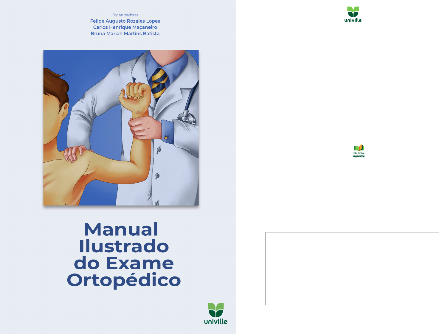 FUNDAÇÃO EDUCACIONAL DA REGIÃO DE JOINVILLE – FURJ – MANTENEDORA ÓRGÃOS DA ADMINISTRAÇÃO SUPERIOR DA FURJ Conselho de Administração Presidente – Loacir Gschwendtner Conselho Curador Presidente – Rafael Martignago ÓRGÃOS EXECUTIVOS DA FURJ Presidente Alexandre Cidral Vice-Presidente Therezinha Maria Novais de Oliveira Diretor Administrativo José Kempner Procuradora-Geral da Furj Ana Carolina Amorim Buzzi UNIVERSIDADE DA REGIÃO DE JOINVILLE – UNIVILLE – MANTIDA ÓRGÃO DELIBERATIVO SUPERIOR DA UNIVILLE Conselho Universitário Presidente – Alexandre Cidral ÓRGÃO EXECUTIVO SUPERIOR DA UNIVILLE Reitor Alexandre Cidral Vice-Reitora Therezinha Maria Novais de Oliveira Pró-Reitora de Ensino Patrícia Esther Fendrich Magri Pró-Reitor de Pesquisa e Pós-Graduação Paulo Henrique Condeixa de França Pró-Reitora de Extensão e Assuntos Comunitários Yoná da Silva Dalonso Pró-Reitor de Infraestrutura Gean Cardoso de Medeiros Diretor do Campus São Bento do Sul Eduardo Silva PARQUE DE INOVAÇÃO TECNOLÓGICA DE JOINVILLE E REGIÃO – INOVAPARQ – MANTIDA Diretor Executivo Marcelo Leandro de Borba Produção editorial Editora Univille Coordenação geral Silvio Simon de Matos Diagramação Marisa Aguayo Revisão Viviane Rodrigues EXPEDIENTE ISBN 978-65-87142-20-3 Catalogação na fonte pela Biblioteca Universitária da Univille Manual ilustrado do exame ortopédico [recurso eletrônico] / M294 organizadores Felipe Augusto Rozales Lopes, Carlos Henrique Maçaneiro, Bruna Mariah Martins Batista. – Joinville, SC: Editora UNIVILLE, 2021. 1. Ortopedia – Manuais, guias etc. 2. Ortopedia – Diagnóstico. I. Lopes, Felipe Augusto Rozales (org.). II. Maçaneiro, Carlos Henrique (org.). III. Batista, Bruna Mariah Martins (org.). CDD 617.3 Elaborada por: Rafaela Ghacham Desiderato – CRB 14/1437 Manual Ilustrado do Exame Ortopédico Joinville, 2021 Organizadores Felipe Augusto Rozales Lopes Carlos Henrique Maçaneiro Bruna Mariah Martins Batista ORGANIZADORES Felipe Augusto Rozales Lopes Graduação em Medicina na Universidade Católica de Pelotas (UCPEL – 2012). Residência médica em Ortopedia e Traumatologia no Hospital Municipal São José (HMSJ) e no Instituto de Ortopedia e Traumatologia (IOT) de Joinville – SC (2018). Fellow em cirurgia da coluna vertebral no IOT de Joinville – SC. Carlos Henrique Maçaneiro Graduação em Medicina na Pontifícia Universidade Católica do Paraná (PUC/ PR – 1983). Residência médica na Irmandade da Santa Casa de Misericórdia de Curitiba, Curitiba – PR (1985). Visitorship Observing the Treatment of Pediatric and Adult Spinal Disorders – Twin Cities Spine Center, Minnesota – USA (1998). Mestrado em Saúde e Meio Ambiente (Conceito Capes 4) na Universidade da Região de Joinville (Univille – 2003). Chefe e instrutor do Serviço de Residência Médica do IOT Joinville – CET- SBOT-HMSJ. Professor adjunto II do curso de Medicina – Ortopedia e Traumatologia da Univille (2004-2020). Diretor/responsável técnico no Ambulatório de Medicina da Univille (2012- 2020). Membro titular da Sociedade Brasileira de Ortopedia e Traumatologia (SBOT). Sócio fundador da Sociedade Brasileira de Coluna (SBC). Ex-presidente da SBC (2005-2006). Membro do Scoliosis Research Society (SRS). Membro do North American Spine Society (NASS). Membro do The International Spine Cord Society (ISCoS). Membro do Comitê de Dor da SBOT. Membro da Sociedade Brasileira de Médicos Intervencionistas em Dor (Sobramid). Chefe do Serviço Fellow Coluna Vertebral – Núcleo Coluna Vertebral IOT/ HMSJ Joinville. Bruna Mariah Martins Batista Graduação em Medicina na Univille (2018). Membro da Liga de Ortopedia e Traumatologia da Univille e do IOT de Joinville. COLABORADORES Amanda Roepke Tiedje Graduação em Medicina na Univille (2018). Membro da Liga de Ortopedia e Traumatologia da Univille e do IOT de Joinville – SC. Anderson Carlos Bigolin Stiegemaier Graduação em Medicina na Universidade de Passo Fundo (UPF), Passo Fundo – RS (2006). Residência médica em Ortopedia e Traumatologia no IOT de Joinville – SC (2009). Especialização em Cirurgia do Joelho pelo IOT de Passo Fundo – RS. Instrutor do serviço de residência médica do IOT de Joinville – SC. André Augusto Casagrande Graduação em Medicina na Universidade de Caxias do Sul (UCS), Caxias do Sul – RS (1994). Residência médica em Ortopedia e Traumatologia no IOT de Joinville – SC (1999). Especialização em Cirurgia do Quadril e Bacia no Hospital das Clínicas de São Paulo, São Paulo – SP (2000). Instrutor do serviço de residência médica do IOT de Joinville – SC. André Bergamaschi Demore Graduação em Medicina na UCS, Caxias do Sul – RS (1992). Residência médica em Ortopedia e Traumatologia no IOT de Joinville – SC (1995). Especialização em Cirurgia do Pé e Tornozelo na Faculdade de Medicina da Universidade de São Paulo (USP-FMUSP), São Paulo – SP (1996). Professor do serviço de residência médica do IOT de Joinville – SC. Carolina da Silveira Welter Graduação em Medicina na Univille (2018). Membro da Liga de Ortopedia e Traumatologia da Univille e do IOT de Joinville – SC. Gabriel El-Kouba Júnior Graduação em Medicina na Universidade Federal de Santa Catarina (UFSC), Florianópolis – SC (2004). Residência médica em Ortopedia e Traumatologia no IOT de Joinville – SC (2008). Especialização em Cirurgia do Ombro e Cotovelo no IOT de Passo Fundo – RS (2010). Instrutor do serviço de residência médica do IOT de Joinville – SC. Hamilton Camargo Ribas Filho Graduação em Medicina na Pontifícia Universidade Católica do Paraná (PUC-PR – 1987). Residência médica em Ortopedia e Traumatologia na Clínica de Fraturas XV de Novembro, Curitiba – PR (1989). Especialização em Ortopedia e Traumatologia Pediátrica no Hospital Pequeno Príncipe, Curitiba – PR. Instrutor do serviço de residência médica do IOT de Joinville – SC