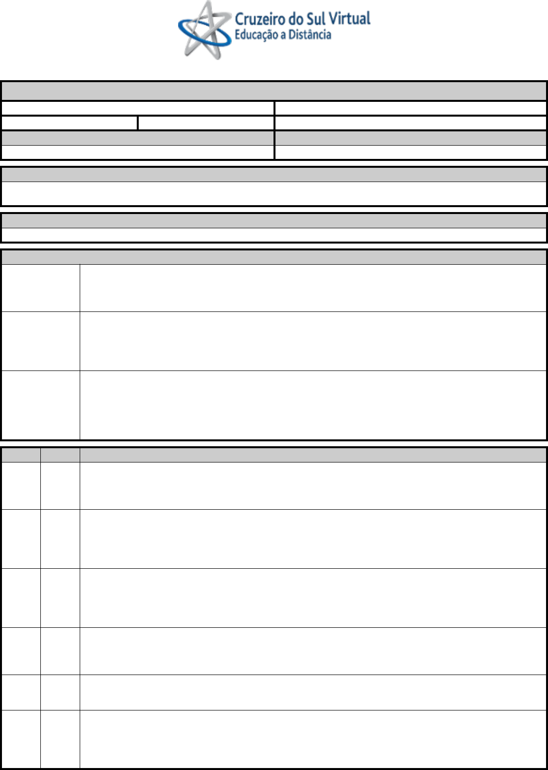 GRADUAÇÃO EAD (UCS/UNC/UNF) PLANO DE ENSINO - 2021 / 1º SEMESTRE Disciplina: FotografiaCurso: Arquitetura (Licenciatura) --- C/H Semestral: 80Online Claudemir Nunes Ferreira PROFESSOR RESPONSÁVEL PROFESSOR EXECUTOR EMENTA Estudo dos aspectos conceituais, históricos, estéticos e operacionais da fotografia. A fotografia como Arte. Compreensão da linguagem e apreciação significativa. REQUISITOS Não há pré-requisitos OBJETIVOS Cognitivos a. Conhecer os aspectos conceituais, históricos, estéticos e operacionais da fotografia; b. Conhecer a fotografia como linguagem e seus elementos ontológicos; c. Conhecer meios de fruição, apreciação significativa, leitura e crítica; d. Conhecer procedimentos para práticas artísticas e construção de formas visuais. Habilidades a. Desenvolver e realizar pesquisas sobre os aspectos conceituais, históricos, estéticos e operacionais da fotografia; b. Desenvolver e realizar pesquisas sobre a fotografia como linguagem e seus elementos ontológicos; c. Apreciar, analisar significativamente, ler e criticar manifestações históricas e estéticas da fotografia; d. Elaborar e desenvolver práticas artísticas e a construção de formas visuais. Atitudes a. Valorizar a pesquisa sobre os aspectos conceituais, históricos, estéticos e operacionais da fotografia para atualização e autoformação; b. Valorizar a pesquisa sobre a fotografia como linguagem e seus elementos ontológicos para atualização e autoformação; c. Ter autonomia e independência de análise significativa, leitura e critica das manifestações históricas e estéticas da fotografia; d. Ter domínio instrumental para o desenvolvimento de práticas artísticas e a construção de formas visuais. CONTEÚDOUNID. C/H I 16 ELEMENTOS FORMAIS E COMPOSIÇÃO a) Elementos Formais: luz, cor, tom, ponto, linha, forma, textura, escala, dimensão e movimento; b) Composição fotográfica: formato, enquadramento, plano, ponto de vista e técnicas de composição fotográfica. II 14 CÂMERA E TÉCNICAS FOTOGRÁFICAS a) A câmera fotográfica: objetiva/lente, diafragma, obturador, sensor e ISO. Parâmetros de exposição fotográfica: abertura, velocidade e sensibilidade. b) Modos de exposição: automático, manual, semimanuais (prioridade de abertura, prioridade de velocidade e auto exposição) e modos de cena ou programados. III 14 ORIGEM DA FOTOGRAFIA E A CONQUISTA DO CENÁRIO ARTÍSTICO a) Fotografia - primeiros passos: a câmera escura, Heliografia, Daguerreotipia, calotipia. Fundação da Kodak e a popularização da fotografia. A fotografia em cores. b) Fotografia e arte: Pictorialismo, Fotossecessão, Fotografia Pura, Fotografia Social, Nova objetividade, F/64 e Fotografia Subjetiva. IV 12 FOTOGRAFIA NOS MOVIMENTOS DE VANGUARDA E NA ARTE CONCEITUAL Da fotografia vanguardista à fotografia conceitual: Fotografia Futurista; Fotomontagem e Fotografia Russa; Nova Visão; Fotograma e Fotomontagem Dadaísta; Fotografia Surrealista; Fotografia na Pop Art e Fotografia na Arte Conceitual. V 12 DA FOTOGRAFIA PÓS-MODERNA ÀS TENDÊNCIAS CONTEMPORÂNEAS Picture Generation; Refotografia; Fotografia Encenada; Pós-Produção; Guerras da Cultura; Escola de Düsseldorf. VI 12 O OLHAR O instante decisivo (Henri Cartier-Bresson); O rigor técnico (Ansel Adams); Para além da técnica (Robert Capa); O olhar estrangeiro (Robert Frank); O outro (Diane Arbus); A condição humana (Sebastião Salgado); Fotografia artística colorida, por que não? (William Eggeston); Poesia visual (Saul Leiter); Crônica Sociais (Martin Parr). ESTRATÉGIA DE ENSINO Como estratégia de ensino são utilizados: - Materiais digitais produzidos e desenvolvidos para facilitar a aprendizagem (videoaula, material teórico de referência, apresentação narrada); - Orientação inicial (síntese, mapas conceituais); - Atividades online realizadas por meio do ambiente virtual de aprendizagem (AVA) Blackboard (Bb) (atividades de sistematização; atividades mediadas por tutores, tais como: fóruns de discussões temáticos, atividades de aprendizagem de aprofundamento (atividades de reflexão e análise), estudos dirigidos na forma de leitura e reflexão a partir dos conteúdos postados no AVA; resolução de problemas; atividades colaborativas. RECURSOS DISPONÍVEIS Ambiente Virtual de Aprendizagem - Blackboard AVALIAÇÃO Atividades realizadas no ambiente virtual até 4.0 pontos e Avaliação Regimental Presencial até 6,0. FABRIS, A. O desafio do olhar: fotografia e artes visuais no período das vanguardas históricas. São Paulo: Martins Fontes, 2011. 2 v. PALACIN, Vitché. Fotografia: teoria e prática São Paulo: Saraiva, 2012. (e-book) PRAKELL, David. Fundamentos da fotografia criativa. São Paulo: G. Gili, 2010. FABRIS, Annateresa. Reivindicação de Nadar a Sherrie Levine: autoria e direitos autorais na fotografia. 2003. D i s p o n í v e l e m : & a m p ; l t ; http://www.scielo.br/pdf/ars/v1n1/06.pdf>. Acesso em: 24 de Novembro de 2020. KELBY, Scott. Fotografia digital na prática. 2.ed. São Paulo: Pearson, 2013. v.1 (e-book) _____. Fotografia digital na prática. São Paulo: Pearson, 2008. v.2 (e-book) _____. Photoshop CS: para fotógrafos digitais.São Paulo: Pearson, 2008.(e-book) SIQUEIRA, Alexandra Bujokas de; CARVALHO, Liana Catarina da Silva. Experiências de mídia-educação: estudando a fotografia no ensino médio. Pro-Posições, v. 24, n . 3 , 2 0 1 3 . D i s p o n í v e l e m : & a m p ; l t ; http://www.scielo.br/pdf/pp/v24n3/08.pdf>. Acesso em: 24 de Nov. 2020 BIBLIOGRAFIA BÁSICA BIBLIOGRAFIA COMPLEMENTAR