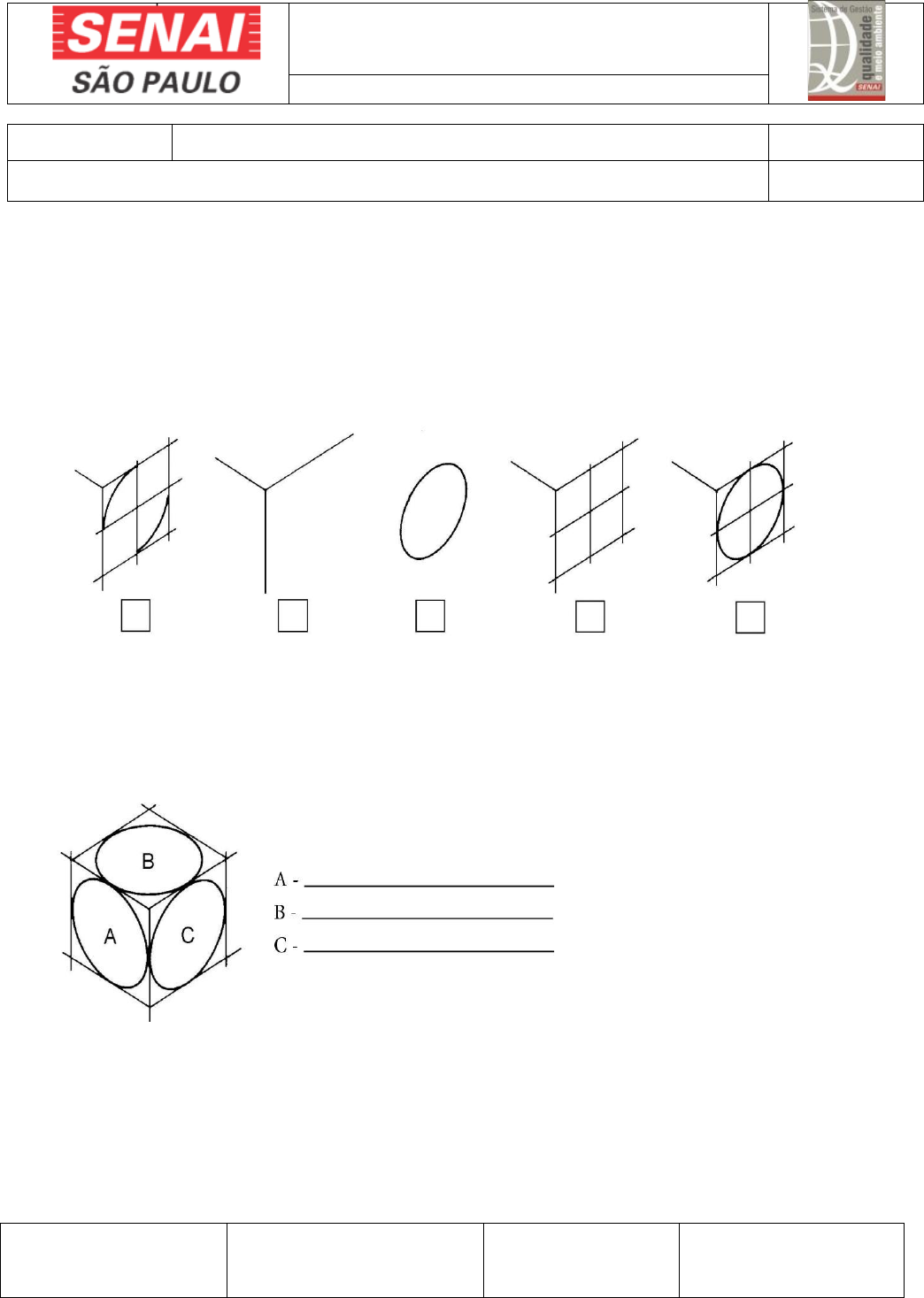 Escola SENAI "Almirante Tamandaré" Av. Pereira Barreto, 456 – CEP 09751-000 – São Bernardo do Campo – SP Telefone (0xx11) 4331-6050 – e-mail: senaitamandare@sp.senai.br / / NOTA Nome: N.º Turma: PROFESSOR COORDENADOR / INSTRUTOR ORIENTADOR DATA DE APROVAÇÃO DATA DE REVISÃO VISTO: / / / / CFP 1.20/ISO 9001:2008 – FR 1.20 – 92 – v.01 - DITEC - 008 Página 1 de 3 Perspectiva 1- Ordene as fases do traçado da perspectiva isométrica do círculo visto de frente, escrevendo os numerais de 1 a 5 nos quadros. 3 1 5 2 4 2- Escreva relacionando cada letra a posição que ela está indicando: frente, cima e lado. Lado cima frente Escola SENAI "Almirante Tamandaré" Av. Pereira Barreto, 456 – CEP 09751-000 – São Bernardo do Campo – SP Telefone (0xx11) 4122-5877 – e-mail: senaitamandare@sp.senai.br CFP 1.20/ISO 9001:2008 – FR 1.20 – 92 – v.01 - DITEC - 008 Página 2 de 3 Cotagem Identificar e aplicar os elementos de cotagem Analise o desenho técnico a baixo e responda às questões a seguir. a. Escreva dentro dos parênteses as letras correspondentes a cada elemento de cotagem. (b ) Linha de cota (c ) Linha auxiliar de cota (a ) Cota b. Escreva as cotas básicas. Comprimento: ___50mm__altura: ___20mm____ e largura: _____17mm_______. c. Escreva as cotas básicas que determinam o tamanho do rasgo: ____15______e ____11_____. d. Escreva a cota que determina a localização do rasgo: ____10_________. e. Escreva as cotas que determinam o tamanho do rebaixo____14______ e ___13________. Complete as frases, escrevendo as palavras faltantes nas linhas indicadas Escola SENAI "Almirante Tamandaré" Av. Pereira Barreto, 456 – CEP 09751-000 – São Bernardo do Campo – SP Telefone (0xx11) 4122-5877 – e-mail: senaitamandare@sp.senai.br CFP 1.20/ISO 9001:2008 – FR 1.20 – 92 – v.01 - DITEC - 008 Página 2 de 3 a. As linhas auxiliares de cota não encostam nas linhas do ___desenho________. b. A linha de ____cota_________encosta na linha auxiliar de cota. c. A linha ____auxiliar__________ultrapassa a linha de cota. d. A ____cota____________ não ultrapassa a linha de cota. e. A linha de__cota______ é uma linha __reta____e tem setas nas extremidades. f. Na linha de cota vertical, a cota deve ser escrita de baixo para _cima____ e ao lado _esquerdo________a linha de cota. g. Na linha de cota horizontal a cota deve ser escrita da _direita______ para a ___esquerda___ e sobre a linha de cota.