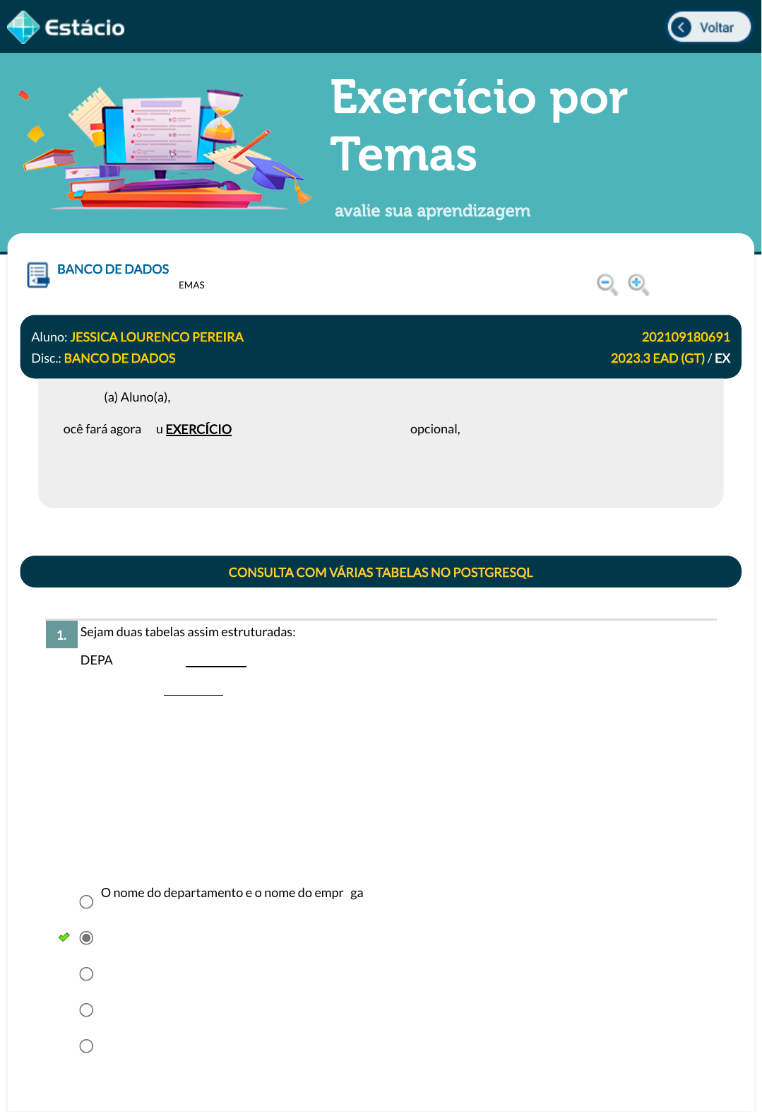 Exercício por Temas avalie sua aprendizagem Sejam duas tabelas assim estruturadas: DEPARTAMENTO(CODIGOD, NOME) EMPREGADO(CODIGOE, NOME, ENDERECO, CODIGOD) CODIGOD REFERENCIA DEPARTAMENTO Seja a consulta a seguir: SELECT D.NOME, E.NOME FROM DEPARTAMENTO D LEFT JOIN EMPREGADO E ON (D.CODIGOD=E.CODIGOD) ORDER BY D.NOME; A consulta retorna: BANCO DE DADOS Lupa DGT0282_202109180691_TEMAS Aluno: JESSICA LOURENCO PEREIRA Matr.: 202109180691 Disc.: BANCO DE DADOS 2023.3 EAD (GT) / EX Prezado (a) Aluno(a), Você fará agora seu EXERCÍCIO! Lembre-se que este exercício é opcional, mas não valerá ponto para sua avaliação. O mesmo será composto de questões de múltipla escolha. Após responde cada questão, você terá acesso ao gabarito comentado e/ou à explicação da mesma. Aproveite para se familiarizar com este modelo de questões que será usado na sua AV e AVS. CONSULTA COM VÁRIAS TABELAS NO POSTGRESQL 1. O nome do departamento e o nome do empregado alocado. Os empregados sem departamento e os departamentos sem empregado aparecem nos resultados. O nome do departamento e o nome do empregado alocado. Os departamentos sem funcionário aparecem no resultado. O nome do departamento e o nome do empregado alocado. Os empregados sem departamento aparecem no resultado. O nome do departamento e o nome do empregado alocado. Os empregados sem departamento não aparecem no resultado. O nome do departamento e o nome do empregado alocado. Os departamentos sem funcionário alocado não aparecem no resultado. Data Resp.: 18/10/2023 21:44:09 javascript:voltar(); javascript:voltar(); javascript:voltar(); javascript:voltar(); javascript:diminui(); javascript:diminui(); javascript:aumenta(); javascript:aumenta(); Considere que cada tabela a seguir pertence a um banco de dados distinto. Qual consulta retorna o nome e o CPF dos cidadãos que são clientes e alunos? Para obter todas as linhas da tabela B, o comando SELECT deverá utilizar na sequência um JOIN entre as tabelas A e B do tipo: Explicação: A resposta correta é: O nome do departamento e o nome do empregado alocado. Os departamentos sem funcionário aparecem no resultado. 2. SELECT NOME, CPF FROM CLIENTE MINUS SELECT NOME, CPF FROM ALUNO; SELECT NOME, CPF FROM ALUNO EXCEPT SELECT NOME, CPF FROM CLIENTE; SELECT NOME, CPF FROM CLIENTE INTERSECT SELECT NOME, CPF FROM ALUNO; SELECT NOME, CPF FROM ALUNO UNION SELECT NOME, CPF FROM CLIENTE; SELECT NOME, CPF FROM CLIENTE JOIN SELECT NOME, CPF FROM ALUNO; Data Resp.: 18/10/2023 21:46:22 Explicação: A resposta correta é: SELECT NOME, CPF FROM ALUNO UNION SELECT NOME, CPF FROM CLIENTE; 3. LEFT OUTER JOIN. CROSS JOIN. INNER JOIN. Considere a tabela a seguir: Seja a consulta: SELECT NOME, CPF, SEXO FROM EMPREGADO WHERE SEXO= 'F' OR SALARIO>5000; Qual alternativa a seguir representa um código equivalente ao da consulta acima? RIGHT OUTER JOIN. FULL OUTER JOIN. Data Resp.: 18/10/2023 21:47:43 Explicação: A resposta correta é: RIGHT OUTER JOIN. 4. SELECT NOME, CPF, SEXO FROM EMPREGADO WHERE SEXO= 'F' EXCEPT SELECT NOME, CPF, SEXO FROM EMPREGADO WHERE SALARIO>5000; SELECT NOME, CPF, SEXO FROM EMPREGADO WHERE SEXO= 'F' UNION SELECT NOME, CPF, SEXO FROM EMPREGADO WHERE SALARIO>5000; SELECT NOME, CPF, SEXO FROM EMPREGADO WHERE SALARIO>5000; SELECT NOME, CPF, SEXO FROM EMPREGADO WHERE SEXO= 'F' AND SALARIO>5000; Sejam as tabelas a seguir: Seja a consulta a seguir: SELECT CODIGONIVEL ,DESCRICAO FROM NIVEL WHERE CODIGONIVEL IN (SELECT DISTINCT CODIGONIVEL FROM CURSO); A consulta serve para: SELECT NOME, CPF, SEXO FROM EMPREGADO WHERE SEXO= 'F'; Data Resp.: 18/10/2023 21:49:45 Explicação: A resposta correta é: SELECT NOME, CPF, SEXO FROM EMPREGADO WHERE SEXO= 'F' UNION SELECT NOME, CPF, SEXO FROM EMPREGADO WHERE SALARIO>5000; 5. Exibir a descrição dos cursos e seus níveis. Exibir os cursos para os quais há pelo menos um nível associado. Exibir somente os níveis para os quais há mais de um curso associado. Exibir os níveis para os quais não há curso associado. Exibir os níveis para os quais há pelo menos um curso associado. Data Resp.: 18/10/2023 21:52:34 Explicação: A resposta correta é: Exibir os níveis para os quais há pelo menos um curso associado. Não Respondida Não Gravada Gravada Exercício por Temas inciado em 18/10/2023 21:33:13.