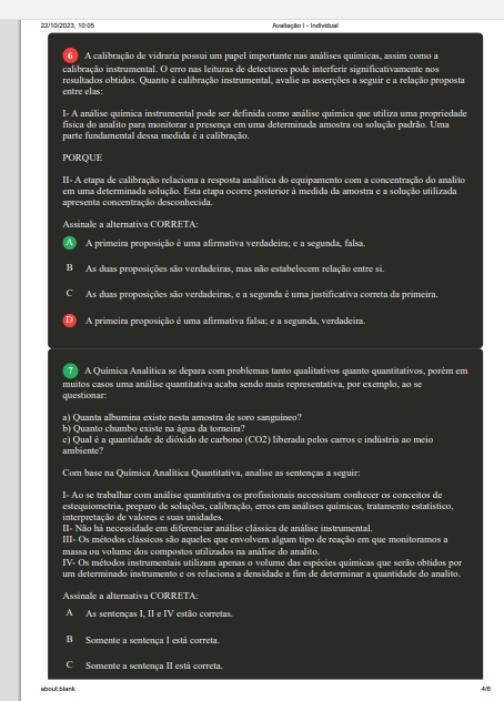 I- A quimica instrumental pode definida como analise quimica que utiliza uma propriedade fisica do analito para monitorar a presença cm determinada amostra ou solução padrão. Uma parte fundamental dessa medida calibração. II- A de calibração relaciona a resposta analitica do equipamento com a concentração do analito uma determinada solução. Esta ctapa posterior à medida da amostra a solução utilizada apresenta concentração desconhecida. A) A primeira proposição é uma afirmativa verdadeira: a segunda, falsa. B) As duas proposições sio mas não estabelecem relação entre C) As duas proposições sio verdadeiras, a segunda é uma justificativa correta da primeira. D) A primeira proposição é uma afirmativa falsa; a segunda,