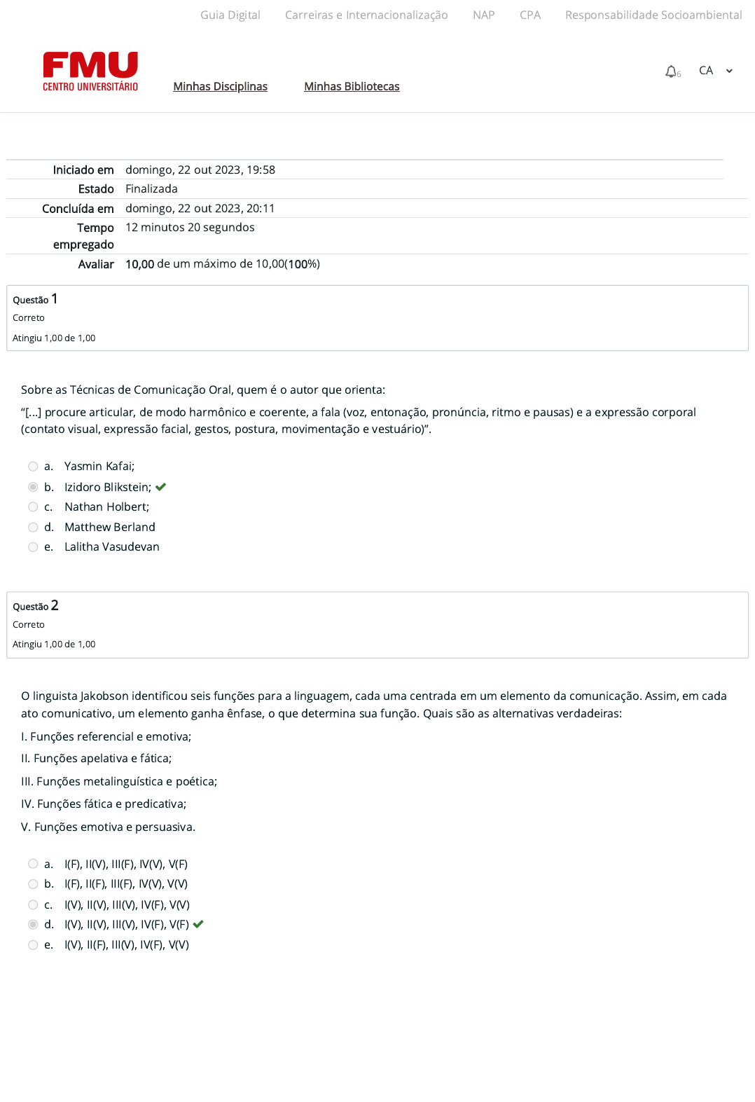 22/10/2023, 20:11 Atividade 3 (A3): Revisão da tentativa https://ambienteacademico.com.br/mod/quiz/review.php?attempt=3135883&cmid=1084086 1/5 Iniciado em domingo, 22 out 2023, 19:58 Estado Finalizada Concluída em domingo, 22 out 2023, 20:11 Tempo empregado 12 minutos 20 segundos Avaliar 10,00 de um máximo de 10,00(100%) Questão 1 Correto Atingiu 1,00 de 1,00 Questão 2 Correto Atingiu 1,00 de 1,00 Sobre as Técnicas de Comunicação Oral, quem é o autor que orienta: “[...] procure articular, de modo harmônico e coerente, a fala (voz, entonação, pronúncia, ritmo e pausas) e a expressão corporal (contato visual, expressão facial, gestos, postura, movimentação e vestuário)”. a. Yasmin Kafai; b. Izidoro Blikstein; c. Nathan Holbert; d. Matthew Berland e. Lalitha Vasudevan O linguista Jakobson identi�cou seis funções para a linguagem, cada uma centrada em um elemento da comunicação. Assim, em cada ato comunicativo, um elemento ganha ênfase, o que determina sua função. Quais são as alternativas verdadeiras: I. Funções referencial e emotiva; II. Funções apelativa e fática; III. Funções metalinguística e poética; IV. Funções fática e predicativa; V. Funções emotiva e persuasiva. a. I(F), II(V), III(F), IV(V), V(F) b. I(F), II(F), III(F), IV(V), V(V) c. I(V), II(V), III(V), IV(F), V(V) d. I(V), II(V), III(V), IV(F), V(F) e. I(V), II(F), III(V), IV(F), V(V) Guia Digital Carreiras e Internacionalização NAP CPA Responsabilidade Socioambiental Minhas Disciplinas Minhas Bibliotecas 6 CA https://codely-fmu-content.s3.amazonaws.com/Moodle/GuiaDigital/Guia+digital/index.html https://carreiras.fmu.br/ https://codely-fmu-content.s3.amazonaws.com/Moodle/NAP/inicial/nap/fmu/index.html https://codely-fmu-content.s3.amazonaws.com/Moodle/CPA/landing_CPA/index.html https://portal.fmu.br/sustentabilidade https://ambienteacademico.com.br/ https://ambienteacademico.com.br/ https://ambienteacademico.com.br/course/view.php?id=236 22/10/2023, 20:11 Atividade 3 (A3): Revisão da tentativa https://ambienteacademico.com.br/mod/quiz/review.php?attempt=3135883&cmid=1084086 2/5 Questão 3 Correto Atingiu 1,00 de 1,00 Questão 4 Correto Atingiu 1,00 de 1,00 É importante destacar que no período composto podem ser empregadas, para interligar orações, as conjunções ou locuções conjuntivas, como “porque”, “por isso”, “portanto”, “mas”, “assim”, entre outras. Essas conjunções exercem um importante papel __________, auxiliando, portanto, na manutenção das relações de sentido entre as partes de um texto. a. Norteador. b. Coesivo; c. Intercessor; d. Intertextual; e. Didático; Todo trabalho cientí�co é composto de três partes principais: I. elementos da coerência; II. elementos pré-textuais; III. elementos textuais; IV. elementos pós-textuais; V. elementos de concordância a. I(V), II(F), III(V), IV(F), V(V) b. I(V), II(F), III(F), IV(F), V(V) c. I(V), II(V), III(V), IV(V), V(V) d. I(F), II(F), III(F), IV(F), V(F) e. I(F), II(V), III(V), IV(V), V(F) Guia Digital Carreiras e Internacionalização NAP CPA Responsabilidade Socioambiental Minhas Disciplinas Minhas Bibliotecas 6 CA https://codely-fmu-content.s3.amazonaws.com/Moodle/GuiaDigital/Guia+digital/index.html https://carreiras.fmu.br/ https://codely-fmu-content.s3.amazonaws.com/Moodle/NAP/inicial/nap/fmu/index.html https://codely-fmu-content.s3.amazonaws.com/Moodle/CPA/landing_CPA/index.html https://portal.fmu.br/sustentabilidade https://ambienteacademico.com.br/ https://ambienteacademico.com.br/ https://ambienteacademico.com.br/course/view.php?id=236 22/10/2023, 20:11 Atividade 3 (A3): Revisão da tentativa https://ambienteacademico.com.br/mod/quiz/review.php?attempt=3135883&cmid=1084086 3/5 Questão 5 Correto Atingiu 1,00 de 1,00 Questão 6 Correto Atingiu 1,00 de 1,00 O tópico frasal é constituído por um ou dois períodos que concentram a principal ideia do parágrafo. Assim, cada parágrafo de um texto desenvolve uma ideia central e, às vezes, a conclui. É correto a�rmar: I. Que a linguagem mista ocorre quando não há a citação expressa da fonte ou de um trecho do texto-fonte. II. É relevante destacar que, por se tratar de um texto informativo e, assim sendo, objetivo e direto, todas as informações proporcionadas ao longo dos parágrafos possuem importância na construção textual. III. o tópico frasal não é a ideia mais importante, mas a ideia central na discussão realizada em cada parágrafo, a partir da qual outras surgem e se desenvolvem. IV. Além das características da comunicação escrita, é interessante que analisemos a comunicação oral, considerando suas particularidades e a relação existente entre oralidade e escrita, vistas como diferentes modalidades de um mesmo código: a língua. a. II, III e IV. b. Apenas III, IV. c. Apenas I e IV. d. Todas estão incorretas. e. Apenas I e II. Uma outra distinção entre a oralidade e a escrita é o seu planejamento e elaboração que: I. Enquanto a escrita tende a ser mais elaborada e planejada, a oralidade tende a ser mais espontânea e interativa. II. No texto escrito, caso cometamos algum desvio ou desejemos alterar o que escrevemos, é possível apagar e reescrever. III. Na oralidade, isso não é possível, uma vez que, caso algo inadequado seja dito, não há como apagar, o que se pode fazer é se desculpar pelo equívoco. IV. Na oralidade, isso não é possível, uma vez que, caso algo inadequado seja dito, não há como apagar, o que se pode fazer é se desculpar pelo equívoco. Além disso, o texto oral espontâneo costuma ser simples, com uso de frases curtas e com pouca densidade informacional. V. Existem textos orais complexos, como discursos acadêmicos e políticos, assim como há textos escritos bastante simples. Existem falas planejadas e escritas espontâneas. Sinalize quais das alternativas estão corretas a. II e V b. Apenas III e V estão corretas c. II e III d. I e IV e. Todas estão corretas. Gu