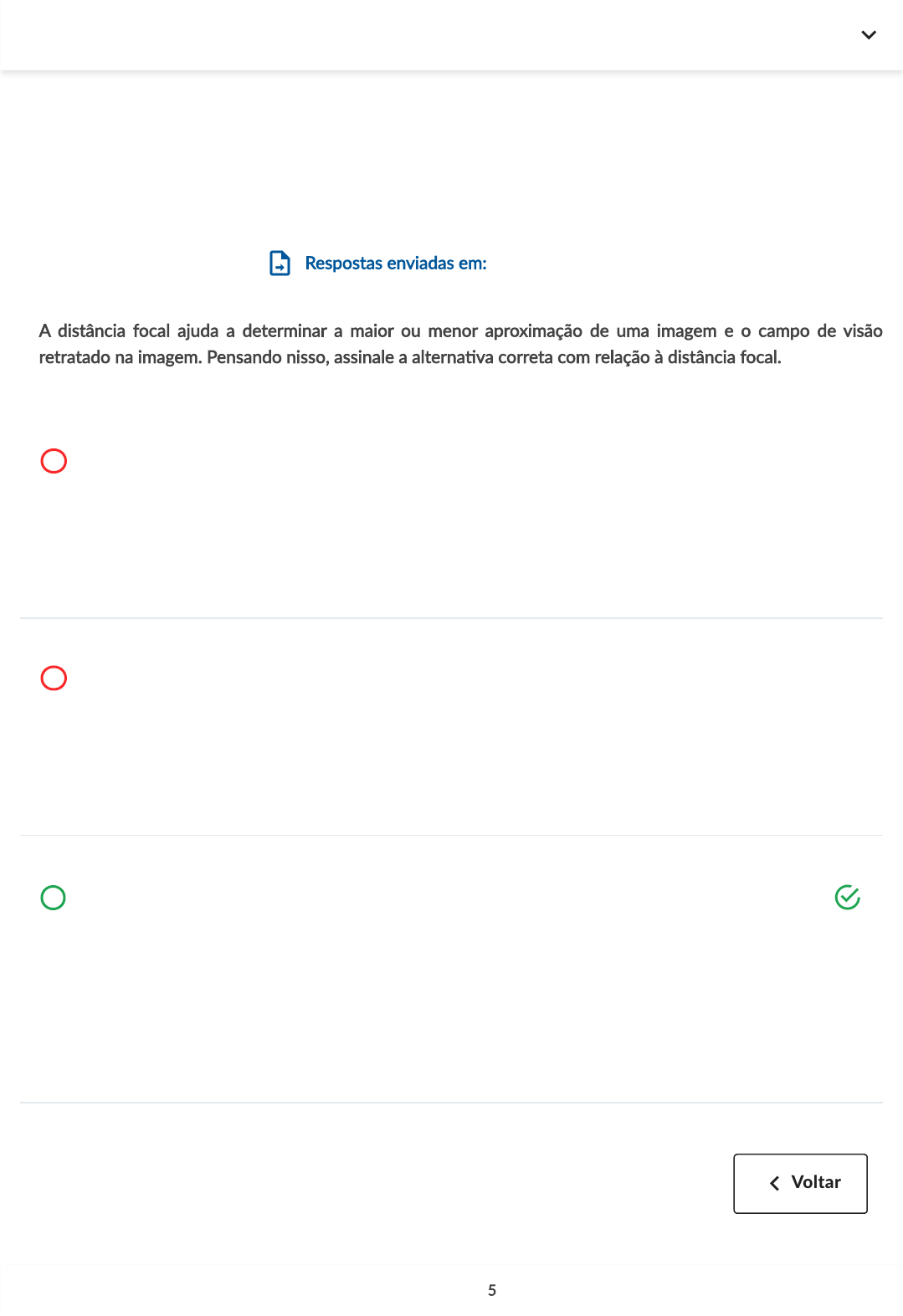 23/10/2023, 11:39 FOTOGRAFIA :: Plataforma A https://fmu.grupoa.education/sagah/object/default/61962673 1/2 Pré Teste Respostas enviadas em: 23/10/2023 11:36 5. A distância focal ajuda a determinar a maior ou menor aproximação de uma imagem e o campo de visão retratado na imagem. Pensando nisso, assinale a alterna�va correta com relação à distância focal. Resposta incorreta. A. A distância focal está presente principalmente nas teleobje�vas e grande angulares; A distância focal é o termo que nomeia a categorização das lentes (grande-angular, normal, teleobje�va, etc) logo é uma qualidade definidora de todas as lentes e não um recurso Resposta incorreta. B. A teleobje�va de 70-200mm apresenta um campo de visão maior que a grande angular de 24mm; O correto seria dizer ao contrário: a teleobje�va de 70-200mm apresenta um campo de visão menor que uma grande angular de 24mm, pois quanto maior o ângulo (24mm) maior o campo de visão. Você acertou! C. A lente com distância focal de 8 mm é chamada super grande angular. Sim, pois nas câmeras com sensores APS-C podemos classificar como super grande angular todas as distâncias focais que estejam abaixo de 15mm. Já em sensores full-frame, as super grande angulares são inferiores a 24mm. Voltar 5 de 5 perguntas Anterior Próximo U6 23/10/2023, 11:39 FOTOGRAFIA :: Plataforma A https://fmu.grupoa.education/sagah/object/default/61962673 2/2 5 de 5 perguntas Anterior Próximo U6 23/10/2023, 11:38 FOTOGRAFIA :: Plataforma A https://fmu.grupoa.education/sagah/object/default/61962673 1/2 Pré Teste Respostas enviadas em: 23/10/2023 11:36 4. A fotografia publicitária ao longo do tempo foi consolidando uma linguagem própria. Assinale a alterna�va correta com relação a ela: Resposta incorreta. A. fotografia Publicitária é uma linguagem que segue os mesmos preceitos esté�cos da fotografia de esporte e documental; A fotografia publicitária pode u�lizar elementos esté�cos da fotografia de esporte e documental, mas possuem intenções comerciais e ar�s�cas diferentes. Por isso, fazemos a separação dos gêneros fotográficos entre publicitário, espor�vo e documental. Você acertou! B. a fotografia publicitária pode ser u�lizada para evidenciar o conceito por trás de uma marca ou produto; Sim, pois a fotografia publicitária não é independente do planejamento estratégico de publicidade. Resposta incorreta. C. a fotografia publicitária, ao contrário da fotografia documental, u�liza a fotografia em preto & branco para retratar a realidade. Essa afirmação não é totalmente verificável, pois o preto & branco em diferentes contextos pode assumir uma proximidade maior ou menor com a realidade. Voltar Próximo 4 de 5 perguntas Anterior Próximo U6 23/10/2023, 11:38 FOTOGRAFIA :: Plataforma A https://fmu.grupoa.education/sagah/object/default/61962673 2/2 4 de 5 perguntas Anterior Próximo U6 23/10/2023, 11:38 FOTOGRAFIA :: Plataforma A https://fmu.grupoa.education/sagah/object/default/61962673 1/2 Pré Teste Respostas enviadas em: 23/10/2023 11:36 3. O Time Lapse é uma técnica fotográfica que permite registrar longos eventos em um espaço curto de tempo. Assinale a alterna�va correta sobre esta técnica. Resposta incorreta. A. As câmeras digitais não possuem o Time-Lapse como recurso incorporado às funções da câmera; Algumas câmeras digitais possuem o recurso de Time-Lapse integrado, que permite ao fotógrafo fixar e disparar a câmera e ela faz o serviço sozinha. Resposta incorreta. B. O Time Lapse é sinônimo de cinema, pois representa um sequenciamento de imagens com o intuito de formar um movimento; O Time Lapse é um recurso muito u�lizado pela produção audiovisual, mas não é sinônimo de cinema. Você acertou! C. É possível programar o Time Lapse para diferentes intervalos de tempo. Sim, no entanto algumas câmeras possuem um limite de intervalo de tempo, mas ele pode ser tranquilamente programável. Voltar Próximo 3 de 5 perguntas Anterior Próximo U6 23/10/2023, 11:38 FOTOGRAFIA :: Plataforma A https://fmu.grupoa.education/sagah/object/default/61962673 2/2 3 de 5 perguntas Anterior Próximo U6 23/10/2023, 11:38 FOTOGRAFIA :: Plataforma A https://fmu.grupoa.education/sagah/object/default/61962673 1/2 Pré Teste Respostas enviadas em: 23/10/2023 11:36 2. Queremos realizar uma fotografia noturna sem luzes ar�ficiais e dispomos de quatro lentes no nosso kit fotográfico: a lente normal 50mm f/1.4, a teleobje�va 70-200mm f/4, a grande angular 24mm f/1.4 e a super grande angular 8mm f/3.5. Considerando um ISO fixo, assinale a alterna�va que apresenta as obje�vas mais claras para esta tarefa: Resposta incorreta. A. a lente normal 50mm f/1.4 e a a teleobje�va 70-200mm f/4; Como o ISO estará fixo e o enunciado não apresenta nenhum outro acessório, como tripé, podemos eliminar a lente teleobje�va. Já que sua abertura de íris de 4 é menor em comparação a outras lentes apresentadas e, portanto, é uma lente mais escura. Você acertou! B. a lente normal 50mm f/1.4 e a a grande angular 24mm f/1.4; Pois são lentes claras, ou seja, a abertura de 1.4 da íris deixa entrar mais luz. Logo, serão mais eficientes na captura de imagens noturnas. Resposta incorreta. C. a lente normal 50mm f/1.4 e a super grande angular 8mm f/3.5. Como o ISO estará fixo e o enunciado não apresenta nenhum outro acessório, como tripé, podemos eliminar a lente grande angular. Já que sua abertura de íris de 3.5 é menor em comparação a outras lentes apresentadas e, portanto, entra menos luz. Voltar Próximo 2 de 5 perguntas Anterior Próximo U6 23/10/2023, 11:38 FOTOGRAFIA :: Plataforma A https://fmu.grupoa.education/sagah/object/default/61962673 2/2 2 de 5 perguntas Anterior Próximo U6 23/10/2023, 11:37 FOTOGRAFIA :: Plataforma A https://fmu.grupoa.education/sagah/object/default/61962673 1/2 Pré Teste Respostas enviadas em: 23/10/2023 11:36 1. A íris é o mecanismo da obje�