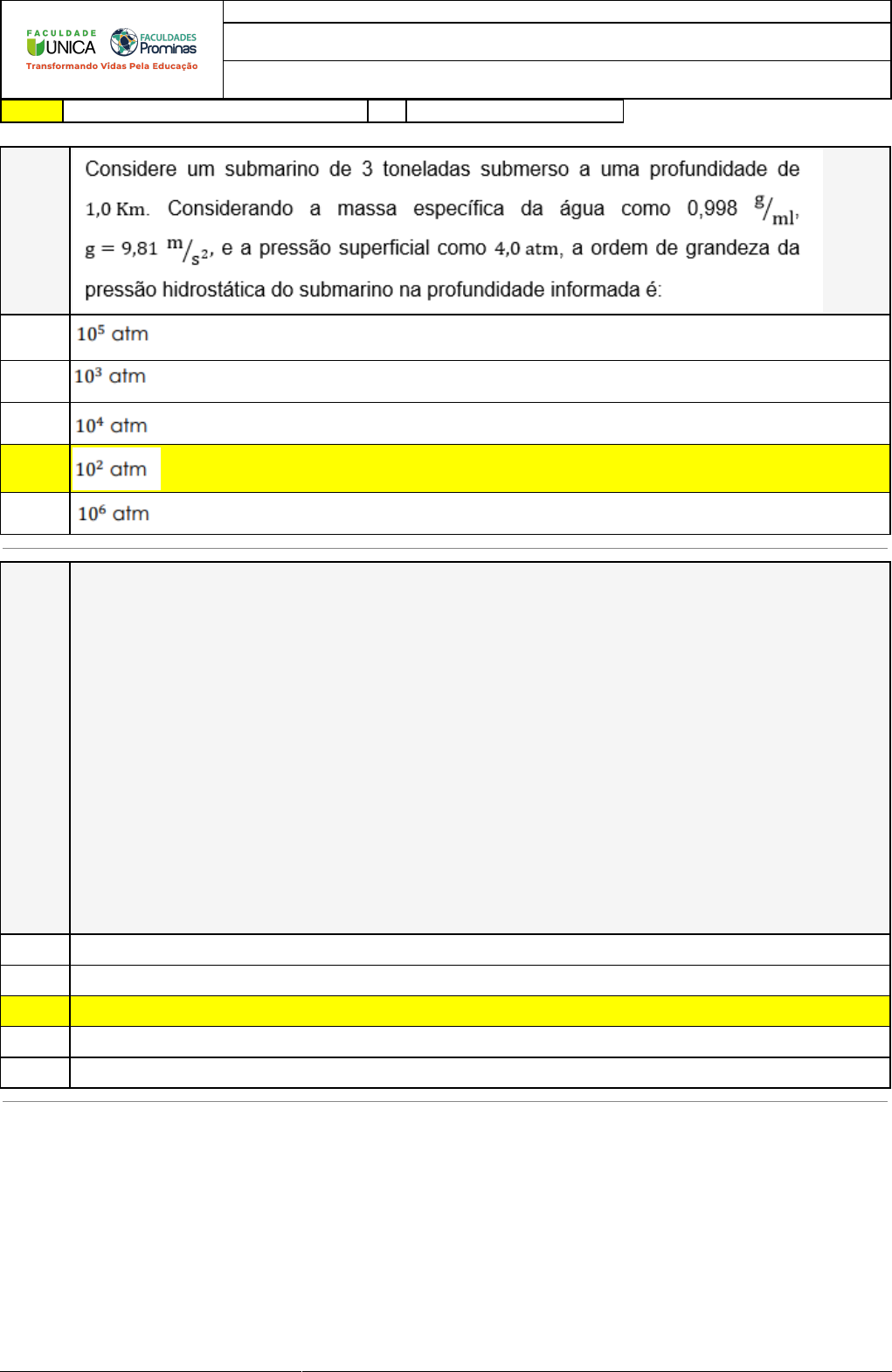 19/09/2023 18:46:59 1/3 REVISÃO DE SIMULADO Nome: FERNANDA COLERNIK Disciplina: Física II Respostas corretas são marcadas em amarelo X Respostas marcardas por você. Questão 001 A) B) C) X D) E) Questão 002 Leia o trecho abaixo: Quando mergulhamos em uma piscina ou um lago, podemos sentir uma pequena perturbação em nossos ouvidos. Quanto mais fundo adentramos, maior será esse incômodo. Deste modo, a quantidade de água existe no lugar onde estamos mergulhando não influencia no incômodo sentido pelos nossos tímpanos. Adaptado de: HEWITT, P. G. Física Conceitual. Trad. Trieste Freire Ricci e Maria Helena Gravina. 9 ed. Porto Alegre: Bookman, 2002. Diante da situação apresentada, analise as afirmativas a seguir: I. A perturbação relatada pelo trecho diz respeito à grandeza física pressão, que nos líquidos é chamada de pressão hidrostática. II. A quantidade de água citada refere-se, basicamente, à força da mesma sobre os ouvidos. III. A grandeza física densidade é o que permite que os corpos boiem ou submerjam nos líquidos. Estão corretas apenas as afirmativas A) II e III, apenas. B) I e II, apenas. X C) I e III, apenas. D) I, apenas. E) III, apenas. 19/09/2023 18:46:59 2/3 Questão 003 Leia o trecho abaixo: Um nadador precisa empurrar ou puxar a água para se movimentar. A água é, naturalmente, fluída e, portanto, o empurrão ou puxão não é tão eficaz como se fosse exercido em um objeto sólido. Ao acrescentarmos alguma coisa à água podemos torná- la mais viscosa, ou seja, menos fluída. Assim, poderíamos melhorar o tempo de nado nessa água melada. Adaptado de WALKER, J. O grande circo da física. Trad. Jorge Antonio Valadares. Grandiva publicações: Lisboa, 2001. Considerando as informações contidas no trecho citado, avalie a seguintes asserções e a relação proposta entre elas. I. O fato de tornar a água menos fluída não altera o tempo de nado. PORQUE II. A força empregada pelo nadador nessa água melada torna-se maior, devido ao aumento da viscosidade e, então, o tempo não necessariamente será menor para o nado. A respeito destas asserções, assinale a opção correta. A) As asserções I e II são proposições falsas. B) A asserção I é uma proposição falsa e, a II é uma proposição verdadeira. C) A asserção I é uma proposição verdadeira e, a II é uma proposição falsa. D) As asserções I e II são proposições verdadeiras, mas a II não é uma justificativa da I. X E) As asserções I e II são proposições verdadeiras, e a II é uma justificativa da I. Questão 004 Um cilindro de 20 cm de raio, 10 cm de altura é inserido em um recipiente contendo 25 litros de água. Considerando g = 10 m/s , qual é empuxo exercido sobre este cilindro dentro do recipiente? Considere, também, que π = 3. A) 25 N B) 1,20 N C) 20 N D) 0,12 N X E) 12 N Questão 005 Leia o trecho abaixo: Quando a água escoa de uma banheira, ela gira acima do ralo formando um redemoinho. Além disso, tal movimento de rotação possui um sentido a depender da região em que se encontra (hemisfério norte ou sul do planeta). Uma das maiores curiosidades da física é justamente a explicação destes redemoinhos, que muitas vezes são comparados com os furacões e tufões. Cabe destacar que o fluxo de água da banheira, por exemplo, é um sistema de pequenas dimensões e, está sujeito a efeitos muito mais intensos que aquele chamado de Efeito Coriolis. Adaptado de WALKER, J. O grande circo da física. Trad. Jorge Antonio Valadares. Grandiva publicações: Lisboa, 2001. Diante das informações apresentadas, avalie as afirmativas abaixo: I. Todos os movimentos de rotação de fluidos possuem uma única força de ação como causa. II. Tal movimento deve-se, também, ao efeito Coriolis. Este caracteriza-se por um desvio do fluxo de ar no sentido anti-horário no hemisfério norte e horário no hemisfério sul. III. As dimensões da banheira também podem influenciar no movimento de rotação do redemoinho, como a existência ou não de simetria. É correto o que se afirma em A) II, apenas. 19/09/2023 18:46:59 3/3 B) I, apenas. C) I e II, apenas. X D) II e III, apenas. E) III, apenas. Questão 006 Leia o trecho abaixo: No movimento diário de rotação da Terra sobre seu eixo, a Lua, tal qual o Sol, aparentemente nasce no Leste e se põe no Oeste. No meio-dia lunar, ela está situada verticalmente sobre nossas cabeças, atraindo mais intensamente as águas do que a Terra, fazendo com que as águas subam, provocando uma maré alta. Quando ocorre a meia noite lunar, é a Terra que é mais atraída do que as águas, deixando-as para cima, ocorrendo também um movimento de maré alta. Como as águas no planeta afluem simultaneamente em direção às regiões polares dos eixos, ocorrerá também a maré baixa nos eixos coordenados leste e oeste. Adaptado de ROCHA, J. F. M. (org.); PONCZEK, R. I. L.; PINHO, S. T. R.; ANDRADE, R. F. S.; FREIRE JR., O.; FILHO, A. R. Origens e evolução das ideias da física. Salvador: EDUFBA, 2002. De acordo as informações apresentadas, avalie as afirmativas abaixo: I. O fenômeno das marés observado no planeta Terra deve-se ao efeito da força gravitacional existente entre Terra - Lua. II. No trecho destacado, as marés (águas dos oceanos em movimento) são influenciadas por uma força. Tal força depende do quadrado da distância entre a superfície e o oceano. III. A força de gravidade existente entre a Terra e a Lua depende do quadrado da distância entre ambos, o que influencia substancialmente o movimento dos fluidos terrestres quando a Lua está mais próxima ou mais distante de uma determinada região do planeta. É correto o que se afirma em A) III apenas. B) I, apenas. X C) I e III, apenas. D) II, apenas. Questão 007 Uma torneira cilíndrica possui raio de abertura de 10 cm. Se esta torneira possui vazão de 0,6 l/s, quantos litros serão consumidos em um intervalo de 4 horas? A) 7,0. 10 l X B) 8,6. 10 l C) 8,4