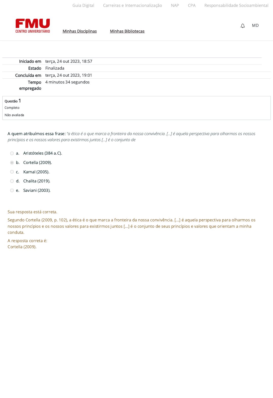 24/10/2023, 19:02 Atividade Formativa 1: Revisão da tentativa https://ambienteacademico.com.br/mod/quiz/review.php?attempt=3153390&cmid=1094578 1/4 Iniciado em terça, 24 out 2023, 18:57 Estado Finalizada Concluída em terça, 24 out 2023, 19:01 Tempo empregado 4 minutos 34 segundos Questão 1 Completo Não avaliada A quem atribuímos essa frase: “a ética é o que marca a fronteira da nossa convivência. [...] é aquela perspectiva para olharmos os nossos princípios e os nossos valores para existirmos juntos [...] é o conjunto de seus princípios e valores que orientam a minha conduta.” a. Aristóteles (384 a.C). b. Cortella (2009). c. Karnal (2005). d. Chalita (2019). e. Saviani (2003). Sua resposta está correta. Segundo Cortella (2009, p. 102), a ética é o que marca a fronteira da nossa convivência. [...] é aquela perspectiva para olharmos os nossos princípios e os nossos valores para existirmos juntos [...] é o conjunto de seus princípios e valores que orientam a minha conduta. A resposta correta é: Cortella (2009). Guia Digital Carreiras e Internacionalização NAP CPA Responsabilidade Socioambiental Minhas Disciplinas Minhas Bibliotecas MD https://codely-fmu-content.s3.amazonaws.com/Moodle/GuiaDigital/Guia+digital/index.html https://carreiras.fmu.br/ https://codely-fmu-content.s3.amazonaws.com/Moodle/NAP/inicial/nap/fmu/index.html https://codely-fmu-content.s3.amazonaws.com/Moodle/CPA/landing_CPA/index.html https://portal.fmu.br/sustentabilidade https://ambienteacademico.com.br/ https://ambienteacademico.com.br/ https://ambienteacademico.com.br/course/view.php?id=236 24/10/2023, 19:02 Atividade Formativa 1: Revisão da tentativa https://ambienteacademico.com.br/mod/quiz/review.php?attempt=3153390&cmid=1094578 2/4 Questão 2 Completo Não avaliada Ciência que analisa, estuda, aprecia a humanidade, procurando interpretar / explanar o que é bom e o que é ruim, o que é certo e o que é errado, o que é permitido e o que é proibido dentro na sociedade. Aborda o comportamento, os desejos e as vontades de todos nós e envolve estudos de aprovação ou desaprovação de condutas. Estamos falando em: Assinale a alternativa correta: a. Filoso�a. b. Moral. c. Coletividade. d. Cidadania. e. Ética. Sua resposta está correta. Ética é a ciência que analisa, estuda, aprecia a humanidade, procurando interpretar / explanar o que é bom e o que é ruim, o que é certo e o que é errado, o que é permitido e o que é proibido dentro na sociedade. Aborda o comportamento, os desejos e as vontades de todos nós e envolve estudos de aprovação ou desaprovação de condutas. A resposta correta é: Ética. Guia Digital Carreiras e Internacionalização NAP CPA Responsabilidade Socioambiental Minhas Disciplinas Minhas Bibliotecas MD https://codely-fmu-content.s3.amazonaws.com/Moodle/GuiaDigital/Guia+digital/index.html https://carreiras.fmu.br/ https://codely-fmu-content.s3.amazonaws.com/Moodle/NAP/inicial/nap/fmu/index.html https://codely-fmu-content.s3.amazonaws.com/Moodle/CPA/landing_CPA/index.html https://portal.fmu.br/sustentabilidade https://ambienteacademico.com.br/ https://ambienteacademico.com.br/ https://ambienteacademico.com.br/course/view.php?id=236 24/10/2023, 19:02 Atividade Formativa 1: Revisão da tentativa https://ambienteacademico.com.br/mod/quiz/review.php?attempt=3153390&cmid=1094578 3/4 Questão 3 Completo Não avaliada Questão 4 Completo Não avaliada A responsabilidade social difere da �lantropia porque reflete consciência social e dever cívico. Pensando nessa questão, a responsabilidade social diz respeito a: Assinale a alternativa correta: a. Decisões unilaterais; preocupação com lucros, visão da mídia; marketing. b. Ação coletiva; fomento da cidadania; base estratégica; extensiva a todos; demanda gerenciamento; decisão consensual. c. Restrita a grandes empresários; ligada a �lantropia; decisões individuais; visão do lucro. d. Decisão individual; fomento da cidadania, restrita apenas alguns ramos da indústria; visão assistencialista. e. Base assistencialista; ações individuais; fomento de caridade; não inclusiva. Sua resposta está correta. Diferenças entre a Filantropia e a Responsabilidade Social: Filantropia: Ação individual e voluntária; Fomento da caridade; Base assistencialista; Restrita a empresários �lantrópicos e abnegados; Prescinde de gerenciamento; Decisão individual. Responsabilidade Social: Ação coletiva; Fomento da cidadania; Base estratégica; Extensiva a todos; Demanda gerenciamento; Decisão consensual. A resposta correta é: Ação coletiva; fomento da cidadania; base estratégica; extensiva a todos; demanda gerenciamento; decisão consensual. Quem disse a seguinte frase: “A responsabilidade social é um grande fator de mudança nas empresas. Por meio da mudança do comportamento empresarial podemos promover mudanças sociais que levarão o nosso país a uma prosperidade econômica e social justa.” Assinale a alternativa correta: a. Ashley (2003). b. Grajew (2000). c. Gil (2001). d. Filho (2002). e. Pimentel e Marasea (2004). Sua resposta está correta. Segundo Grajew (2000), a responsabilidade social é um grande fator de mudança nas empresas. Por meio da mudança do comportamento empresarial podemos promover mudanças sociais que levarão o nosso país a uma prosperidade econômica e social justa. A resposta correta é: Grajew (2000). Guia Digital Carreiras e Internacionalização NAP CPA Responsabilidade Socioambiental Minhas Disciplinas Minhas Bibliotecas MD https://codely-fmu-content.s3.amazonaws.com/Moodle/GuiaDigital/Guia+digital/index.html https://carreiras.fmu.br/ https://codely-fmu-content.s3.amazonaws.com/Moodle/NAP/inicial/nap/fmu/index.html https://codely-fmu-content.s3.amazonaws.com/Moodle/CPA/landing_CPA/index.html https://portal.fmu.br/sustentabilidade https://ambienteacademico.com.br/ https://ambienteacademico.com.br/ https://ambienteacademico.com.br/course/view.php?id=236 24/10/