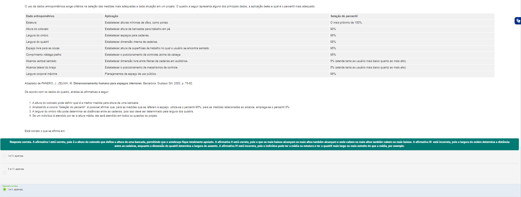 1. A altura do cotovelo pode definir qual é a melhor medida para altura de uma bancada. 2. Analisando a coluna do quadro, é possível afirmar que, para as medidas que se referem a estatura, emprega-se percentil 95%, e para as medidas relacionadas a alcance, emprega-se percentil 5%. 3. A largura do ombro não pode determinar as distâncias entre as cadeiras, pois isso deve ser determinado pela largura dos quadril. 4. Se um indivíduo é atendido por ter altura, ele será atendido em todos os quesitos. a) Apenas a afirmativa 1 está correta. b) Apenas a afirmativa 2 está correta. c) Apenas a afirmativa 3 está correta. d) Apenas a afirmativa 4 está correta. e) As afirmativas 1, 2 e 3 estão corretas.