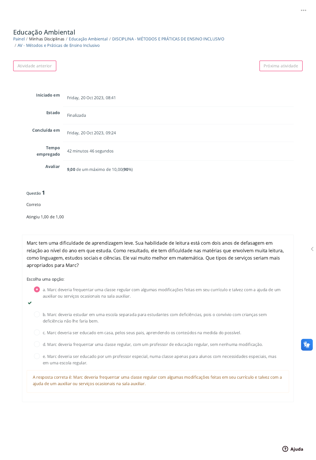 Painel / Minhas Disciplinas / Educação Ambiental / DISCIPLINA - MÉTODOS E PRÁTICAS DE ENSINO INCLUSIVO / AV - Métodos e Práticas de Ensino Inclusivo Educação Ambiental Atividade anterior Próxima atividade Iniciado em Friday, 20 Oct 2023, 08:41 Estado Finalizada Concluída em Friday, 20 Oct 2023, 09:24 Tempo empregado 42 minutos 46 segundos Avaliar 9,00 de um máximo de 10,00(90%) Questão 1 Correto Atingiu 1,00 de 1,00 Marc tem uma di�culdade de aprendizagem leve. Sua habilidade de leitura está com dois anos de defasagem em relação ao nível do ano em que estuda. Como resultado, ele tem di�culdade nas matérias que envolvem muita leitura, como linguagem, estudos sociais e ciências. Ele vai muito melhor em matemática. Que tipos de serviços seriam mais apropriados para Marc? Escolha uma opção: A resposta correta é: Marc deveria frequentar uma classe regular com algumas modi�cações feitas em seu currículo e talvez com a ajuda de um auxiliar ou serviços ocasionais na sala auxiliar. a. Marc deveria frequentar uma classe regular com algumas modi�cações feitas em seu currículo e talvez com a ajuda de um auxiliar ou serviços ocasionais na sala auxiliar. b. Marc deveria estudar em uma escola separada para estudantes com de�ciências, pois o convívio com crianças sem de�ciência não lhe faria bem. c. Marc deveria ser educado em casa, pelos seus pais, aprendendo os conteúdos na medida do possível. d. Marc deveria frequentar uma classe regular, com um professor de educação regular, sem nenhuma modi�cação. e. Marc deveria ser educado por um professor especial, numa classe apenas para alunos com necessidades especiais, mas em uma escola regular. Ajuda https://online.fetes.edu.br/posgraduacao/my/ https://online.fetes.edu.br/posgraduacao/my/ https://online.fetes.edu.br/posgraduacao/course/view.php?id=1126 https://online.fetes.edu.br/posgraduacao/course/view.php?id=1126#section-2 https://online.fetes.edu.br/posgraduacao/mod/quiz/view.php?id=12696 https://online.fetes.edu.br/posgraduacao/mod/label/view.php?id=27219 https://online.fetes.edu.br/posgraduacao/mod/label/view.php?id=27220 https://online.fetes.edu.br/posgraduacao Questão 2 Correto Atingiu 1,00 de 1,00 Juliana é uma aluna com paralisia cerebral. Isso faz com que seus movimentos sejam um pouco limitados. Seu professor encontrou para Juliana um teclado alternativo para facilitar seu aprendizado. Que tipo de tecnologia o professor está propondo à Juliana? Escolha uma opção: A resposta correta é: Tecnologia auxiliar. Questão 3 Correto Atingiu 1,00 de 1,00 Criar uma sala de aula inclusiva é muito mais que preparar um ambiente físico, para acolher todos os alunos, inclusive os portadores de necessidades especiais. Um dos fatores básicos que deve ser considerado pelo professor é: Escolha uma opção: A resposta correta é: Compreender o que signi�ca a palavra inclusão no contexto escolar é fundamental para o desenvolvimento do trabalho do professor. a. Aplicação construtiva. b. Tecnologia instrutiva. c. Hipermídia complexa. d. Tecnologia auxiliar. e. Software de instrução. a. Salas de aula que acolhem turmas de educação inclusiva já são totalmente planejadas no seu aspecto físico para atender ao aluno de�ciente. b. A adaptação curricular não é necessária, sendo que os currículos são elaborados por pro�ssionais especializados. c. O ensino em equipe substitui o atendimento individual ao aluno com necessidades educacionais especiais. d. Compreender o que signi�ca a palavra inclusão no contexto escolar é fundamental para o desenvolvimento do trabalho do professor. e. O ensino em equipe substitui o atendimento individual ao aluno com necessidades educacionais especiais. https://online.fetes.edu.br/posgraduacao Questão 4 Incorreto Atingiu 0,00 de 1,00 O grande desa�o da mudança para a educação inclusiva é a conscientização de que ela não é apenas uma meta, mas uma jornada com o propósito de acolher todos os alunos e com eles desenvolver um trabalho que os leve a uma vida digna e com igualdade de direitos em todas as áreas: de educação, saúde, trabalho, segurança, lazer, integridade física e moral. Todos os pro�ssionais envolvidos precisam de capacitação adequada para exercer sua função, por meio de formação, avaliações e reciclagens. Com relação à formação e capacitação, assinale a alternativa CORRETA: Escolha uma opção: A resposta correta é: Os fatores capacidade e competência dos professores de classe são básicos para que a inclusão de fato aconteça nas escolas. Questão 5 Correto Atingiu 1,00 de 1,00 O termo "educação inclusiva" faz parte das diretrizes educacionais do Brasil e de vários outros países do mundo. É um processo que ainda gera uma preocupação a respeito da compreensão ampla de seu signi�cado. Um modo de compreender corretamente o que o termo propõe, para que a prática da educação inclusiva obtenha sucesso, consiste em: Escolha uma opção: A resposta correta é: Voltar-se para o bem-estar e sucesso educacional de todos no ambiente do ensino regular. a. A formação se constrói, especi�camente, através de cursos de conhecimentos ou de aprendizagem de novas técnicas. b. Os fatores capacidade e competência dos professores de classe são básicos para que a inclusão de fato aconteça nas escolas. c. O professor de escola pública que já atuava em turmas comuns deve procurar, por si mesmo, recursos que o capacitem para trabalhar com a inclusão. d. A reciclagem e a formação se destinam somente aos professores das classes, pois são eles que estão diretamente lidando com os alunos. e. A experiência e postura de pro�ssionais da educação com mais tempo de carreira é sempre positiva na capacitação de professores novatos. a. Focar apenas nas adaptações físicas das escolas regulares. b. Afrouxar o currículo acadêmico para que todos os alunos sintam-se igualmente capazes. c. Compreender 