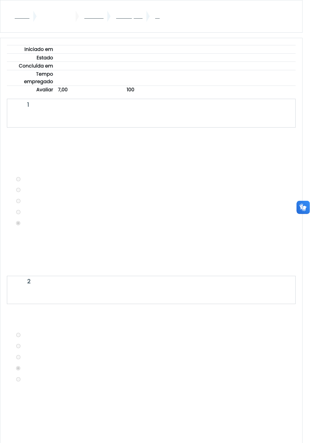 21/10/2023, 09:58 R1: Revisão da tentativa https://ead.universo.edu.br/mod/quiz/review.php?attempt=1959670&cmid=599390 1/11 Painel Meus cursos N0041D1 Avaliações R1 Iniciado em sábado, 21 out 2023, 08:32 Estado Finalizada Concluída em sábado, 21 out 2023, 09:42 Tempo empregado 1 hora 9 minutos Avaliar 7,00 de um máximo de 7,00(100%) Questão 1 Correto Atingiu 0,35 de 0,35 Questão 2 Correto Atingiu 0,35 de 0,35 Se 2 = 128, qual é o valor de x é : Escolha uma opção: a. 21 b. 576 c. 356 d. 169 e. 343 x 3 Sua resposta está correta. A resposta correta é: 343 A distância entre os pontos M (4,-5) e N (-1,7) do plano x0y vale: a. 8 b. 14 c. 12 d. 13 e. 9 Sua resposta está correta. A resposta correta é: 13 https://ead.universo.edu.br/my/ https://ead.universo.edu.br/course/view.php?id=3086 https://ead.universo.edu.br/course/view.php?id=3086#section-7 https://ead.universo.edu.br/mod/quiz/view.php?id=599390 21/10/2023, 09:58 R1: Revisão da tentativa https://ead.universo.edu.br/mod/quiz/review.php?attempt=1959670&cmid=599390 2/11 Questão 3 Correto Atingiu 0,35 de 0,35 Questão 4 Correto Atingiu 0,35 de 0,35 Um motorista de Uber cobra um valor de R$ 0,50 por quilômetro rodado. a) qual a função representada pelo valor cobrado? b) Quanto será cobrado por uma viagem de 100 Km? Escolha uma opção: a. f(x) = 50x; R$50 b. f(x) = 0,5x; R$500 c. f(x) = 5x; R$50 d. f(x) = 0,05x; R$ 500 e. f(x) = 0,5x; R$50 Sua resposta está correta. A resposta correta é: f(x) = 0,5x; R$50 Um profissional recebeu R$2000,00 para dar 20 horas de aula em um curso de especialização. Qual será o valor que ele receberá para dar 25 horas de aula? Escolha uma opção: a. R$ 1725,00 b. R$ 1.875,00 c. R$ 2500,00 d. R$ 1850,00 e. R$ 1995,00 Sua resposta está correta. A resposta correta é: R$ 2500,00 21/10/2023, 09:58 R1: Revisão da tentativa https://ead.universo.edu.br/mod/quiz/review.php?attempt=1959670&cmid=599390 3/11 Questão 5 Correto Atingiu 0,35 de 0,35 Questão 6 Correto Atingiu 0,35 de 0,35 Um consultório de psicologia está avaliando pacientes para diferentes transtornos. Eles observaram que 40 pacientes avaliados para transtorno de ansiedade também têm sintomas de transtorno de depressão. Se eles avaliaram um total de 120 pacientes para transtorno de ansiedade e 180 pacientes para transtorno de depressão, quantos pacientes têm somente sintomas de transtornos de ansiedade? a. 220 b. 80 c. 100 d. 40 e. 120 Sua resposta está correta. A resposta correta é: 80 Calcular o termo desconhecido na proporção: 7/21 = 13/ x Escolha uma opção: a. x=26 b. x=39 c. x=33 d. x=11 e. x=19 Sua resposta está correta. A resposta correta é: x=39 21/10/2023, 09:58 R1: Revisão da tentativa https://ead.universo.edu.br/mod/quiz/review.php?attempt=1959670&cmid=599390 4/11 Questão 7 Correto Atingiu 0,35 de 0,35 Questão 8 Correto Atingiu 0,35 de 0,35 A tabela abaixo apresenta a distribuição de frequências das idades de um grupo de crianças. A média das idades dessas crianças, em anos, é Escolha uma opção: a. 5,2 b. 5,4 c. 5,6 d. 5,0 e. 5,8 Sua resposta está correta. A resposta correta é: 5,4 A pandemia de Covid-19 levou as pessoas a buscarem lugares maiores e mais confortáveis para morar. Em uma cidade foram vendidos 400 imóveis, entre casas e apartamentos, no ano de 2021. A razão entre o número de apartamentos e o número de casas vendidos nesse ano foi de 3/5. Quantas casas foram vendidas em 2021? a. 240 b. 150 c. 250 d. 160 e. 200 Sua resposta está correta. A resposta correta é: 250 21/10/2023, 09:58 R1: Revisão da tentativa https://ead.universo.edu.br/mod/quiz/review.php?attempt=1959670&cmid=599390 5/11 Questão 9 Correto Atingiu 0,35 de 0,35 Questão 10 Correto Atingiu 0,35 de 0,35 Com base na tabela de frequência dada abaixo, pode-se afirmar que a maioria das opiniões foram: a. Houve empate b. Não foi possível avaliar c. Negativas d. Positivas e. Neutras Sua resposta está correta. A resposta correta é: Positivas Na promoção de uma loja de eletrodomésticos, um aparelho de som que custava R$ 400,00 teve um desconto de 12%. Quanto o cliente que decidir comprar o equipamento pagará? Escolha uma opção: a. R$ 352,00 b. R$ 362,00 c. R$ 342,00 d. R$ 372,00 e. R$ 358,00 Sua resposta está correta. A resposta correta é: R$ 352,00 21/10/2023, 09:58 R1: Revisão da tentativa https://ead.universo.edu.br/mod/quiz/review.php?attempt=1959670&cmid=599390 6/11 Questão 11 Correto Atingiu 0,35 de 0,35 Questão 12 Correto Atingiu 0,35 de 0,35 Em uma determinada semana uma empresa recebeu as seguintes quantidades de pedidos para os produtos A e B: Assinale a opção que apresente os coeficientes de variação dos dois produtos: Escolha uma opção: a. CVA = 16,1% e CVB = 15,1% b. CVA = 16,1% e CVB = 12,3% c. CVA = 15,1% e CVB = 12,3% d. CVA = 15,1% e CVB = 10,3% e. CVA = 16,1% e CVB = 10,3% Sua resposta está correta. A resposta correta é: CVA = 16,1% e CVB = 10,3% A distância entre os pontos A (-2, y) e B (6, 7) é 10. O valor de y é: a. 2 ou 12 b. 0 c. -1 d. -1 ou 10 e. 1 ou 13 Sua resposta está correta. A resposta correta é: 1 ou 13 21/10/2023, 09:58 R1: Revisão da tentativa https://ead.universo.edu.br/mod/quiz/review.php?attempt=1959670&cmid=599390 7/11 Questão 13 Correto Atingiu 0,35 de 0,35 Questão 14 Correto Atingiu 0,35 de 0,35 Analisando-se os intervalos reais abaixo, determine a solução de A ∩ B, sendo A = ] 5, 12] e B = [ 1, 9 ]? a. ] 5, 9 ] b. ] 5 , 12 ] c. [ 9, 12 ] d. [ 1, 12 ] e. [ 1, 5 [ Sua resposta está correta. A resposta correta é: ] 5, 9 ] Uma mercadoria no valor de R$ 1.260,00 teve seu valor ajustado para R$ 1.033,20. Determine a taxa de desconto utilizada. Escolha uma opção: a. 18% b. 13% c. 19% d. 15% e. 17% Sua resposta está correta. A resposta correta é: 18% 21/10/2023, 09:58 R1: Revisão da tentativa https://ead.universo.edu.br/mod/quiz/review.php?attempt=1959670&cmid=599390 8/11 Questão 15 Correto Atingiu 0,35 de 0,35 Questão 16 Correto Atingiu 0