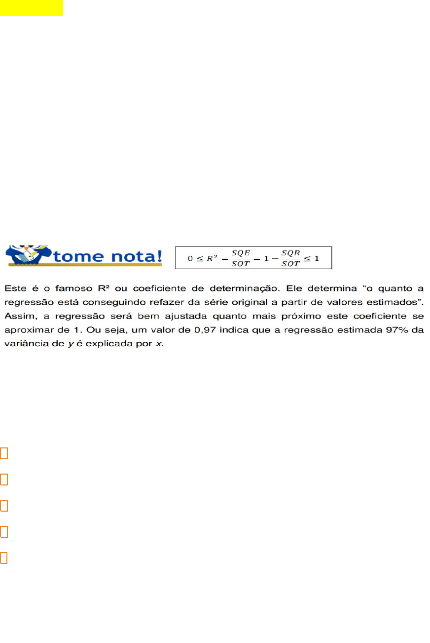 ECONOMETRIA CETREDE 01/05/2019 (IBGE 2002 – Analista Socioeconômico) Numa regressão linear simples, o coeficiente de determinação representa: a) a média da soma dos quadrados dos desvios b) a soma dos quadrados dos resíduos c) a raiz quadrada do coeficiente de correlação amostral d) a variância dos dados e) a porcentagem da variação total dos dados que é explicada pela regressão Gabarito Bom pessoal, basta ler a definição do R² que nós chegaremos facilmente à alternativa (e). Ano: 2018 Banca: INSTITUTO AOCP Órgão: ITEP - RN Prova: INSTITUTO AOCP - 2018 - ITEP - RN - Perito Criminal - Engenharia Civil Ao desenvolver um modelo de regressão linear para a avaliação de imóveis, um dos parâmetros populacionais a ser considerado é se o imóvel se encontra em um logradouro tipo “rua” ou tipo “avenida”. A variável independente mais adequada para diferenciar o tipo de logradouro em “rua” ou “avenida” é uma variável do tipo Adicotômica. Bqualitativa. Cquantitativa. Dproxy. Econdicional. GABARITO LETRA A 3.76 variável dicotômica: variável que assume apenas duas posições *4) As variáveis dicotômicas também são conhecidas na literatura como variáveis binárias, “dummies”, “de estado”, “zero-um” e outros termos. 3.73 variáveis qualitativas: variáveis que não podem ser medidas ou contadas, mas apenas ordenadas ou hierarquizadas, de acordo com atributos inerentes ao bem 3.74 variáveis quantitativas: variáveis que podem ser medidas ou contadas 3.77 variável “proxy”: variável utilizada para substituir outra de difícil mensuração e que se presume guardar com ela relação de pertinência, obtida por meio de indicadores publicados ou inferidos em outros estudos de mercado 07/05/2019 GABARITO (F) A variável X é do tipo qualitativo nominal (F) A amplitude é igual ou superior a 5. Falso. Pois a amplitude é a diferença entre o valor máximo e o valor mínimo (4-0=0) As variáveis qualitativas podem ser divididas em nominais e ordinais. Ordinais são aquelas que podem ser ordenadas conforme seu resultado, nominais são aquelas cuja operação não é possível. Perceba que quando eu digo “ordenar” eu estou falando em classificar, a depender de seu resultado. Por exemplo, as realizações de uma pesquisa com indivíduos no quesito “nível de escolaridade”, é passível de ser ordenada, pois uma pessoa com ensino superior estudou mais anos do que outra com ensino médio. Assim, a pessoa com nível superior tem “mais escolaridade” do que a de ensino médio. O mesmo não pode se dizer com relação à variável nacionalidade, pois esta não pode ser ordenada. -“E as quantitativas, professor”? Por outro lado, as variáveis quantitativas podem ser dividas em discretas e contínuas. Veja, uma variável contínua é aquela que pode assumir infinitos valores. Por exemplo, a distância entre os seus olhos e o monitor pode ser de 30 cm, mas pode ser 30,01 cm, 30,0001, e por aí vai. Agora, se você for contar a quantidade de garrafas de água por apartamento em seu prédio, você só encontrará números inteiros, como uma, ou duas garrafas, por exemplo. A primeira é um exemplo de variável contínua e a segunda de discreta. Combinação: combina elementos de um mesmo conjunto de forma que a ordem não seja importante e que não haja reposição. Cn,p= Cn,p = Cn,p = Cn,p = Cn,p = 45 OBSERVAÇÃO: A probabilidade condicional determina qual a probabilidade de ocorrer o evento A, dado que já ocorreu B. A maioria das questões de probabilidade condicional é possível resolver sem precisar utilizar formula. 1º) Procura o total daquele evento (no caso, o total de casas que dispõem de sinal de TV aberta), depois procura o evento especifico (ou seja, o domicilio ser de zona rural e ter sinal de tv aberta). Por último, basta dividi evento provável/ total de eventos possíveis. OBSERVAÇÃO: Probabilidade condicional busca determinar qual a probabilidade de ocorrer o evento A, dado que já ocorreu B. OU -> Soma. E -> multiplica. OBSERVAÇÃO: As distribuições são simétricas quando é possível dividi os dados em duas partes exatamente igual (conforme exposto no gráfico). OBSERVAÇÃO: ESSA FORMULA REFERE-SE A VARIÂNCIA POPULACIONAL. OBSERVAÇÃO: 1º) A variância de uma maneira geral pode ser expressa por média da soma dos quadrados dos itens – quadrado da média. Já o desvio padrão é igual a raiz quadrada da variância. O desvio padrão é muito afetado pelo valor absoluto dos dados analisados, o que dificulta a comparação de duas series com valores muito diferentes. Assim, costuma-se utilizar o conceito de coeficiente de variação (CV). O coeficiente de variação é igual ao desvio padrão/ média. 2º) O intervalo interquartílico= terceiro quartil(75%) – primeiro quartil(25% dos valores) 3º) O diagrama box-plot corresponde a um gráfico que os estatísticos usam para mostra uma conjunto de dados. Quando os valores ultrapassam o limite superior significa que os valores são atípicos (saem do padrão dos demais dados). OBSERVAÇÃO: CURSTOSE MEDE O ACHATAMENTO DA CURVA 10/05/2019 QUANTO MAIOR O PICO MAIR SERÁ A CURTOSE OBSERVAÇÃO: À MEDIDA QUE VOU CALCULANDO AS MÉDIAS AMOSTRAIS, AS MÉDIAS IRÃO TENDER AO VALOR EXATO DA MÉDIA POPULACIONAL. OU SEJA, O VALOR ESPERADO DA MÉDIA AMOSTRA QUANDO ELA É CALCULADA VÁRIAS VEZES É A MÉDIA POPULACIONAL. - Quando a hipótese nula é verdadeira, então, deve-se aceitar a hipótese nula. O erro do tipo I ocorre quando a hipótese nula é verdadeira e mesmo assim rejeita-se a hipótese nula. Ele é representado por alfa e corresponde ao nível de significância. - Quando a hipótese nula é falsa deve-se rejeitar a hipótese nula. O erro do tipo II ocorre quando a hipótese nula é falsa e mesmo assim aceita-se a hipótese nula. Ele é representado por beta. O poder do teste é o complemento de beta, ou seja, corresponde ao erro do tipo II. O item está err