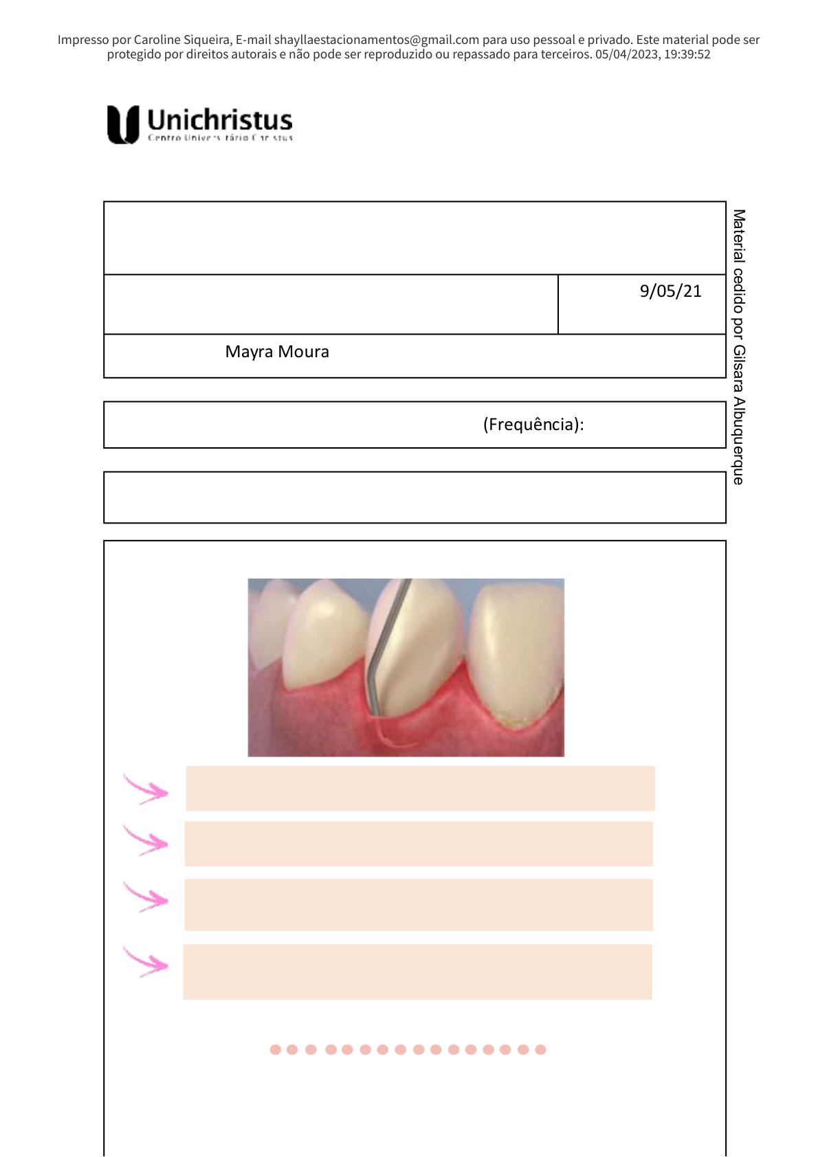 Impresso por Caroline Siqueira, E-mail shayllaestacionamentos@gmail.com para uso pessoal e privado. Este material pode ser protegido por direitos autorais e não pode ser reproduzido ou repassado para terceiros. 05/04/2023, 19:39:52 CURSO DE ODONTOLOGIA ATIVIDADE REALIZADA: Raspagem subgengival e alisamento radicular I ao VI sextante. Data: 19 05 21/ / Professor(a): Mayra Moura Visto do professor(a): (Frequência): REGRISTRO DE PRÁTICA CLÍNICA Raspagem Subgengival e Alisamento Radicular: Objetivos da Raspagem: • Remoção da microbiota patogênica da bolsa; • Resolução da inflamação gengival; • Interrupção da destruição progressiva do aparelho de inserção; • Tornar a superfície radicular compatível com a nova inserção. PORTFÓLIO CLÍNICA M aterial cedido por G ilsara A lbuquerque Tratamento Fase II: 1. Periograma; 2. Raspagem subgengival; 3. Reavaliação após 45 dias. Raspagem: Processo pelo qual a placa e o cálculo são removidos da superfície dentária supra e subgengival. Alisamento Radicular: Processo pelo qual o cálculo incrustado e as porções do cemento são removidos das raízes para produzir uma superfície lisa, dura e limpa. Tratamento não cirúrgico da periodontite. Victoria Trindade Victoria Trindade Victoria Trindade Victoria Trindade Victoria Trindade Victoria Trindade Edgar Tanji, Sandra Tomaz e Silvia Friggi Victoria Trindade Victoria Trindade 06/04/2023 Victoria Trindade Estágio em Clinica Integral do Adulto III Impresso por Caroline Siqueira, E-mail shayllaestacionamentos@gmail.com para uso pessoal e privado. Este material pode ser protegido por direitos autorais e não pode ser reproduzido ou repassado para terceiros. 05/04/2023, 19:39:52 Instrumentais Utilizados: 1. Dentes Anteriores: • Foice Morse 0- ;00 • Cureta Mini Five 5-6. 2. Dentes Posteriores: • Foice Mccall 11-12; • Cureta Mini Five 7-8; • Cureta Mini Five ;11 12- • Cureta Mini Five .13-14 3. Detecção de Depósitos de Cálculo: • Sonda Carolina do Norte. Sextantes a Trabalhar: Posicionamento do Paciente: 1. Arcada Superior: 2. Arcada Inferior: Elevar o encosto da cadeira; Paciente deve elevar o queixo. Paciente deve abaixar o queixo; Mandíbula paralela ao solo. Posição de Trabalho: • Sextantes Anteriores: Alternar entre 8 e 9 horas. Dentes Ântero-Superiores: 8/9 horas e 12 horas. Dentes Ântero-Inferiores: 8/9 horas e 12 horas. • Sextantes Posteriores: Alternar entre 9 e 11 horas. Dentes Superiores: 9 e 11 horas. Dentes Posteriores: 9 e 11 horas. M aterial cedido por G ilsara A lbuquerque PORTFÓLIO CLÍNICA Ponta Mccall 11-12 Carolina do Norte n° 15 Victoria Trindade Victoria Trindade Victoria Trindade Victoria Trindade Impresso por Caroline Siqueira, E-mail shayllaestacionamentos@gmail.com para uso pessoal e privado. Este material pode ser protegido por direitos autorais e não pode ser reproduzido ou repassado para terceiros. 05/04/2023, 19:39:52 Empunhadura do Instrumental: • Com empunhadura de caneta modificada a cureta deve ser posicionada na base do cálculo de forma que a sua remoção se torne mais eficiente; • A superfície não cortante da cureta fica sempre voltada para o tecido gengival. • Estabilizar a mão e o instrumental durante os movimentos; • Apoio digital intraoral convencional: Durante a raspagem, apoia-se os dedos anelar e mindinho nos dentes adjacentes para estabilizar melhor o instrumental; • Intra-oral arco oposto: Apoio digital na outra arcada; • Apoio digital extra-oral palma para cima: Dorso dos dedos se apoiam na face lateral direita da mandíbula; • Extra-oral palma para baixo: Superfícies frontais dos dedos se apoiam na face lateral esquerda da mandíbula. Passo a Passo: 1. Realizar movimento exploratório com a sonda periodontal Carolina do Norte, na qual deve ser introduzida até o fundo da bolsa periodontal, e com movimentos leves, é investigado a presença de cálculo; M aterial cedido por G ilsara A lbuquerque PORTFÓLIO CLÍNICA Victoria Trindade Victoria Trindade Victoria Trindade Impresso por Caroline Siqueira, E-mail shayllaestacionamentos@gmail.com para uso pessoal e privado. Este material pode ser protegido por direitos autorais e não pode ser reproduzido ou repassado para terceiros. 05/04/2023, 19:39:52 2. Escolher a cureta de acordo com o sextante a ser raspado; 3. Estabilizar a cureta com empunhadura de caneta modificada, com apoio digital que melhor se adeque a área a ser raspada; 4. Introduzir a cureta com ângulo de 0° até o fundo da bolsa; 5. Modificar a angulação de trabalho de 45°, com pressão lateral, realizando movimentos curtos, intensos, controlados e sobrepostos; 6. No decorrer da remoção do cálculo são realizados movimentos exploratórios com a sonda periodontal para verificar se todos os depósitos de cálculo foram removidos; 7. Após remover todo o cálculo subgengival é realizado o alisamento radicular. Com a cureta indicada deve ser realizado movimentos leves e longos, desde o fundo da bolsa até a cervical do dente. Ao final a superfície radicular deve estar lisa e dura. Aluno (a): Lara de Aquino Santos M aterial cedido por G ilsara A lbuquerque PORTFÓLIO CLÍNICA Victoria Trindade Victoria Trindade Victoria Trindade Victoria Trindade Victoria Trindade Caroline Siqueira Cabral - RA 6017217