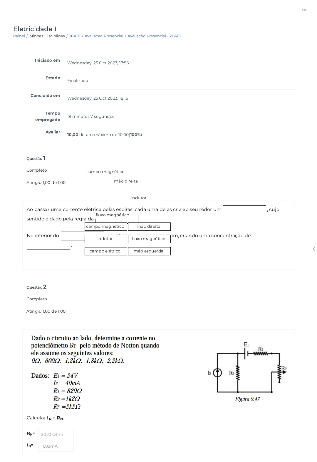 25/10/2023, 18:06 Avaliação Presencial - 20A111 https://ava.politecnicabr.com.br/mod/quiz/review.php?attempt=5812425 1/5 Painel / Minhas Disciplinas / 20A111 / Avaliação Presencial / Avaliação Presencial - 20A111 Eletricidade I Iniciado em Wednesday, 25 Oct 2023, 17:56 Estado Finalizada Concluída em Wednesday, 25 Oct 2023, 18:15 Tempo empregado 19 minutos 7 segundos Avaliar 10,00 de um máximo de 10,00(100%) Questão 1 Completo Atingiu 1,00 de 1,00 Ao passar uma corrente elétrica pelas espiras, cada uma delas cria ao seu redor um , cujo sentido é dado pela regra da . No interior do , as linhas de campo se somam, criando uma concentração de . Questão 2 Completo Atingiu 1,00 de 1,00 Calcular I e R : R = I = N N N 2020 Ohm N 11,88mA campo magnético campo magnético campo magnético campo magnético mão direita mão direita mão direita mão direita indutor indutor indutor indutor �uxo magnético �uxo magnético �uxo magnético �uxo magnético campo elétrico campo elétrico campo elétrico campo elétrico mão esquerda mão esquerda mão esquerda mão esquerda https://ava.politecnicabr.com.br/my/ https://ava.politecnicabr.com.br/my/ https://ava.politecnicabr.com.br/course/view.php?id=946 https://ava.politecnicabr.com.br/course/view.php?id=946#section-15 https://ava.politecnicabr.com.br/mod/quiz/view.php?id=28902 https://ava.politecnicabr.com.br/ 25/10/2023, 18:06 Avaliação Presencial - 20A111 https://ava.politecnicabr.com.br/mod/quiz/review.php?attempt=5812425 2/5 Questão 3 Completo Atingiu 1,00 de 1,00 Qual a unidade de medida de energia elétrica? Resposta: kWh Questão 4 Completo Atingiu 1,00 de 1,00 a capacitância de um capacitor de placas paralelas depende dá área das placas, da distância entre elas e do material dielétrico que as separa. Escolha uma opção: Questão 5 Completo Atingiu 1,00 de 1,00 calcule o valor da capacitância equivalente do circuito série abaixo. Resposta: 5,42 Verdadeiro Falso https://ava.politecnicabr.com.br/ 25/10/2023, 18:06 Avaliação Presencial - 20A111 https://ava.politecnicabr.com.br/mod/quiz/review.php?attempt=5812425 3/5 Questão 6 Completo Atingiu 1,00 de 1,00 Considerando os indutores L =10mH, L =12mH e L =5,3mH e que eles estejam ligados em série. Qual o valor da resistência equivalente L . Resposta: 27,3 Questão 7 Completo Atingiu 1,00 de 1,00 A permissividade absoluta de um dielétrico no vácuo é de: Escolha uma opção: Questão 8 Completo Atingiu 1,00 de 1,00 Um capacitor de 100nF está carregado com 50μC. A tensão entre os seus terminais é de 500V Escolha uma opção: 1 2 3 eq mH ϵ = 8, 9x H/m10−12 Verdadeiro Falso Verdadeiro Falso https://ava.politecnicabr.com.br/ 25/10/2023, 18:06 Avaliação Presencial - 20A111 https://ava.politecnicabr.com.br/mod/quiz/review.php?attempt=5812425 4/5 Questão 9 Completo Atingiu 1,00 de 1,00 (UFPA) No circuito abaixo, I = 2A, R = 2Ω, E = 10V, r = 0,5Ω, E = 3,0V e r = 1,0Ω. Sabendo que o potencial no ponto A é de 4V, podemos a�rmar que os potenciais, em volts, nos pontos B, C e D são, respectivamente: Escolha uma opção: Questão 10 Completo Atingiu 1,00 de 1,00 Uma rádio AM/ FM portátil funciona, em condições normais de operação, com as seguintes especi�cações: 3V/ 450mW. Qual deve ser o valor do resistor R para que esse rádio opere a partir de uma fonte 12V, conforme a montagem ao lado? Observação: O divisor de tensão é formado por R e R //R Resposta: 75 1 1 2 2 0, 9 e 4 8, 1 e 2 4, 0 e 4 2, 6 e 4 9, 5 e 2 2 1 2 rádio Ohm https://ava.politecnicabr.com.br/ 25/10/2023, 18:06 Avaliação Presencial - 20A111 https://ava.politecnicabr.com.br/mod/quiz/review.php?attempt=5812425 5/5 © 2022 - Escola Politécnica Brasileira Entre em Contato https://www.politecnicabr.com.br 0800 084 2627 0800 084 2627 Links Úteis Dicas da nossa Diretora Acadêmica Planner de Estudos Declaração de Matrícula Orientações do AVA Abertura de Ticket Fale com o Tutor Cronograma de Estudos Manual de Estágio Manual de Competência Siga-nos nas redes sociais https://ava.politecnicabr.com.br/mod/quiz/0 https://ava.politecnicabr.com.br/mod/quiz/0 https://www.politecnicabr.com.br/ https://soundcloud.com/user-501638417/sets/escola-politecnica-brasileira https://soundcloud.com/user-501638417/sets/escola-politecnica-brasileira https://storage.googleapis.com/sirius-pubstore/semestre_plannerdeestudo%20poli.pdf https://storage.googleapis.com/sirius-pubstore/semestre_plannerdeestudo%20poli.pdf https://storage.googleapis.com/sirius-pubstore/declaracao_matricula.pdf https://storage.googleapis.com/sirius-pubstore/declaracao_matricula.pdf https://storage.googleapis.com/sirius-pubstore/orientacoes_ava.pdf https://storage.googleapis.com/sirius-pubstore/orientacoes_ava.pdf https://storage.googleapis.com/sirius-pubstore/abertura_ticket.pdf https://storage.googleapis.com/sirius-pubstore/abertura_ticket.pdf https://storage.googleapis.com/sirius-pubstore/fale_com_tutor.pdf https://storage.googleapis.com/sirius-pubstore/fale_com_tutor.pdf https://storage.googleapis.com/sirius-pubstore/cronograma_estudos.pdf https://storage.googleapis.com/sirius-pubstore/cronograma_estudos.pdf https://storage.googleapis.com/sirius-pubstore/manual_estagio.pdf https://storage.googleapis.com/sirius-pubstore/manual_estagio.pdf https://storage.googleapis.com/sirius-pubstore/manual_competencia.pdf https://storage.googleapis.com/sirius-pubstore/manual_competencia.pdf https://www.facebook.com/politecnicabr https://www.instagram.com/politecnicabr_oficial https://ava.politecnicabr.com.br/