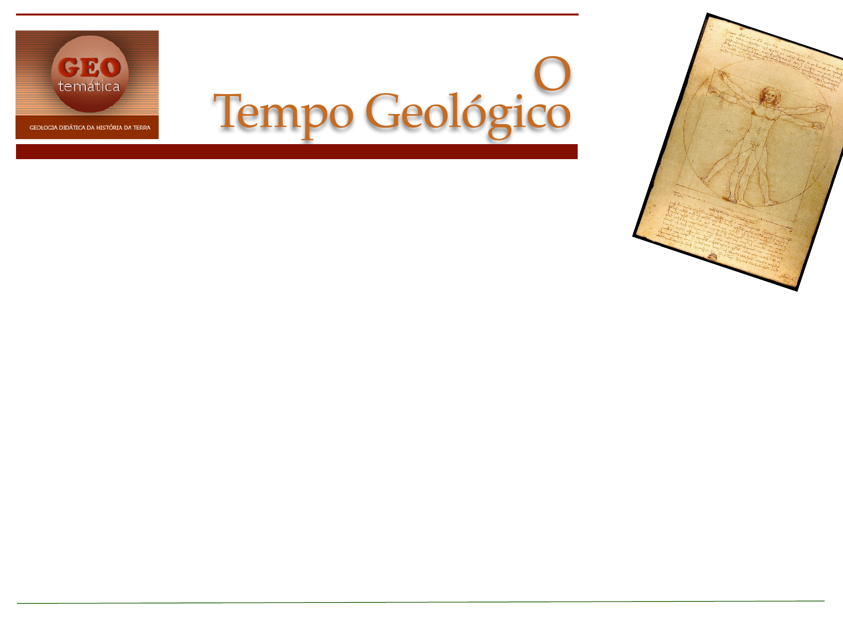 . . . . . . . . . . S E Ç Ã O D E T E X T O S G E O T E M Á T I C O S E M P D F O Tempo Geológico 1 O Tempo Geológico O ser humano é um animal consci- ente da sua própria existência. Percebemos que habitamos um corpo, e que este habita um ambiente externo a ele. A nossa relação com esse mundo exterior é, basicamente, uma relação de espaço e tempo. E ela interfere na percepção que temos da vida, pelas sensações que nos provoca de alegria ou dor, bem estar ou angústia, grande ou pequeno, longe ou perto, e por aí vai. Com a invenção da matemática criamos um código que nos permitiu expressar essa relação com mais acuidade. Grande deixou de ser um conceito subjetivo e passou a ser desi- gnado por tantos braços, tantos pés, tantos metros. Longe se transformou em tantas léguas, tantos quilômetros. Dividimos também o tempo e os dias ganharam horas e as horas minutos, e criamos o calendário para medidas mais distantes no passado ou futuro. Mas sempre tivemos como referencial dessas medidas, a escala humana. Por isso se diz que "O homem é a medida de todas as coisas." E nada melhor que o bem conhecido desenho de Leonardo da Vinci para ilustrar este conceito. Quando nos referimos aos eventos ocorridos há 2.000 anos, e que constituiram o marco zero do calen- dário atualmente usado pela cultura ocidental, podemos imaginar que es- tamos falando de um intervalo de tempo pelo qual já passaram cerca de 40 gerações. Só isso? Sim, só isso: 40 gerações. Desse ponto de vista 2.000 anos não nos parece muito. Espaço e tempo são conceitos relativos. A distância entre a Terra e a Lua é de 384.400 km, ou dizendo de outra forma, caberiam 30 Terras alinhadas entre suas órbitas. Tem gente que já viajou mais do que isso. Desse prisma, a Lua não fica tão longe assim. Quando encaixamos esses valores dentro da nossa escala de medida e percepção sensorial, conseguimos fa- zer uma avaliação razoável dessas grandezas. Mas quando esses valores extrapolam os limites da experiência humana, o homem não é mais a medida de todas as coisas. Dois exemplos notáveis: a Escala Cósmica e o Tempo Geológico. Por Escala Cósmica entendemos as distâncias das quais se ocupam os astrônomos. A estrela mais próxima, Alfa-Centauro, está a 4 anos-luz, e a galáxia de Andrômeda dista de nós 2 milhões e 400 mil anos-luz. Podemos imaginar o significado desses núme- ros? Por Tempo Geológico definimos as eras que se passaram bem antes do advento da humanidade, e aí mer- gulhamos num poço profundo de tempo que se conta por milhões e milhões de anos, até a formação do sistema solar e dos planetas há 4 bilhões e 600 milhões de anos atrás. É tempo além da imaginação! Mais do que suficiente para que a evolução da vida e as mutações genéticas dela decorrentes, produzissem todas as formas de organismos vivos, para chegar até mim, que escrevi este texto, e até você que o está lendo neste momento. Vamos ver então, como os geólogos conceberam essa escala de tempo, para marcar os eventos da História da Terra, onde se perdem nossas origens mais remotas. Geólogo Paulo César Manzig O homem é a medida de todas as coisas O Tempo Geológico 2 O tempo na escala humana O diagrama desta página resume os conceitos de História e Pré-História, referindo-se aos eventos que antece- deram ao aparecimento da escrita (há cerca de 6.000 anos), como eventos da Pré-História, e aqueles que vieram após os registros escritos como sendo a História. É uma questão polêmica conceituar a caminhada do Homem desta maneira, pois reflete uma visão fortemente influenciada pelo padrões europeus de civilização, que exclui o conteúdo humanístico de outros povos e suas culturas com valores diferentes daqueles do padrão cristão-ocidental. Entretanto, polêmicas conceituais `a parte, este modelo pode nos servir como um ponto de partida para a introdução ao conceito de tempo geológico, uma idéia que transcende nossa percepção da História. A faixa em degradée laranja mostra esse percurso de 4 milhões de anos, desde o Australopithecus até nós, o Homo sapiens. Observe que na extre- midade direita da faixa desenha-se uma estreita linha vermelha. Essa linha, que quase foje aos olhos, condensa os últimos 6 mil anos da Humanidade, contados a partir do advento da escrita, na antiga Meso- potâmia. O que chama atenção neste esquema é a imensa quantidade de tempo que a evolução biológica dispôs para chegar até nossa espécie há cerca de 100 mil anos atrás. No total, foram necessários 4 milhões de anos para que pudéssemos descer das árvores, caminhar em pé, e colher as primeiras sementes. A seta mais abaixo, aponta para muito mais atrás, para o Tempo Geológico, que veremos na próxima página. Para terem uma referência de tempo, culturas diversas utilizaram variadas formas de calendário. O mundo oci- dental adotou o Calendário Gregori- ano, e considera o nascimento de Cristo como seu marco inicial. Assim, nos referimos aos acontecimentos como ocorridos antes ou depois de Cristo. E o tempo passado pode ser contado em anos, séculos ou milênios, conforme a nossa conveniência. O Tempo Geológico 3 Um estranho relógio Para desenhar o Tempo Geológico, os geólogos optaram por uma representação diferente, onde as partes não são iguais como nos calendários, mas estão referidas principalmente a eventos bem caracterizados da História da Terra. Essas partes foram chamadas de Eras, e estas foram divididas em Períodos. Existem outras divisões e sub- divisões mais complexas, mas de maior uso no meio científico para estudos de estratigrafia. Para nós entretanto, o entendimento das Eras e Períodos é mais do que suficiente Se fóssemos condensar a História da Terra no período de um único dia, desde o seu início até hoje, começando `as 24:00 hs e terminando `as 24:00 hs do dia seguinte, teríamos uma visualização fascinante de como é recente a nossa 