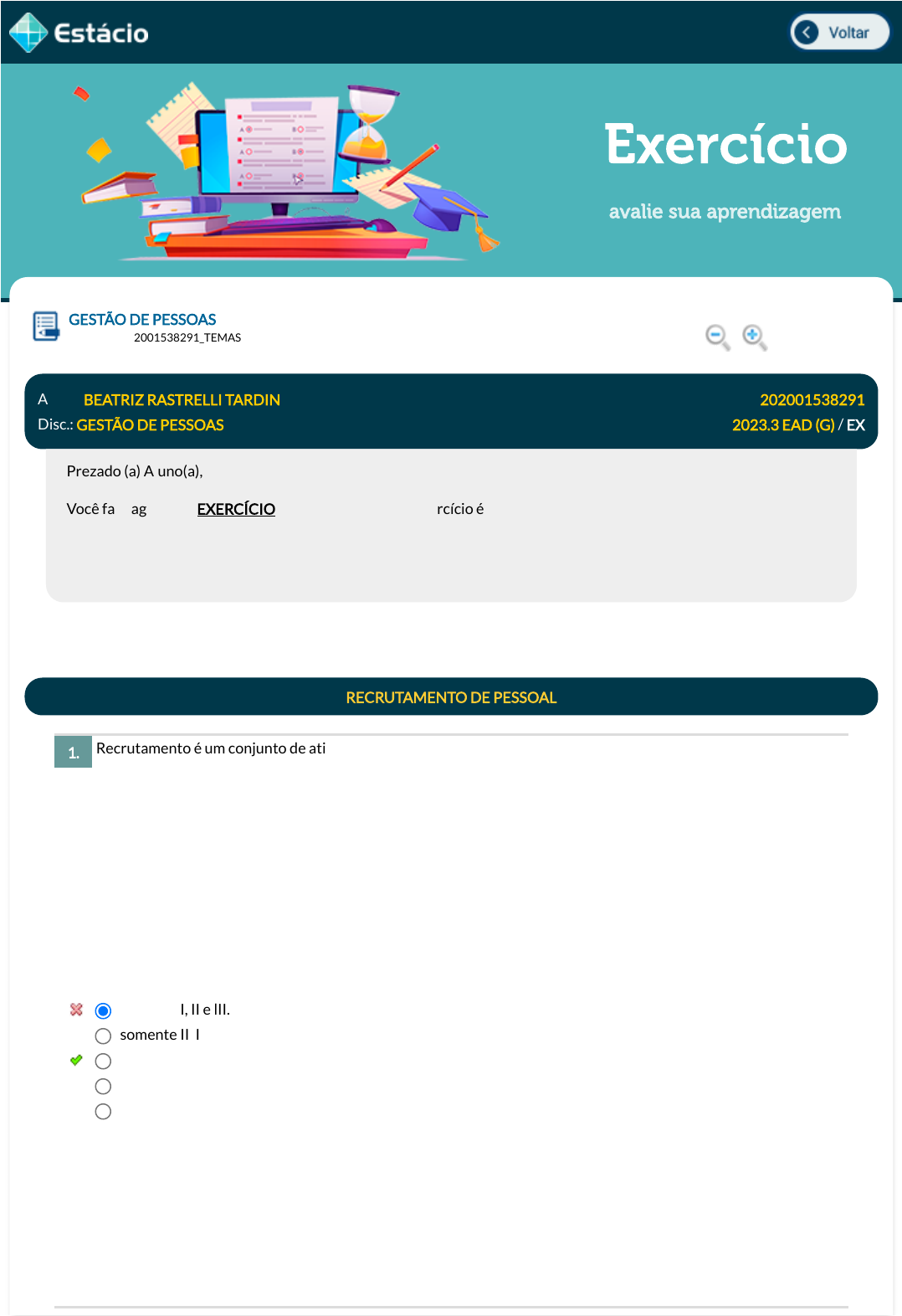 12/10/23, 20:42 Estácio: Alunos https://simulado.estacio.br/alunos/ 1/5 Exercício avalie sua aprendizagem Recrutamento é um conjunto de atividades desenhadas para atrair candidatos quali�cados para uma organização. Entre as vantagens do recrutamento interno estão: I - aproveitar melhor o potencial humano da organização. II - mantém quase inalterado o conservantismo e a rotina atual. III - encoraja o desenvolvimento pro�ssional dos atuais funcionários. IV - não requer socialização organizacional de novos membros. V - probabilidade de melhor seleção porque os funcionários são conhecidos. Dos itens acima mencionados estão corretos: GESTÃO DE PESSOAS Lupa EGT0059_202001538291_TEMAS Aluno: BEATRIZ RASTRELLI TARDIN Matr.: 202001538291 Disc.: GESTÃO DE PESSOAS 2023.3 EAD (G) / EX Prezado (a) Aluno(a), Você fará agora seu EXERCÍCIO! Lembre-se que este exercício é opcional, mas não valerá ponto para sua avaliação. O mesmo será composto de questões de múltipla escolha. Após responde cada questão, você terá acesso ao gabarito comentado e/ou à explicação da mesma. Aproveite para se familiarizar com este modelo de questões que será usado na sua AV e AVS. RECRUTAMENTO DE PESSOAL 1. somente I, II e lII. somente II, IIl e IV. somente I, III, IV e V. I, II, III, IV e V. somente I, II e IV. Data Resp.: 12/10/2023 20:28:58 Explicação: A resposta correta é: somente I, III, IV e V. javascript:voltar(); javascript:voltar(); javascript:voltar(); javascript:voltar(); javascript:diminui(); javascript:diminui(); javascript:aumenta(); javascript:aumenta(); 12/10/23, 20:42 Estácio: Alunos https://simulado.estacio.br/alunos/ 2/5 Assinale a alternativa que não se refere aos elementos que um anúncio claro e objetivo deve ter: O recrutador precisa �car atento para não ter atitudes inadequadas durante uma entrevista. Que tipo de atitude o recrutador pode tomar com o candidato sem correr o risco de ser inapropriado? O conceito de composto salarial envolve fatores que ajudam na determinação dos salários praticados pela empresa. Sobre esse assunto, escolha a opção correta. 2. Informações como o grau de escolaridade mínimo, experiências anteriores, exigências formais, como possuir habilitação entre outros. O cargo ou função a ser preenchido. Localização da empresa e detalhes sobre o ambiente de trabalho. A missão, a visão e os valores da empresa. Uma breve relação das principais atribuições que esse candidato terá que exercer dentro da empresa. Data Resp.: 12/10/2023 20:30:44 Explicação: A resposta correta é: A missão, a visão e os valores da empresa. SELEÇÃO DE PESSOAL 3. Apressar o candidato para terminar a entrevista no prazo. Todas as alternativas estão incorretas. Fazer comentários negativos sobre a empresa. Fazer perguntas de cunho pessoal. De�nir como conduzirá a entrevista. Data Resp.: 12/10/2023 20:31:24 Explicação: A resposta correta é: De�nir como conduzirá a entrevista. 02588MANUTENÇÃO DE PESSOAS 4. São fatores considerados no conceito de composto salarial: relação com sindicatos e negociação coletivas, legislação trabalhista vigente e metodologia salarial usada pelo mercado. São fatores considerados no conceito de composto salarial: tipologia dos cargos da organização, desempenho geral dela em seu mercado e regras de gestão salarial do concorrente. São fatores considerados no conceito de composto salarial: desempenho geral da organização no seu mercado, tamanho dela em termos de funcionários e faturamento e resultado �nanceiro da empresa concorrente. São fatores considerados no conceito de composto salarial: tipologia dos cargos da organização, política salarial empregada pela empresa e capacidade e saúde �nanceira do negócio. São fatores considerados no conceito de composto salarial: relação com sindicatos e negociação coletivas, legislação trabalhista vigente e classi�cação não qualitativa. Data Resp.: 12/10/2023 20:33:02 Explicação: 12/10/23, 20:42 Estácio: Alunos https://simulado.estacio.br/alunos/ 3/5 (Quadrix, 2016) Toda forma de gestão empresarial necessita de um sistema de informação para apoiar suas decisões. A boa informação passa a ser a base da função do controle administrativo. Logo, é correto a�rmar conceitualmente que: (CESPE/CEBRASPE, 2021 - adaptado). O planejamento se caracteriza pela especi�cação do estado futuro almejado, ou seja, a missão, os propósitos, os objetivos setoriais, os desa�os e as metas. Assinale a alternativa que nomeia esse planejamento. A resposta certa é: São fatores considerados no conceito de composto salarial: tipologia dos cargos da organização, política salarial empregada pela empresa e capacidade e saúde �nanceira do negócio. 02801SISTEMAS DE INFORMAÇÕES DE GESTÃO DE PESSOAS 5. um sistema de informações é a coleta, a organização e a distribuição de dados, de tal modo que eles se tornem signi�cativos como informações. um sistema de informações é um conjunto de dados eletrônicos su�cientes para atender apenas as áreas de �nanças de recursos humanos de uma empresa. um sistema de informações é um agrupamento de arquivos, seja na modalidade impressa seja na eletrônica, capaz de suprir dados requeridos pela alta administração. um sistema de informações signi�ca que os arquivos com os dados da empresa estão protegidos e salvos, tanto nas máquinas físicas da empresa como na modalidade denominada ''nuvens''. um sistema de informações é a organização e a distribuição de dados, de tal modo que eles se tornem signi�cativos como dados preciosos. Data Resp.: 12/10/2023 20:34:59 Explicação: Para que um sistema de informações seja completo, ele precisa ter em seu desenho estes processos listados na sua concepção. Cada etapa deve ser bem realizada e procurar se conectar de forma harmônica com as anteriores e com as posteriores formando um ciclo contínuo de ações inter