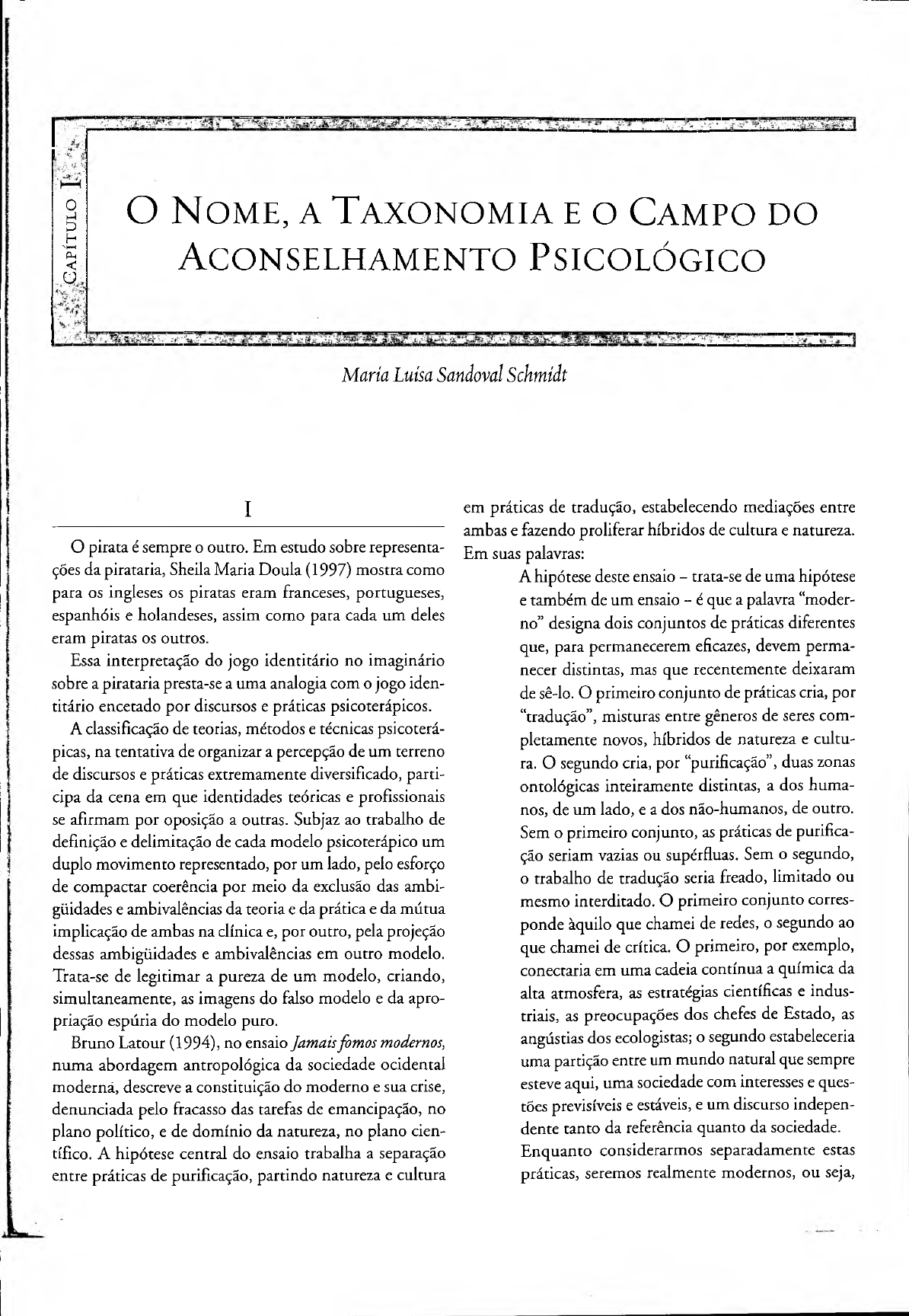 OH'I—I p -i < O 0 O N o m e , a T a x o n o m i a e o C a m p o d o A c o n s e l h a m e n t o P s i c o l ó g i c o María Luísa Sandoval Schmidt I O pirata é sempre o outro. Em estudo sobre representa ções da pirataria, Sheila Maria Doula (1997) mostra como para os ingleses os piratas eram franceses, portugueses, espanhóis e holandeses, assim como para cada um deles eram piratas os outros. Essa interpretação do jogo identitário no imaginário sobre a pirataria presta-se a uma analogia com o jogo iden titário encetado por discursos e práticas psicoterápicos. A classificação de teorias, métodos e técnicas psicoterá- picas, na tentativa de organizar a percepção de um terreno de discursos e práticas extremamente diversificado, parti cipa da cena em que identidades teóricas e profissionais se afirmam por oposição a outras. Subjaz ao trabalho de definição e delimitação de cada modelo psicoterápico um duplo movimento representado, por um lado, pelo esforço de compactar coerência por meio da exclusão das ambi güidades e ambivalências da teoria e da prática e da mútua implicação de ambas na clínica e, por outro, pela projeção dessas ambigüidades e ambivalências em outro modelo. Trata-se de legitimar a pureza de um modelo, criando, simultaneamente, as imagens do falso modelo e da apro priação espúria do modelo puro. Bruno Latour (1994), no ensaio Jamais fomos modernos, numa abordagem antropológica da sociedade ocidental moderná, descreve a constituição do moderno e sua crise, denunciada pelo fracasso das tarefas de emancipação, no plano político, e de domínio da natureza, no plano cien tífico. A hipótese central do ensaio trabalha a separação entre práticas de purificação, partindo natureza e cultura em práticas de tradução, estabelecendo mediações entre ambas e fazendo proliferar híbridos de cultura e natureza. Em suas palavras: A hipótese deste ensaio - trata-se de uma hipótese e também de um ensaio - é que a palavra “moder no” designa dois conjuntos de práticas diferentes que, para permanecerem eficazes, devem perma necer distintas, mas que recentemente deixaram de sê-lo. O primeiro conjunto de práticas cria, por “tradução”, misturas entre gêneros de seres com pletamente novos, híbridos de natureza e cultu ra. O segundo cria, por “purificação”, duas zonas ontológicas inteiramente distintas, a dos huma nos, de um lado, e a dos não-humanos, de outro. Sem o primeiro conjunto, as práticas de purifica ção seriam vazias ou supérfluas. Sem o segundo, o trabalho de tradução seria freado, limitado ou mesmo interditado. O primeiro conjunto corres ponde àquilo que chamei de redes, o segundo ao que chamei de crítica. O primeiro, por exemplo, conectaria em uma cadeia contínua a química da alta atmosfera, as estratégias científicas e indus triais, as preocupações dos chefes de Estado, as angústias dos ecologistas; o segundo estabeleceria uma partição entre um mundo natural que sempre esteve aqui, uma sociedade com interesses e ques tões previsíveis e estáveis, e um discurso indepen dente tanto da referência quanto da sociedade. Enquanto considerarmos separadamente estas práticas, seremos realmente modernos, ou seja, 2 0 Nome, a Taxonomia e o Campo do Aconselhamento Psicológico estaremos aderindo sinceramente ao projeto da purificação crítica, ainda que este se desenvolva somente através da proliferação dos híbridos (LA- TOUR, 1994, p. 16). Uma segunda hipótese é a de que a exclusão dos híbridos e a impossibilidade de pensá-los tornam sua proliferação possível. O dispositivo de purificação recobre o saber moderno disciplinar, bloqueando a compreensão dos híbridos e, pode-se dizer, a construção de saberes híbridos. Como escreve Latour: Nossa vida intelectual é decididamente mal cons truída. A epistemologia, as ciências sociais, as ciên cias do texto, todas têm uma reputação, contanto que permaneçam distintas. Caso os seres que você esteja seguindo atravessem as três, ninguém mais compreende o que você diz. Ofereça às disciplinas estabelecidas uma bela rede sociotécnica, algumas belas traduções, e as primeiras extrairão os concei tos, arrancando deles todas as raízes que poderiam ligá-los ao social ou à retórica; as segundas irão amputar a dimensão social e política, purificando- a de qualquer objeto; as terceiras, enfim, conser varão o discurso, mas irão purgá-lo de qualquer aderência indevida à realidade - horresco referens - e aos jogos de poder. O buraco de ozônio sobre nossas cabeças, a lei moral em nosso coração e o texto autônomo podem, em separado, interessar a nossos críticos. Mas, se uma naveta fina houver interligado o céu, a indústria, os textos, as almas e a lei moral, isso permanecerá inaudito, indevido, inusitado (LATOUR, 1994, p. 11). O intento de Latour, por meio da pesquisa, é “reatar o nó górdio atravessando, tantas vezes quantas forem neces sárias, o corte que separa os conhecimentos exatos e o exer cício do poder”, descrevendo tramas, apoiado na noção de tradução ou rede (Ibid., p. 9). Trata-se da proposição de investigações que dizem respeito à natureza ou ao conhe cimento em seu envolvimento com coletivos e sujeitos. A menção ao ensaio de Latour tem, nesse contexto, o sentido de explicitar uma apropriação “caseira” de suas idéias que ajuda a focalizar o campo do Aconselhamento Psicológico pelo viés do problema da taxonomia das teorias e práticas psicoterápicas. Pois é possível, talvez, apreender os esforços de distinção e classificação dessas teorias e práticas como fazendo parte do engenho purificador que se instala, também, no interior de cada disciplina. Na contrapartida, suas idéias convidam à tentativa de leitura da dimensão híbrida de discursos e práticas instituídos sob o nome Aconselhamento Psicológico. Um propósito avizinha-se: o de interpretar ou apreen