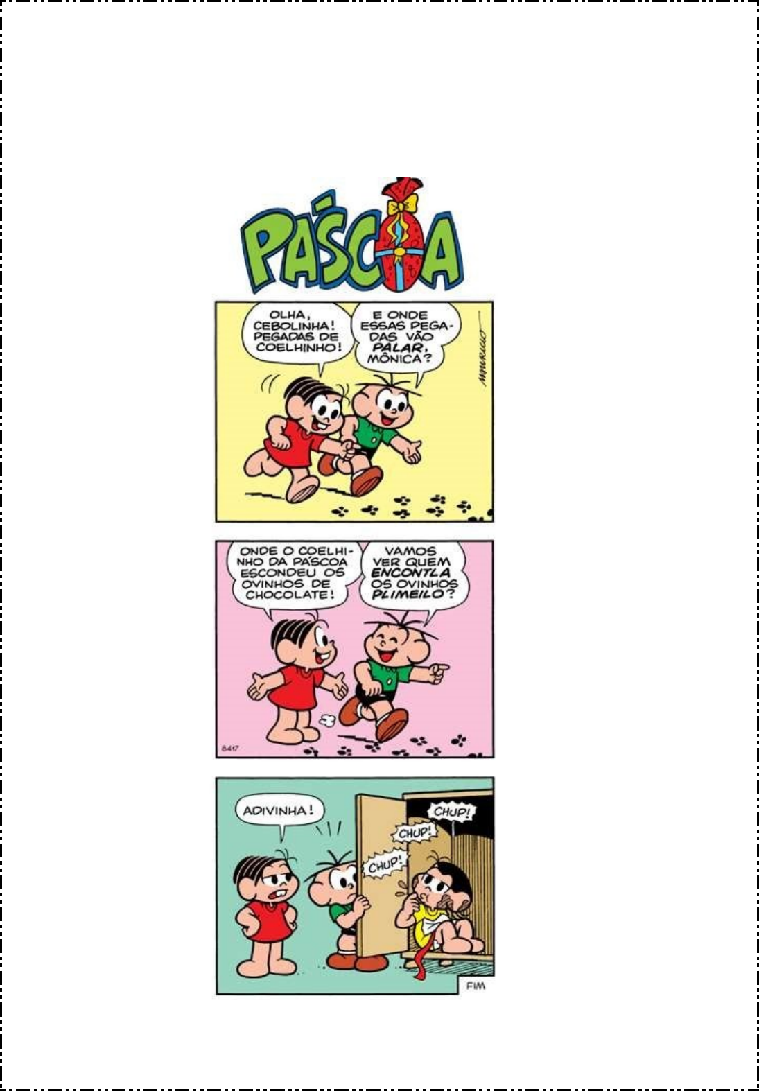 ESCOLA ________________________________________DATA:_____/_____/_____ PROF:______________________________________________TURMA:___________ NOME:_______________________________________________________________ LEIA O TEXTO ABAIXO: http://turmadamonica.uol.com.br/quadrinhos / 1.QUAL É O TÍTULO DA HISTÓRIA? ____________________________________________________________________ 2.COMO PODEMOS CHAMAR ESSE TIPO DE HISTÓRIA CRIADA EM QUADRINHOS? ____________________________________________________________________ 3.QUEM SÃO OS PERSONAGENS? ____________________________________________________________________ 4.O QUE A MÔNICA ESTÁ PROCURANDO? ____________________________________________________________________ 5.QUEM ESTÁ AJUDANDO A MÔNICA EM SUA BUSCA? ____________________________________________________________________ 6.QUEM ERA O COELHINHO? ____________________________________________________________________ 7.ONDE A MAGALI ESTAVA ESCONDIDA? ____________________________________________________________________ 8.QUANTOS QUADRINHOS ESSA HISTÓRIA POSSUI? ____________________________________________________________________ 9.O SOM PRODUZIDO POR MAGALI CHAMA-SE ONOMATOPEIA ( PROCESSO DE FORMAÇÃO DE PALAVRAS OU FONEMAS QUE TEM O OBJETIVO DE IMITAR O BARULHO DE UM SOM). QUAL SOM A ONOMATOPEIA “CHUP, CHUP, CHUP” REPRODUZ? ____________________________________________________________________ 10.NO QUADRINHO DOIS, O CEBOLINHA PRONUNCIOU DUAS PALAVRAS COM AS LETRAS TROCADAS. FAÇA A CORREÇÃO DELAS. ____________________________________________________________________ 11.OBSERVE AS IMAGENS ABAIXO E CRIE UMA HISTÓRIA ENGRAÇADA. http://turmadamonica.uol.com.br/tirinhas/ RESPOSTAS: 1.Páscoa 2.História em quadrinhos. 3.A Mônica, o Cebolinha e a Magali. 4.O coelhinho da páscoa. 5.O Cebolinha. 6.A Magali. 7.Dentro de um armário. 8.Três quadrinhos. 9.Ela pode estar chupando os dedos ou o chocolate. 10.As palavras são encontrar e primeiro. 11.Resposta Pessoal, professor confira a história original abaixo: www.acessaber.com.br www.acessaber.com.br