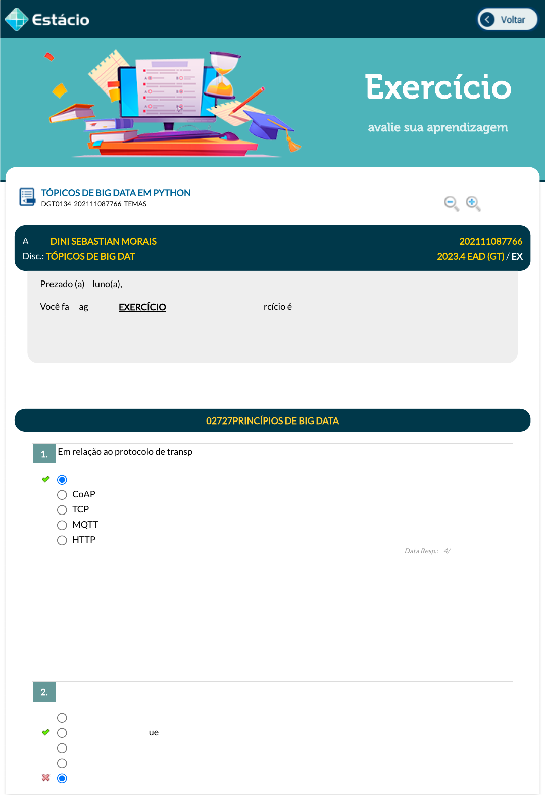 24/10/2023, 15:55 Estácio: Alunos https://simulado.estacio.br/alunos/ 1/5 Exercício avalie sua aprendizagem Em relação ao protocolo de transporte para transmissão de aplicações de streaming, selecione a opção correta. Em relação às plataformas para Internet das Coisas, selecione a opção correta sobre o Arduino. TÓPICOS DE BIG DATA EM PYTHON Lupa DGT0134_202111087766_TEMAS Aluno: DINI SEBASTIAN MORAIS Matr.: 202111087766 Disc.: TÓPICOS DE BIG DAT 2023.4 EAD (GT) / EX Prezado (a) Aluno(a), Você fará agora seu EXERCÍCIO! Lembre-se que este exercício é opcional, mas não valerá ponto para sua avaliação. O mesmo será composto de questões de múltipla escolha. Após responde cada questão, você terá acesso ao gabarito comentado e/ou à explicação da mesma. Aproveite para se familiarizar com este modelo de questões que será usado na sua AV e AVS. 02727PRINCÍPIOS DE BIG DATA 1. UDP CoAP TCP MQTT HTTP Data Resp.: 24/10/2023 15:49:11 Explicação: O protocolo UDP - protocolo de datagrama do usuário - é utilizado para aplicações de streaming por ser mais rápido. O protocolo TCP é orientado à con�abilidade e, no caso de aplicações de streaming, ele é muito lento inviabilizando a aplicação. Os protocolos HTTP, MQTT e CoAP não se enquadram no transporte de dados. 2. É um programa É um ecossistema que envolve software e hardware É um protocolo de internet das coisas É o outro nome para Raspberry PI É uma placa de hardware Data Resp.: 24/10/2023 15:49:39 javascript:voltar(); javascript:voltar(); javascript:voltar(); javascript:voltar(); javascript:diminui(); javascript:diminui(); javascript:aumenta(); javascript:aumenta(); 24/10/2023, 15:55 Estácio: Alunos https://simulado.estacio.br/alunos/ 2/5 A linguagem Python se destaca como intuitiva e de fácil aprendizagem. Analise o código abaixo que apresenta laços condicionais e instruções de repetição. for i in range(10): if (i%2==0): print(i) Qual a saída esperada após a execução do programa? A visualização dos dados é fundamental no processo de análise e interpretação. Qual o tipo de visualização de dados mais indicada para dados temporais? Explicação: O arduino é uma tecnologia que combina hardware e software e é utilizada para internet das coisas. Portanto, não é um programa, nem uma placa de hardware e tão pouco um protocolo de comunicação. Já o Raspberry PI não é o mesmo que Arduino, pois se trata de uma outra tecnologia para internet das coisas. 02260ANÁLISE DE DADOS EM PYTHON COM PANDAS 3. Serão impressos no console os números pares entre 0 e 9. Serão impressos no console os números pares entre 1 e 10. Serão impressos no console os números ímpares entre 0 e 10. Serão impressos no console os números racionais entre 0 e 9. Serão impressos no console os números ímpares entre 0 e 9. Data Resp.: 24/10/2023 15:51:11 Explicação: O constructo de laço que itera sobre uma sequência dos números reais de 0 a 9, e cujo condicional dentro do laço escolhe apenas os números cujo resto de sua divisão por 2 seja 0, condição lógica que de�ne se um número é par ou não. 4. Grá�co de Linha. Grá�co de Estrela. Grá�co de Barra. Grá�co de Matriz de Dispersão. Grá�co de Faces de Chernoff. Data Resp.: 24/10/2023 15:51:45 Explicação: O grá�co de linhas passa a visualização de cronologia, acompanhando a linha de vida do dado, mostrando através das inclinações ou gradientes, o crescimento ou decrescimento do dado. As demais alternativas indicam tipos de visualização inadequados para dados temporais. 24/10/2023, 15:55 Estácio: Alunos https://simulado.estacio.br/alunos/ 3/5 Reconhecer os conceitos de Data Lake é fundamental para o pro�ssional de Tecnologia da Informação. Selecione a opção correta a respeito do Data Lake. Em relação ao Data Lake, selecione a opção correta que contenha o(s) formato(s) de dados que pode(m) ser armazenado(s) nele. Observe o trecho de código abaixo import numpy as np from pyspark import SparkContext spark_contexto = SparkContext() a = np.array([1, 5, 1, 6, 4, 7, 7]) teste = spark_contexto.parallelize(a) Selecione a opção correta a respeito dele. 02508HADOOP E ARMAZENAMENTO DE DADOS 5. Aplicam processos de tratamento nos dados. Demandam por equipamentos especiais. Armazenam os dados de modo e�ciente. São exclusivos da distribuição Hadoop Apache. Possui alta latência para acesso dos dados. Data Resp.: 24/10/2023 15:52:26 Explicação: O Data Lake utiliza um método muito e�ciente para fazer o armazenamento dos dados. Dessa forma ele possui baixa latência para acessar os dados. Além disso, o Data Lake não demanda por equipamentos especiais e não é de uso exclusivo da distribuição Hadoop Apache. 6. estruturado, não estruturado e semiestruturado estruturado e semiestruturado apenas tabelas relacionais apenas não estruturado apenas estruturado Data Resp.: 24/10/2023 15:52:55 Explicação: O Data Lake pode armazenar dados estruturados, semiestruturados e não estruturados que correspondem a característica de variedade dos dados que é bem típica de aplicações de Big Data. 02729PRINCIPIOS DE DESENVOLVIMENTO DE SPARK COM PYTHON 7. O objetivo do trecho de código é contar a quantidade de ocorrências dos valores do vetor "a". A variável "teste" corresponde a um RDD. A linha "spark_contexto.parallelize(a)" aplica a técnica MapReduce para processar o vetor "a". A execução do trecho de código vai gerar um erro. A utilização do SparkContext é opcional. Data Resp.: 24/10/2023 15:53:47 24/10/2023, 15:55 Estácio: Alunos https://simulado.estacio.br/alunos/ 4/5 O paradigma MapReduce é uma estratégia de computação com capacidade de processar grandes conjuntos de dados de maneira distribuída em várias máquinas. Em relação à técnica MapReduce, selecione a opção que é responsável por consolidar os resultados produzidos ao longo do processamento. Qual o objetivo da inteligência