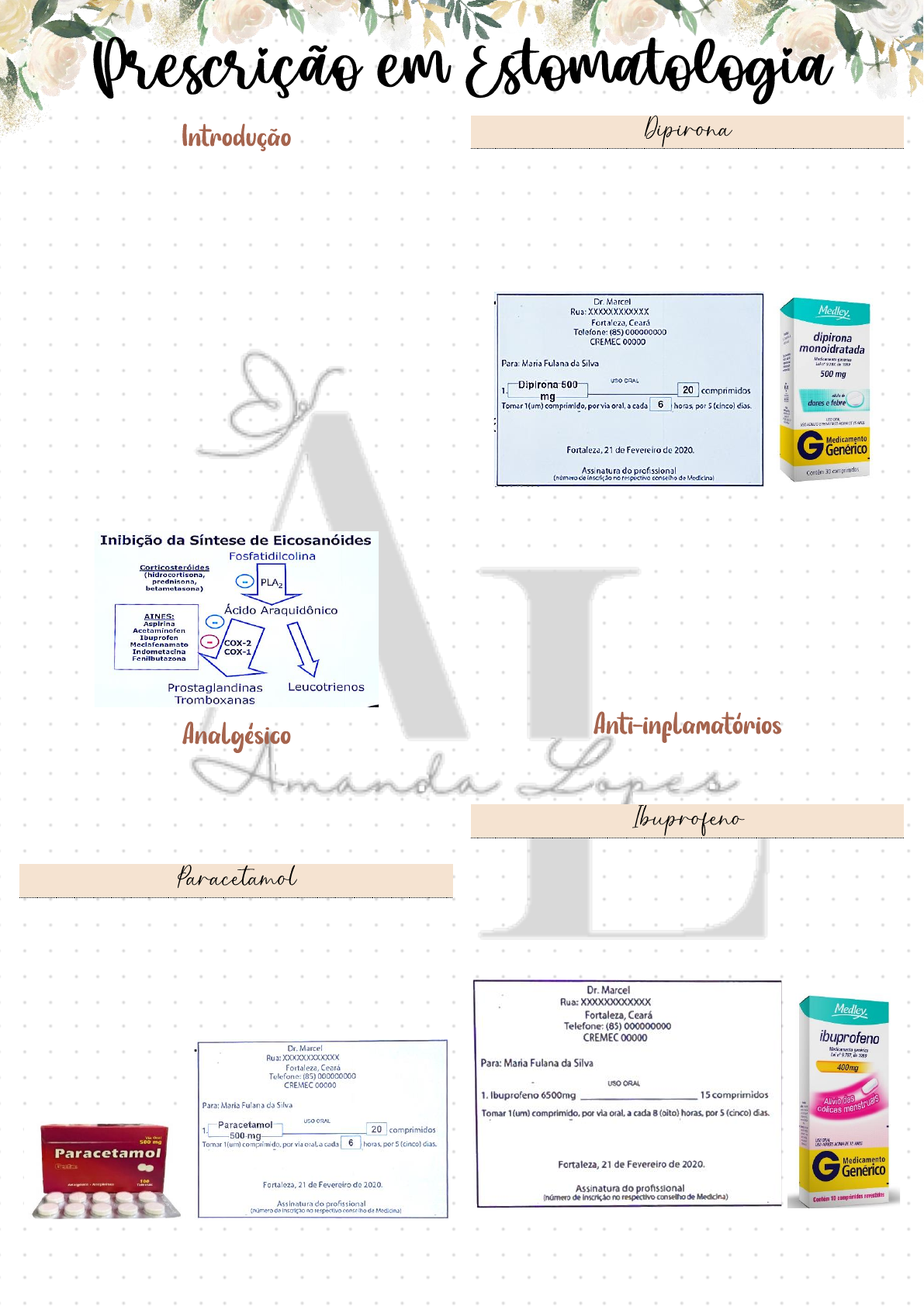 Maria Amanda Lopes - Os anti-inflamatórios apresentam propriedades analgésica, antitérmica, anti-inflamatória e antitrombótica, por inibirem o sistema de isoenzimas denominadas ciclooxigenase constitutiva (COX-1) e induzível (COX-2), que convertem ácido araquidônico em prostaglandinas, tromboxanos e prostaciclina - A COX-1, presente em sítios gástricos e renais, relacionada com produção de tromboxano, é responsável pela síntese de prostaglandinas, que exercem proteção tecidual nessas áreas. - A COX-2 expressa-se nos locais de inflamação. - Inibição exclusiva de cox2 (tem a ver com mediadores inflamatórios), essa família de medicamentos os dentistas não prescreve – Coxibe Responsáveis pelo bloqueio das substancias (receptores sensoriais) do corpo que enviam mensagem ao cérebro em resposta inflamatória ao dano tecidual que resulta em produção de dor. • 500mg ou 750mg – 6/6h (até 4/4H) • Em gotas: 200mg/ml – 1 gota/kg (até 35 gotas) • Para bebê: 100mg/ml • Receituário branco Evitar: hepatotoxicidade, alergias • 500mg a 1g • Em gotas: 500mg/ml • Infantil: 50mg/ml – 6/6h Deve ter maior atenção em pacientes alérgicos, não se deve prescrever Qual medicação prescrever após realização de biópsia em tecido ósseo? Ocorre maior risco de inflamação Corticoides Anti-inflamatórios: mais prescrito é a nimesulida (deixou de ser vendida em alguns lugares por ser pato tóxica), não é a melhor escolha para pacientes que já possuem problemas prévios Medicamentos que impedem ou amenizam as reações e sintomas da inflamação. É antipirético e analgésico • Solução analgésica: 400mg • Solução anti-inflamatória: 600mg • Em gotas: 100mg/ml a 50mg/ml – até 6/6h • 1/² gotas por kg Cuidado: com nefropata, hepatopatas e gestantes Maria Amanda Lopes Por um curto período de tempo não existe evidencias que podem ser prejudiciais. • 100mg – 12/12h por até 3 dias Cuidado: nefropata, hepatopatas e gestantes Qual medicação prescrever para pacientes com dor articular? Para caso de DTM inflamatória, dor ou edema: Meloxicam 7,5mg 2x ao dia - Não seletivo - Para DTM com dor (muscular/articular) ▪ Potássio (efeito mais rápido – cataflam) 50mg 12/12h ▪ Sódico (efeito mais longo – voltarem) 50/75mg - Atravessar a capsula articular, bom para distensões e para casos de luxamento MIOSAN: 10mg de 12/12h MIOSAN caf: 10mg/60mg – 1 comprimido de 12/12h Qual medicação para pacientes muito alérgicos? Usados para reduzir a inflamação ou atividade do sistema imunológico do corpo. Eles alteram ação do hormônio cortisol, influenciando no funcionamento de células da pele, tecido gorduroso ou osso. Outras funções: - PROFILÁTICOS: • Para procedimentos duradouros • Edema pós operatório previsível - TERAPÊUTICO: • Efeitos farmacológicos analgésicos e anti- inflamatórios • Exodontia do 3M, DTMs e lesões de tecidos - IMUNOSSUPRESSOR: doenças autoimunes e tópicos - São usados quando há contraindicações de AINES e em caso de alergias – Em comprimidos de 5mg ou 20mg Em caso de alergias e doenças autoimunes POSOLOGIA: dose única diária (pela manhã) - Pode ser usado até 60mg diários distribuídos a cada 8 horas PREDNISOLONA – PARA CRIANÇAS Solução 3mg/mL POSOLOGIA: 2mg/kg/dia sendo a dose máxima. Podendo ser administrado de 3 a 4 vezes ao dia - Pomada bucal 1mg/g (bisnaga de 10mg) - Suspensão de 10, 20 ou 40 mg/mL Indicação: Uso tópico de aftas – 2 a 3x ao dia. Administração intralesional POSOLOGIA: 2 a 3x ao dia. - Orientar ao paciente que aplique sobre a lesão sob auxílio de um cotonete Comprimidos de 4mg, geralmente na odontologia POSOLOGIA: 4mg em dose única ou a cada 6h (máximo) Tem característica de ação prolongada, pode-se recorrer à dose única diária DEXAMETASONA ELIXIR É um bochecho de uso externo – 0,5mg/ 5mL Teste terapêutico para lesões autoimunes sugestivas, bochechar uma colher de sopa 4x ao dia Você não deve utilizar o MIOSAN CAF se tem: - Alergia a ciclobenzaprina - Glaucoma ou retenção urinária - Usando inibidores de monoaminoxidadese - Problemas cardíacos Maria Amanda Lopes Não deve usar laser em pacientes com potencial de malignidade. Para analgesia, aplica energia alta, o laser funciona como adjuvante Quais medicamentos após biopsia de lesões malignas ou em caso de intensa dor aguda? AINES: em processos agudos e crônico, analgésicos não-opioides, exerce efeito anti-inflamatório, analgesia de dor inflamatória e antipirético GLICOCORTICOIDES: potentes efeitos anti-inflamatórios, mas em uso crônico pode causar toxicidade DORES A NIVEL CENTRAL UTILIZA: opioides, antidepressivos e anticonvulsionantes Composto químico psicoativo capaz de produzir efeitos farmacológicos semelhantes aos do ópio. O primeiro opióide a ser isolado e sintetizado em laboratório foi a morfina, substância que pacientes com dores crônicas se acalmem e durmam. Prescrito para pacientes que realizaram biopsia de lesões potencialmente malignas. Opioides considerado fracos – Paracetamol 500mg + Codeína (7,5/30mg) - Prescrita em receita branca especial. Até de 4 em 4 horas - Em caso de dor intensa, como por dores pós- operatórios, traumatismos graves, neoplasias) - Recomendam-se 2 comprimidos a cada 6 horas - Não ultrapassar o máximo de 8 comprimidos de Tylex® 7,5 mg ou Tylex® 30 mg em um período de 24 horas. – Diclofenaco 50mg + Codeína 50mg - Máximo 3 vezes ao dia. Não deve ultrapassar - Em caso de dor crônica, os opioides pode não ter efeito - Feito em receita branca especial Indicado para tratamento a curto prazo: • Dor forte causada pela inflamação das doenças degenerativas articulares (p. ex.: gonartrose); • Dor intensa e muito intensa após intervenções cirúrgicas; • Dor tumoral, especialmente se os ossos forem afetados ou se houver edema inflamatório peritumoral. 200MG – 400MG - Em receituário branco especial - Inicia